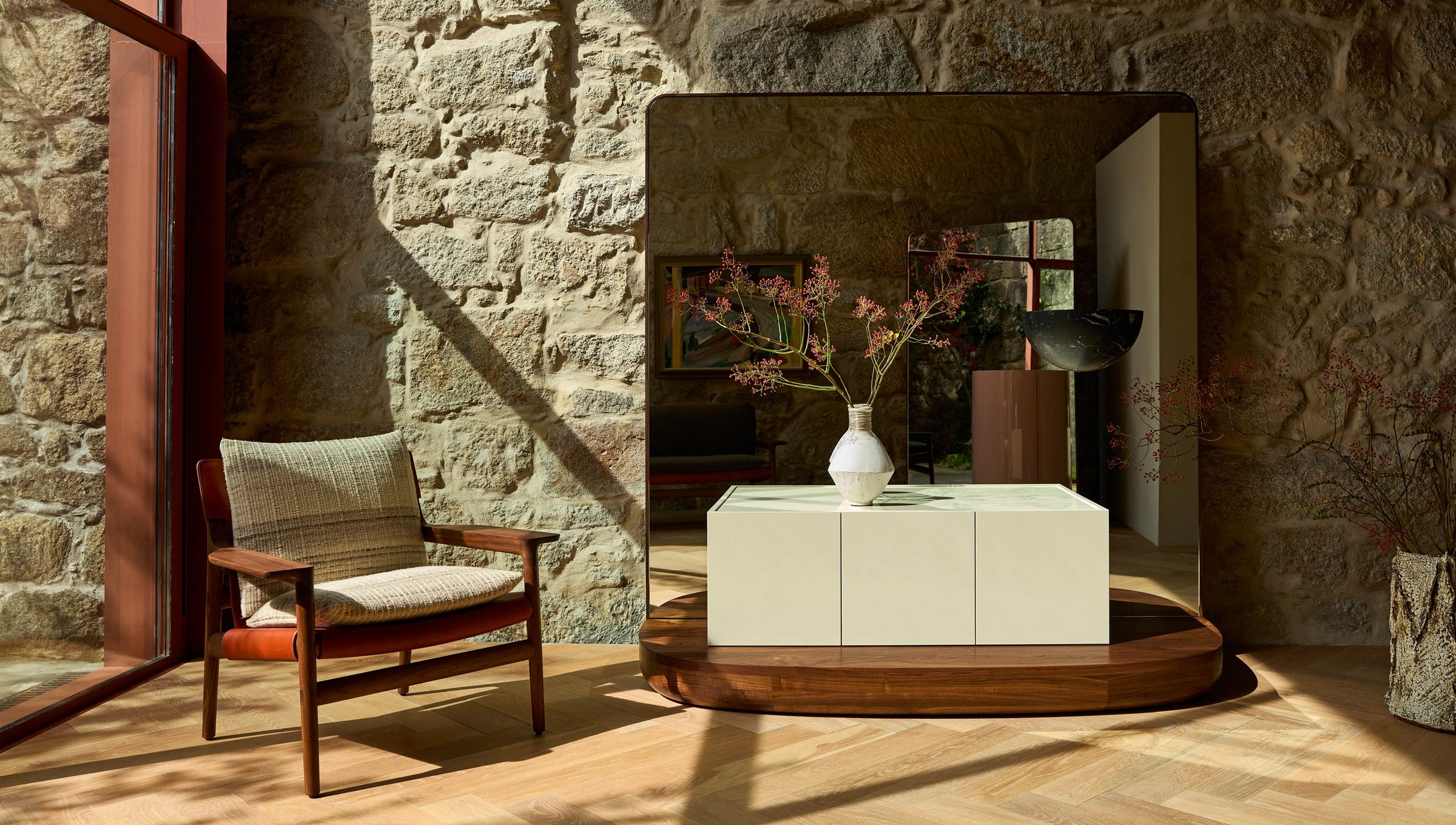 Select lounge chairs are available upholstered in Manta Lido, a traditional blanket from the Alentejo region of Portugal with an iconic Lido pattern. This very special textile is woven by hand from merino wool and available in a range of colourways.