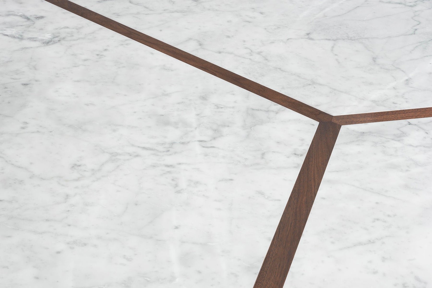 Marlon is a table with an understated form that highlights the beautiful contrast of materials. A timber frame supports a marble tabletop set upon slender legs in timber or marble for a table that is visually light yet extremely robust. Each table is formed from numerous segments, creating intriguing design details where the parts intersect.