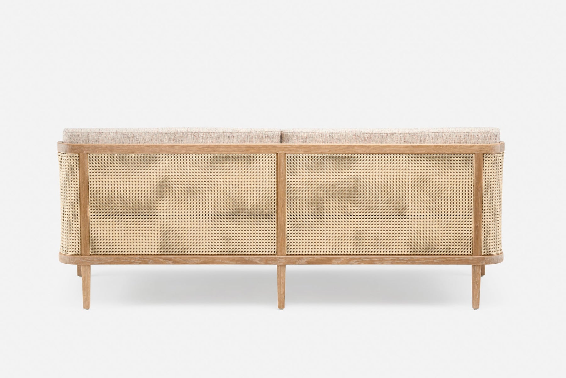 Available in black walnut, white oak, or ash in a range of finishes, and a range of fabric and leather options. Rattan backrest. The rattan finish varies according to the timber/finish chosen. See menus below for further material information.