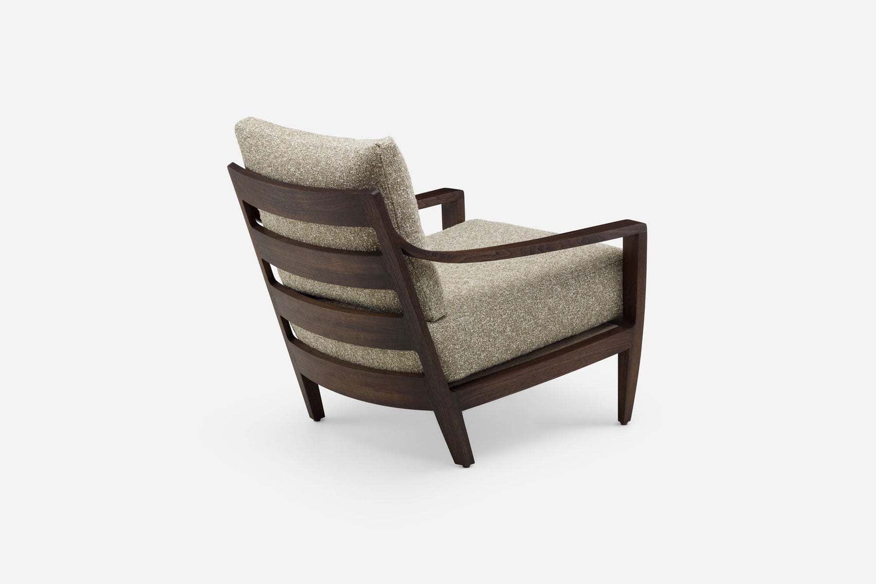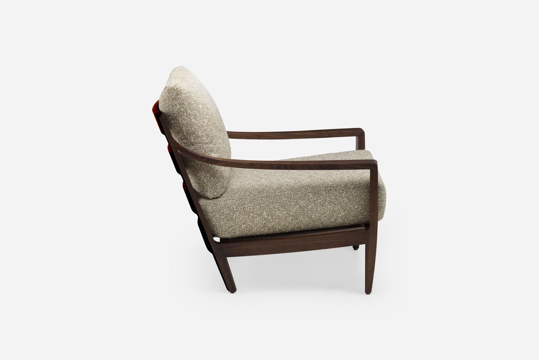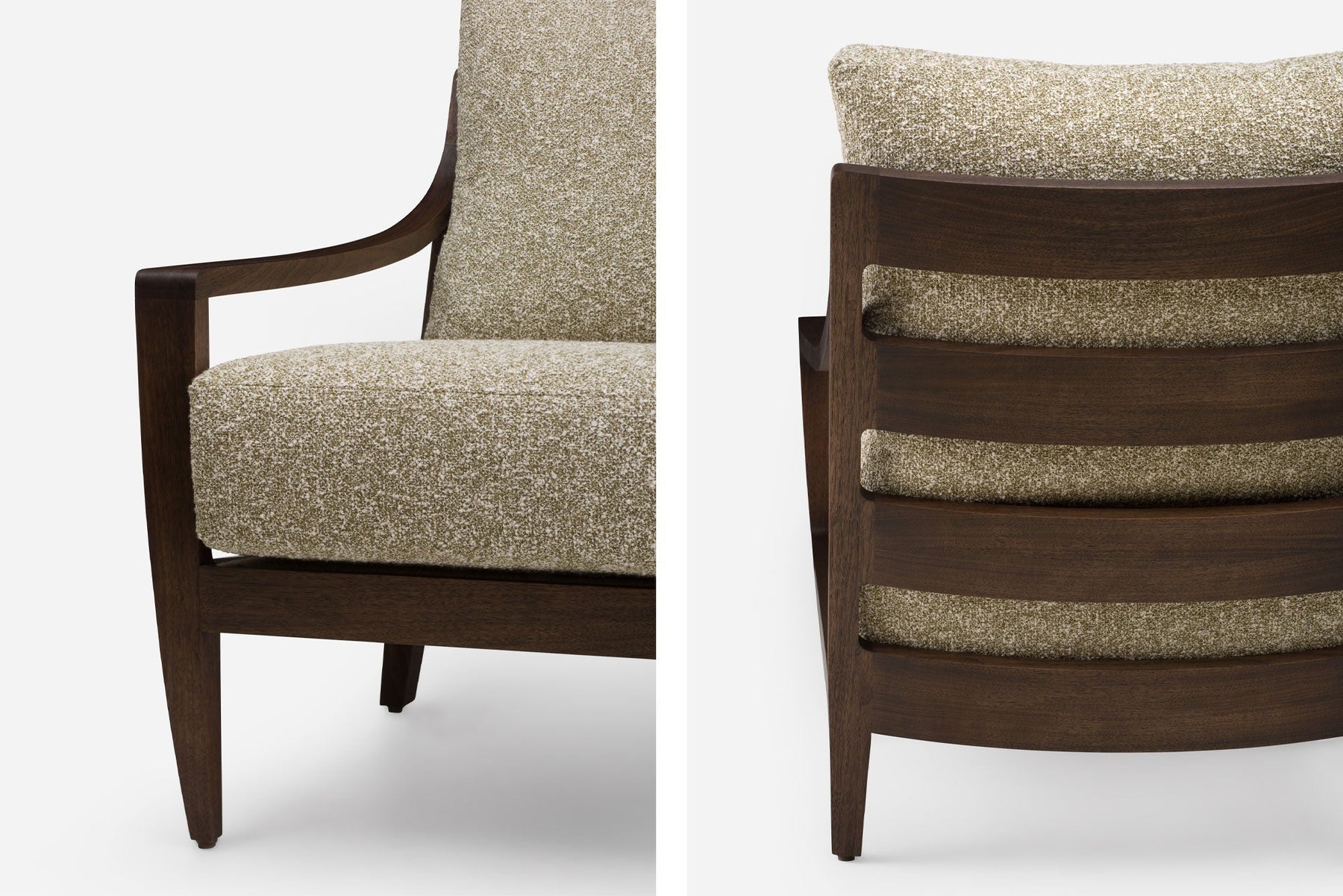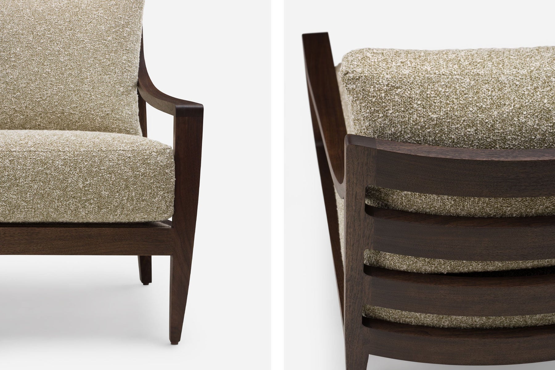 Available in black walnut, white oak, or ash in a range of finishes, and a range of fabric and leather options. See menus below for further material information.