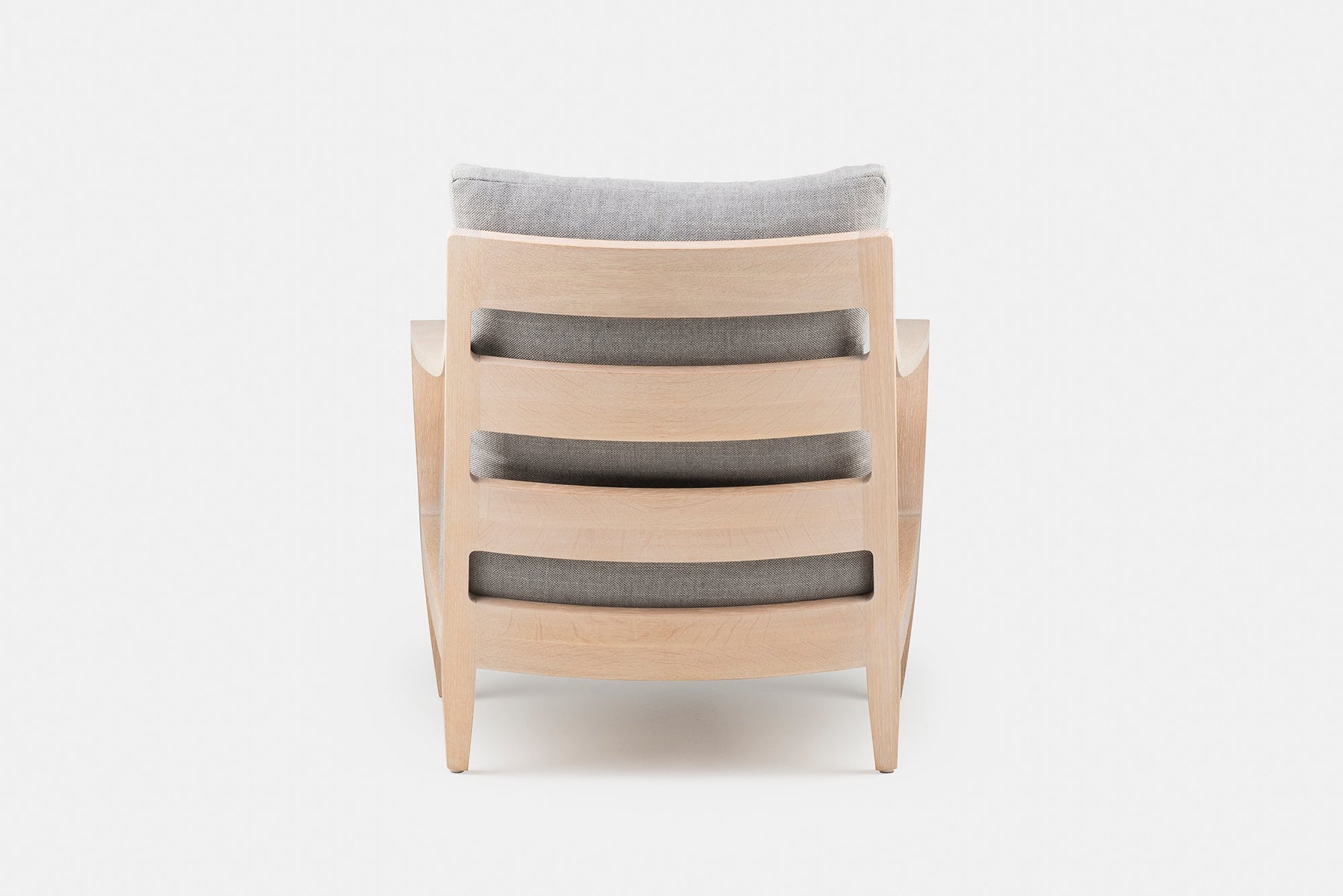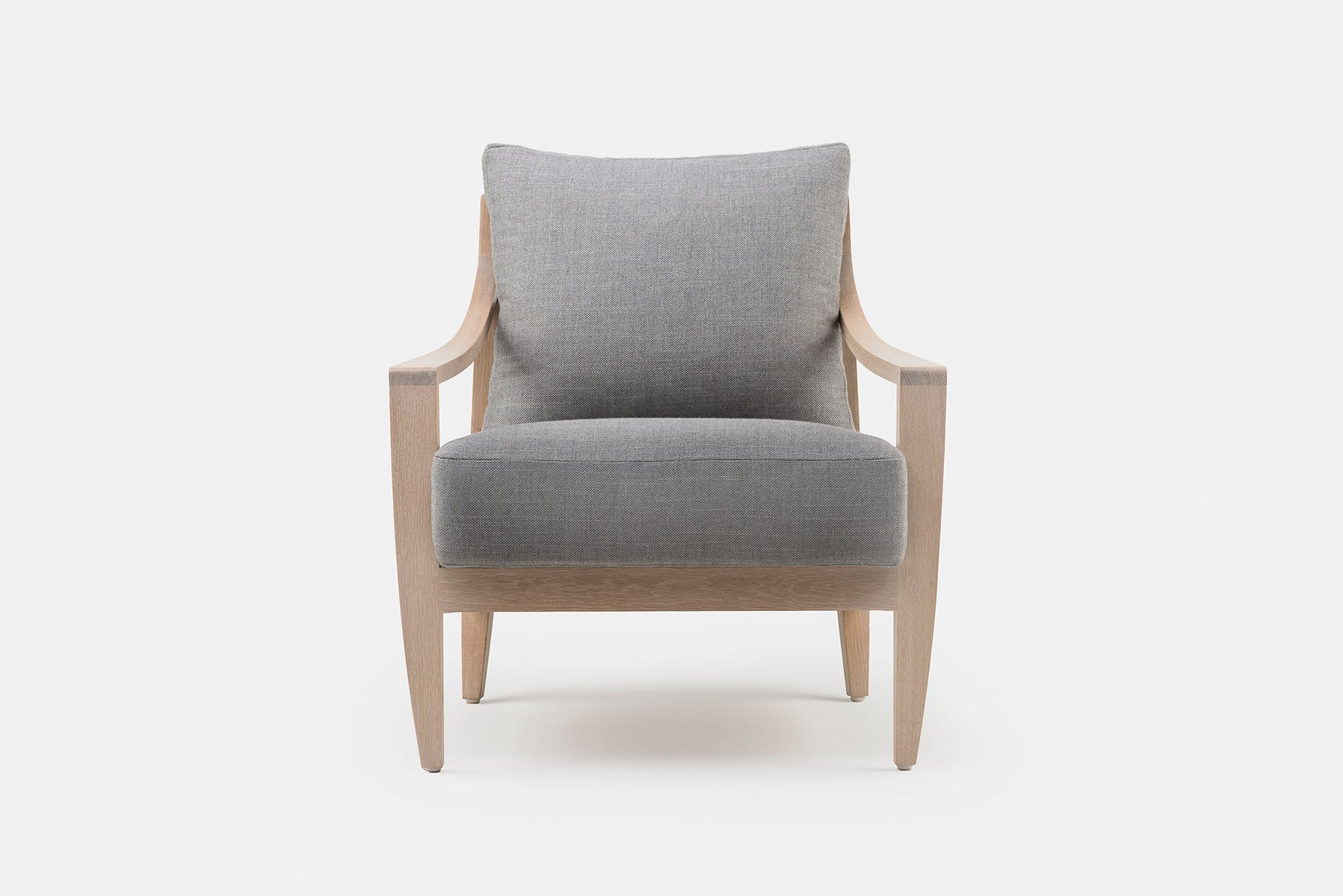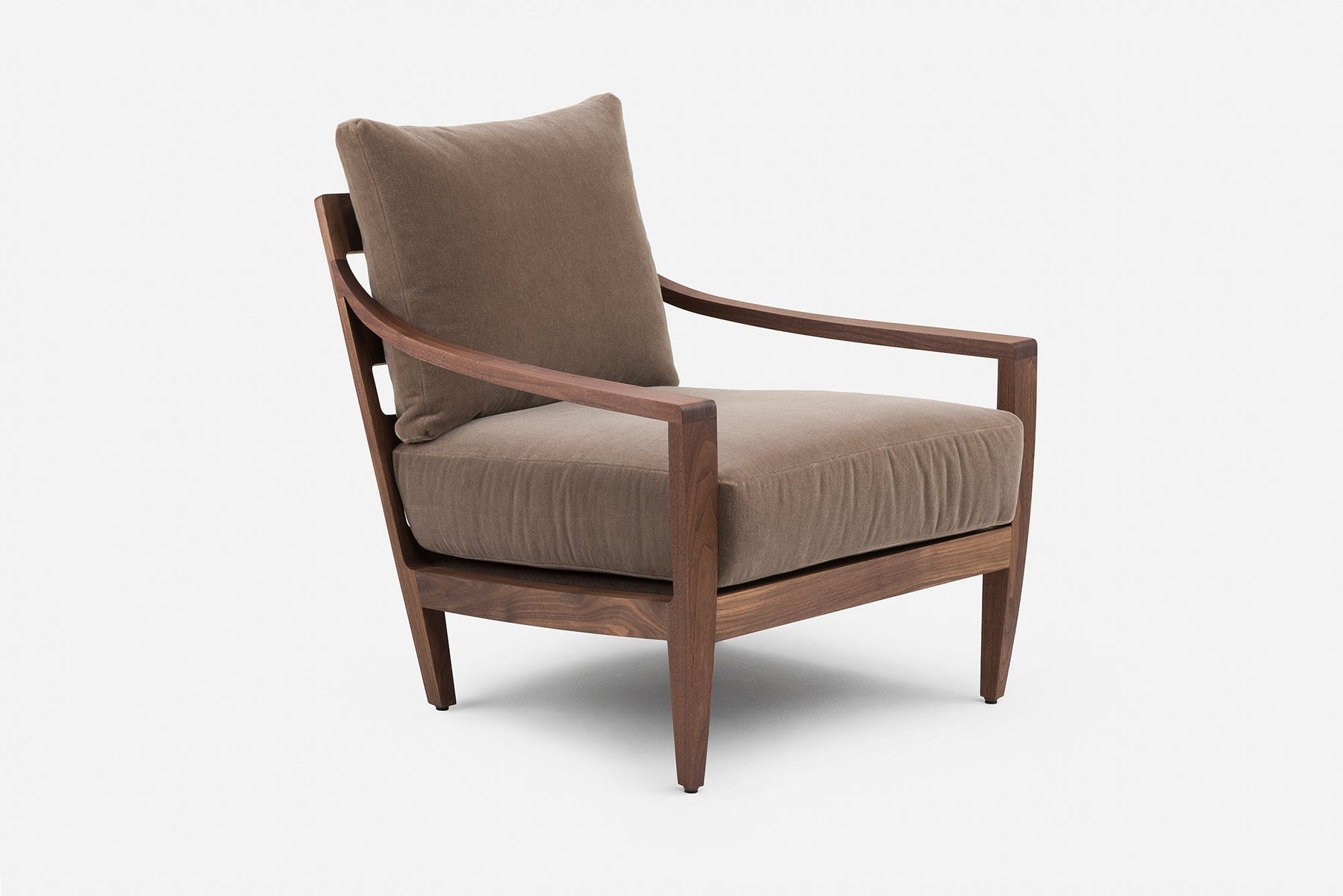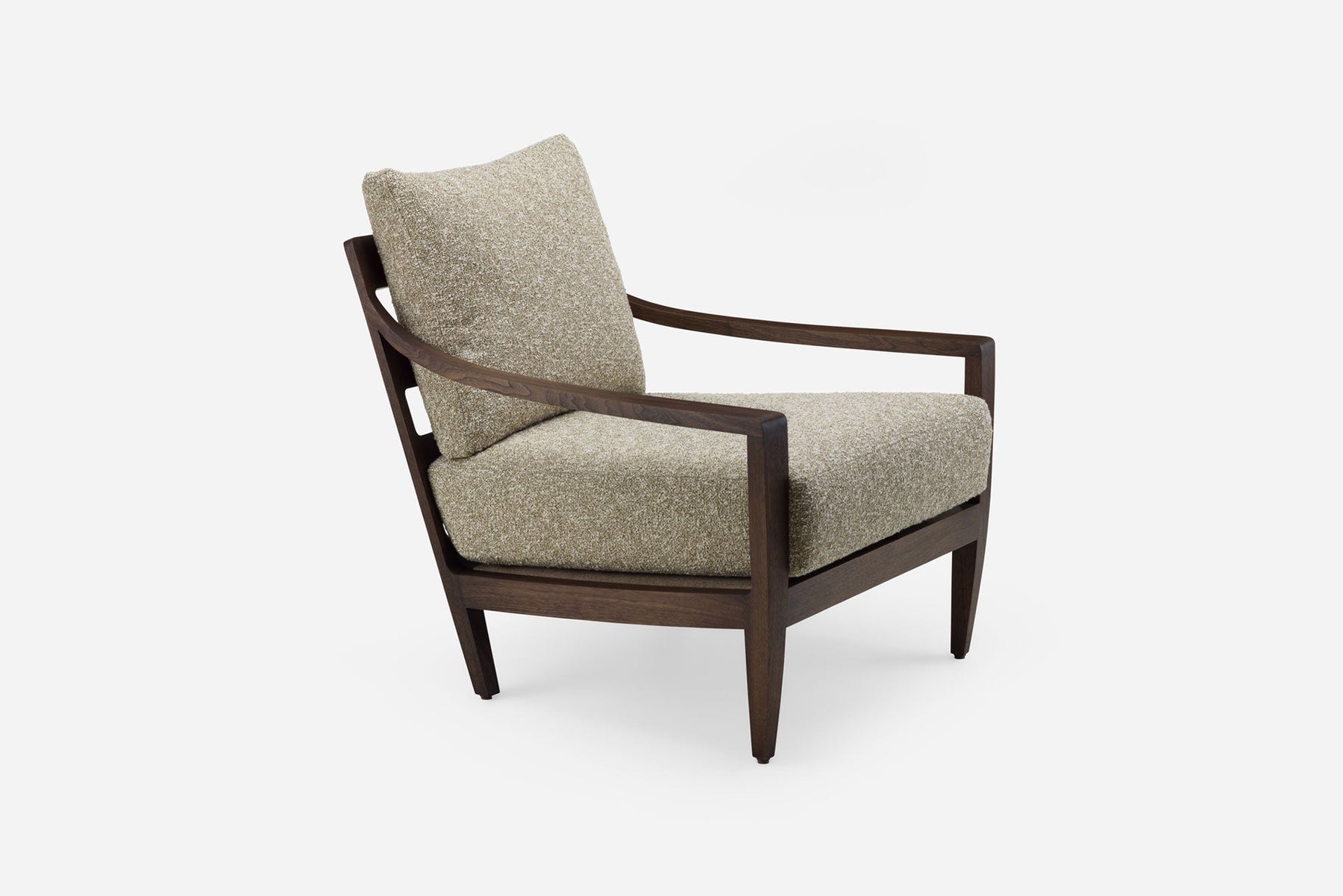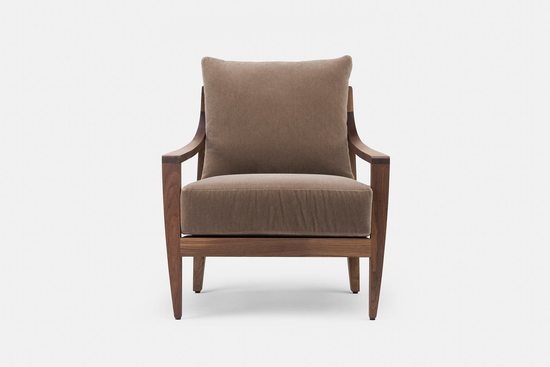 Available in black walnut, white oak, or ash in a range of finishes, and a range of fabric and leather options. See menus below for further material information.