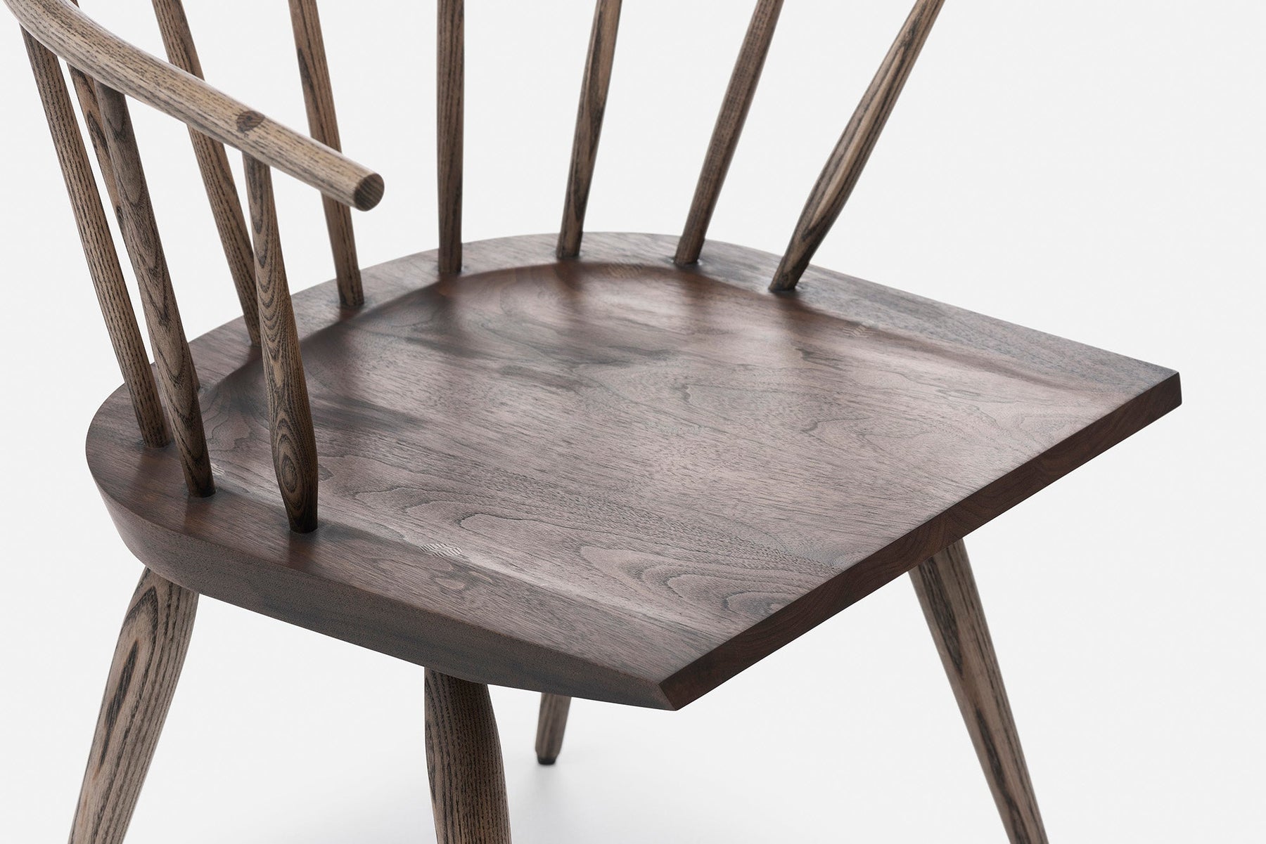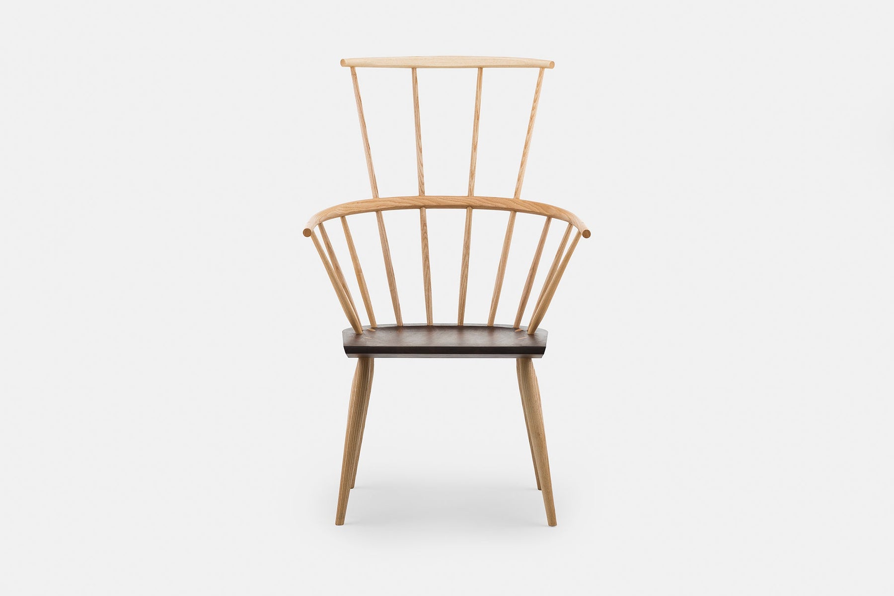 Kimble is a Windsor chair named after a neighbouring village of High Wycombe in Buckinghamshire, where the Windsor chair originated in the 18th century. The chair has a modernised, pared down form made using traditional Windsor chair making techniques in order to further the story, the evolution of the English Windsor chair. The contrast of the black walnut seat on this otherwise ash chair attractively highlights the wedge tenon detail where the leg intersects with the top of the seat. Part of a family of Windsor chairs including two dining chairs and two lounge chairs.