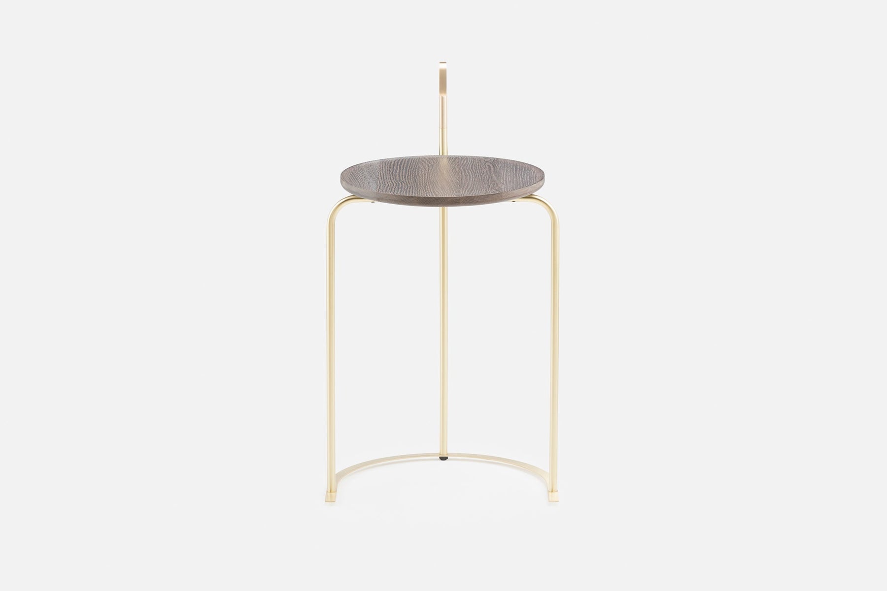 This small table was conceived as a highly flexible and portable object, something that can be moved around effortlessly and used in different situations—as a small work desk by the sofa or as a side table for a lounge chair. The lightweight brass frame supports a wooden top and extends upwards to form a handle.