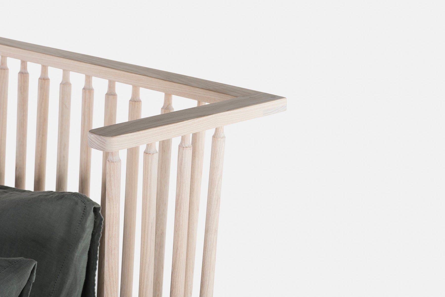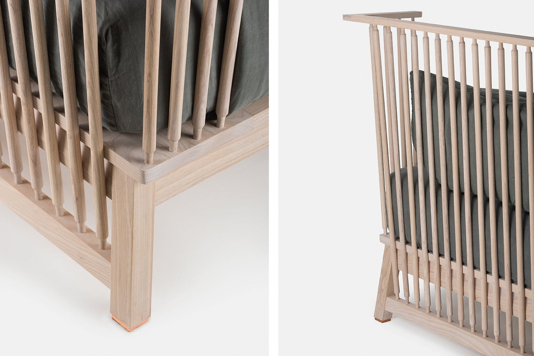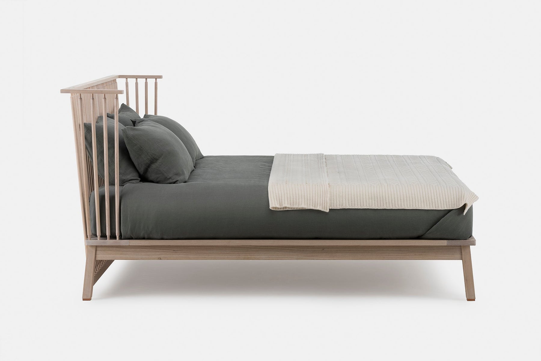 Companions Bed, made from solid wood with copper feet, is reassuringly familiar but carefully detailed. The wraparound headboard has a cocooning effect on the user, and also acts as an attractive room divider, making this bed suitable for use in the centre of a room.