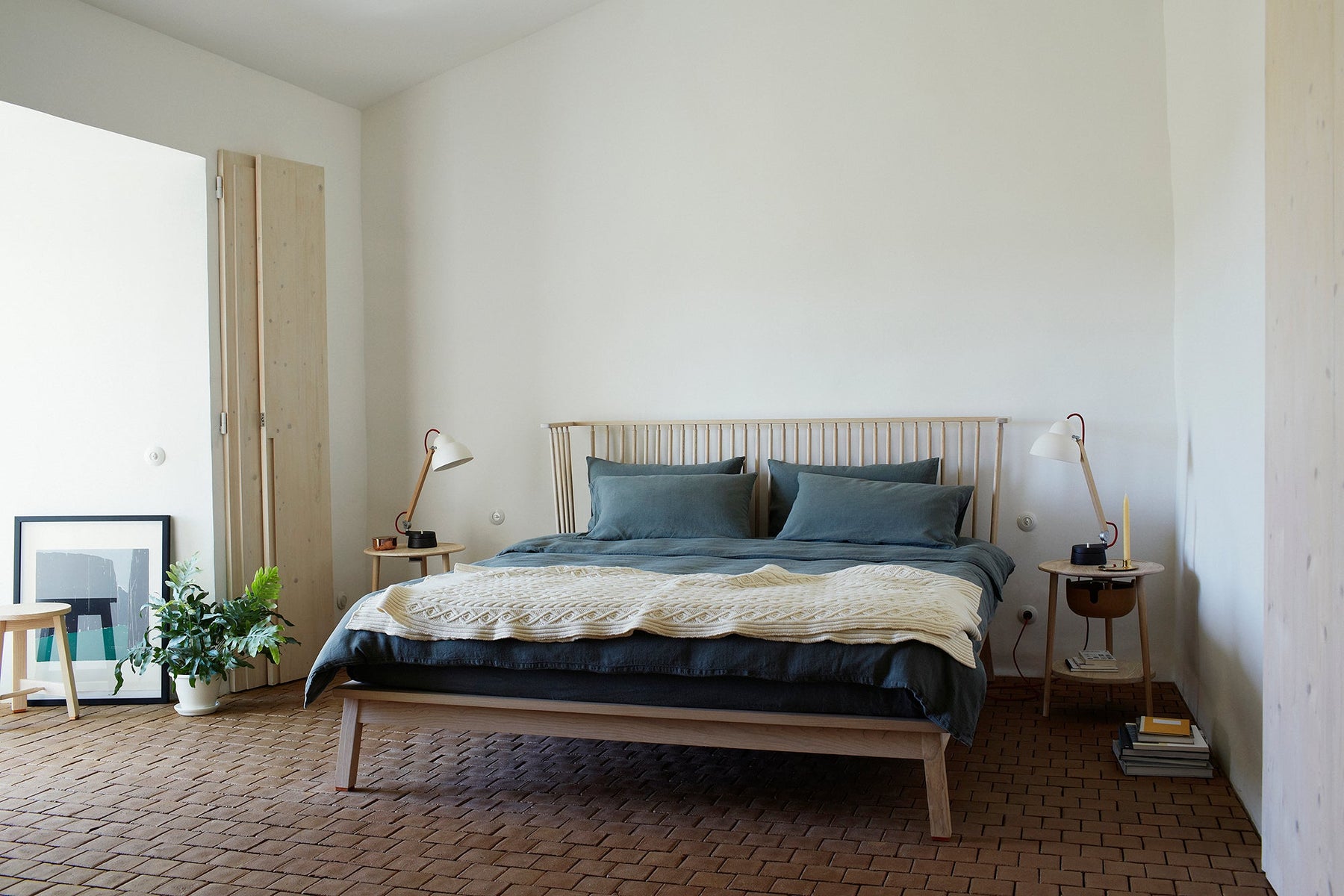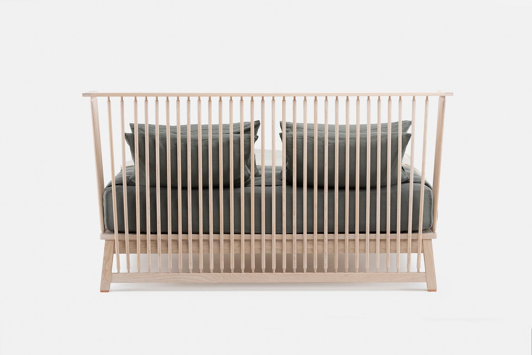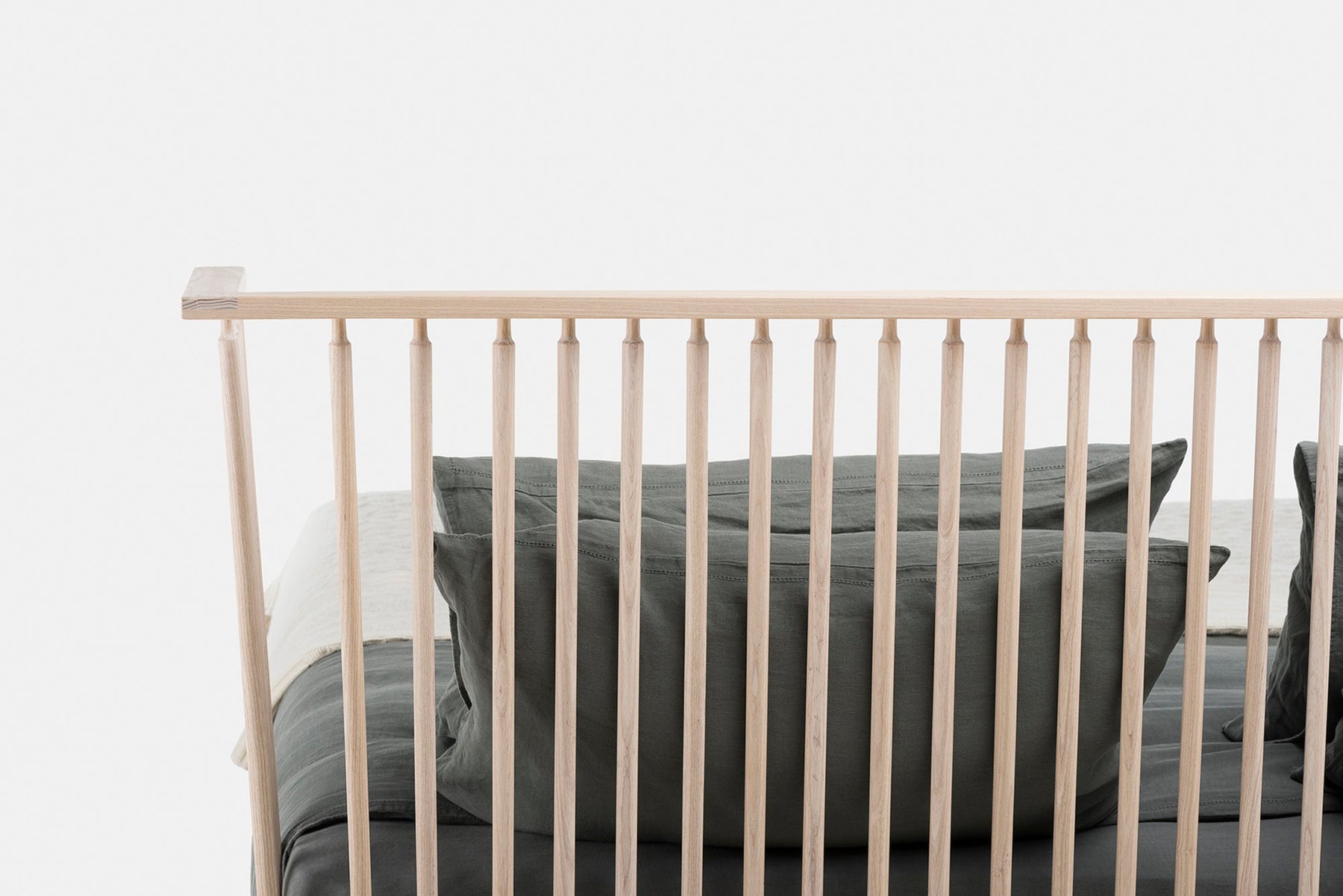 Companions Bed, made from solid wood with copper feet, is reassuringly familiar but carefully detailed. The wraparound headboard has a cocooning effect on the user, and also acts as an attractive room divider, making this bed suitable for use in the centre of a room.