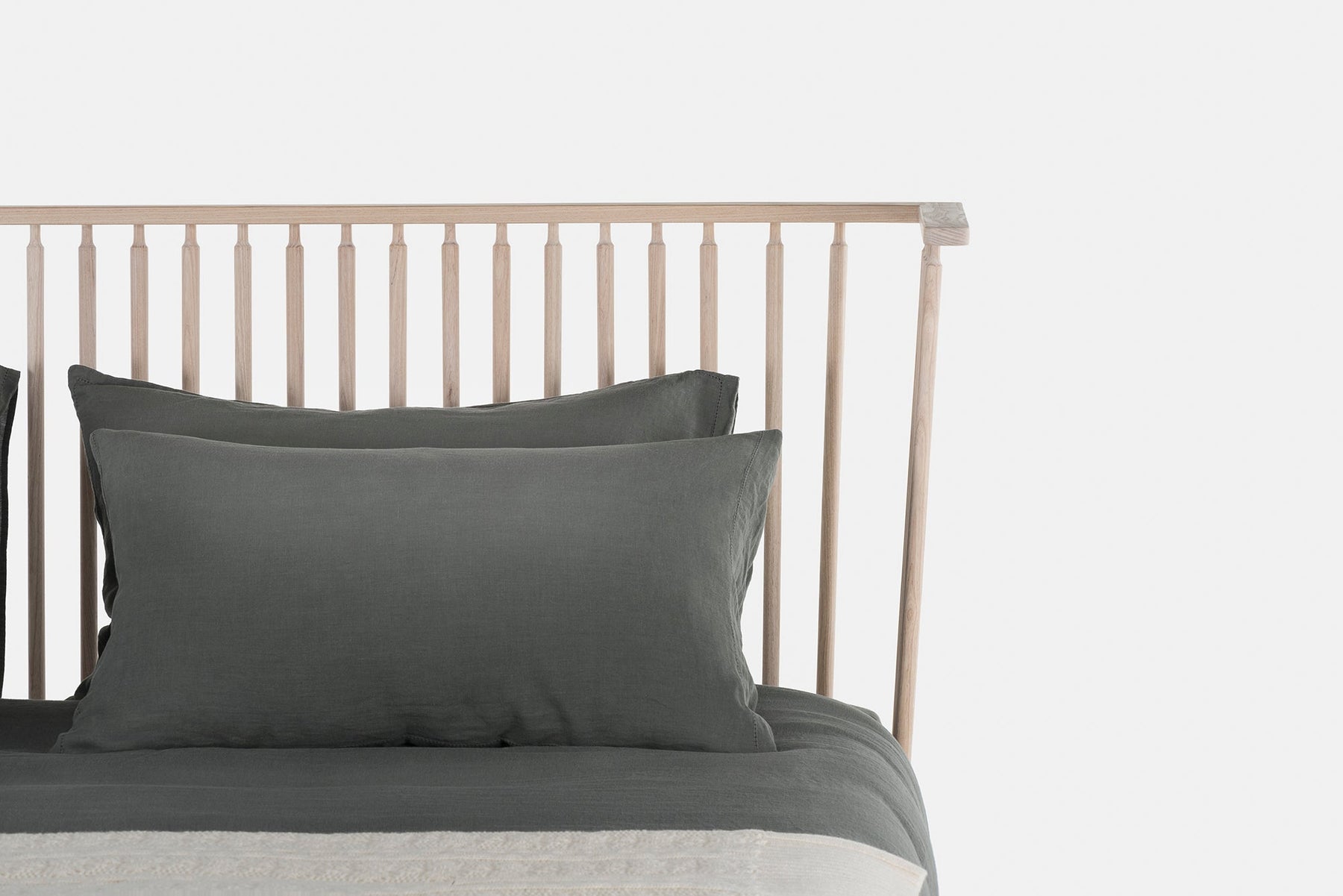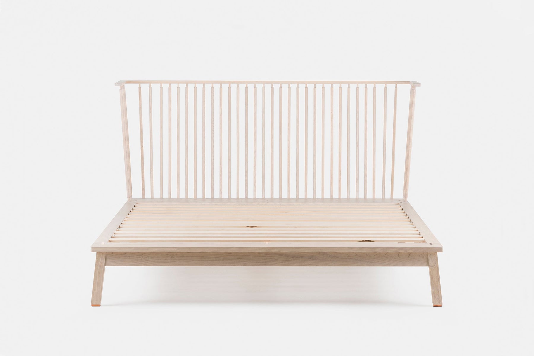 Available in black walnut, white oak, or ash in a range of finishes. Copper feet. Bed base consists of several individual timber slats, set approximately 5cm (2") apart. See menus below for further material information.