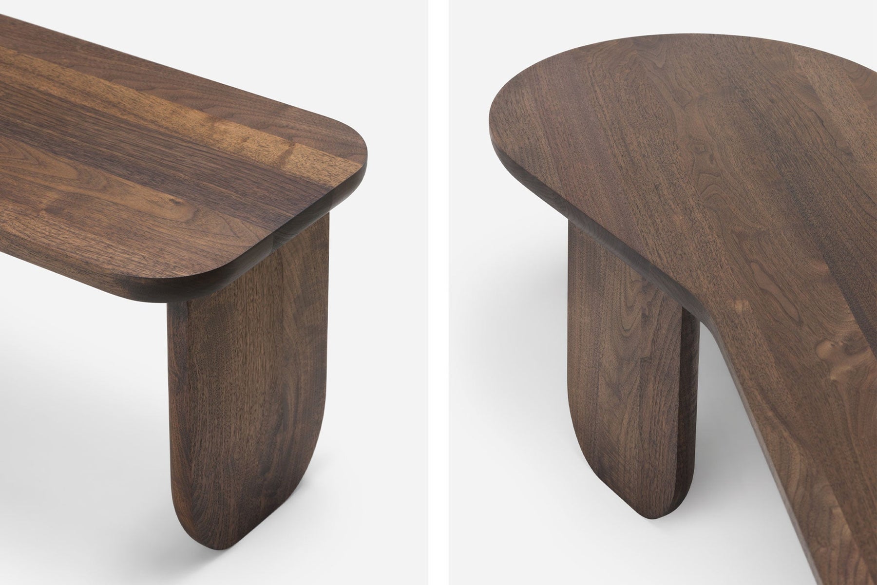 Kim Bench, crafted in solid wood, has an elegant yet expressive form that reimagines the design language of 1950s American furniture. This multi-functional piece, available in a left or right hand orientation, works well as a low bench, display shelf, or coffee table. Part of a family of nesting pieces including a coffee table and side table.