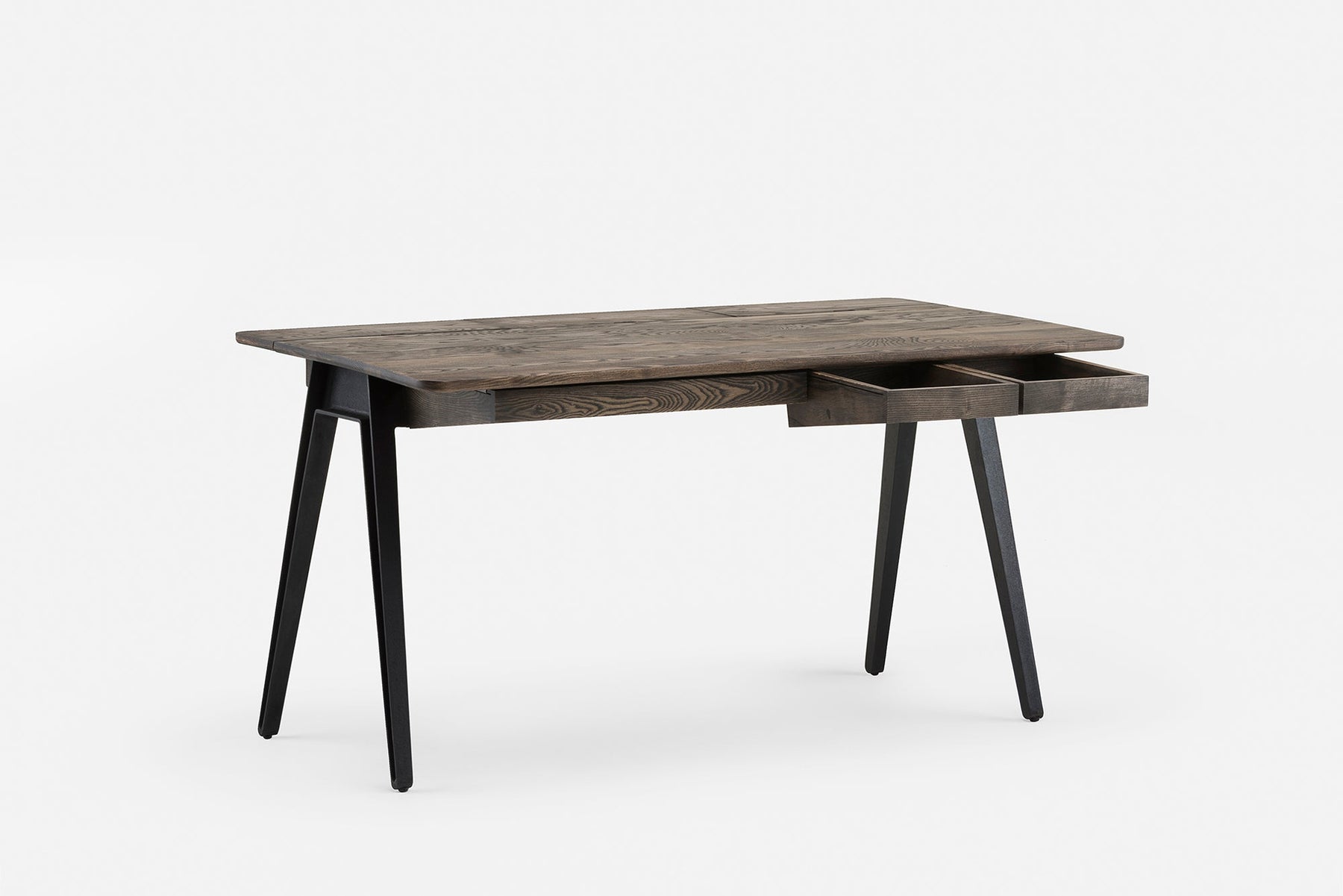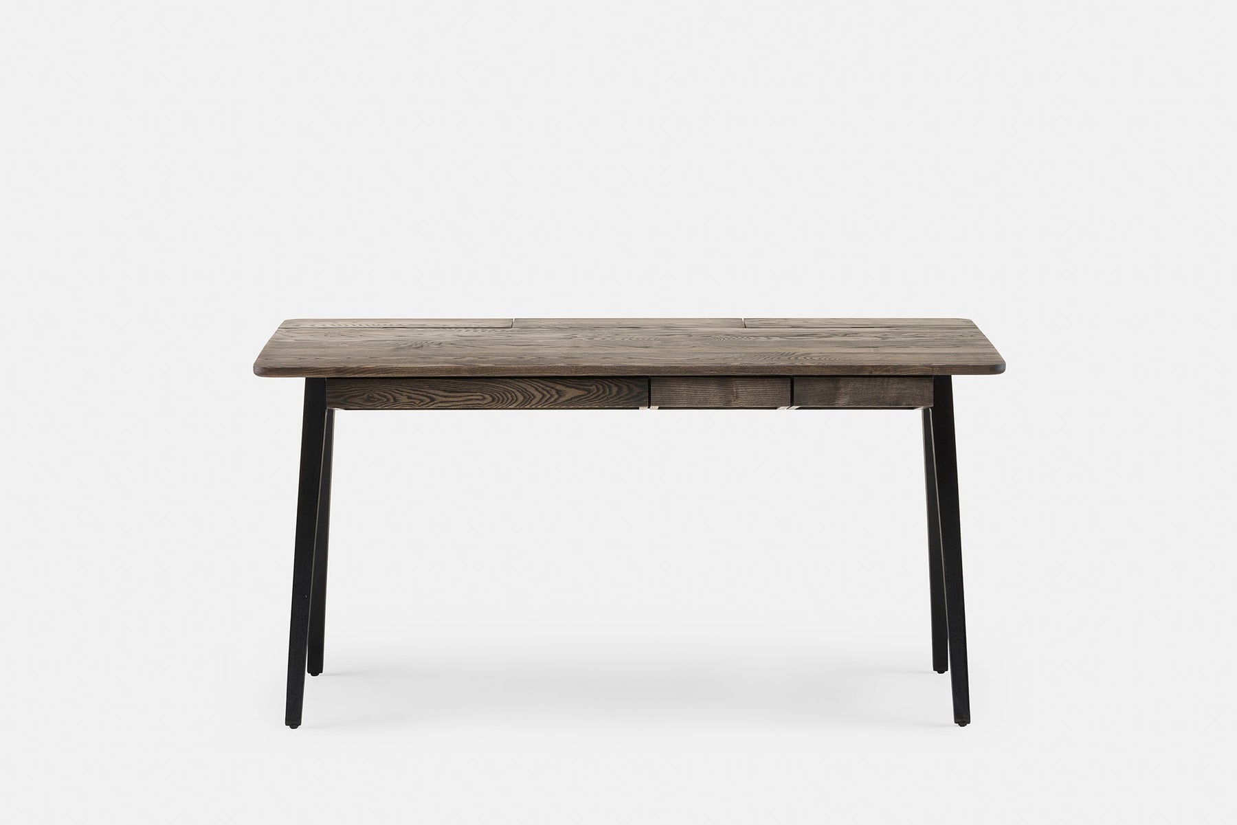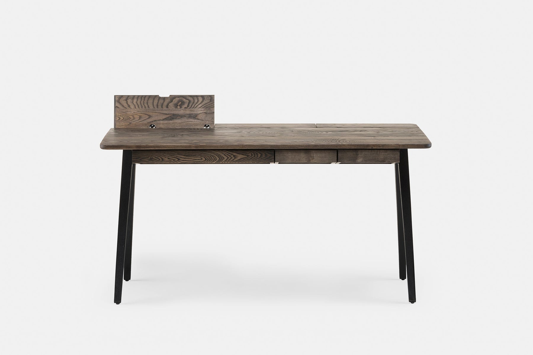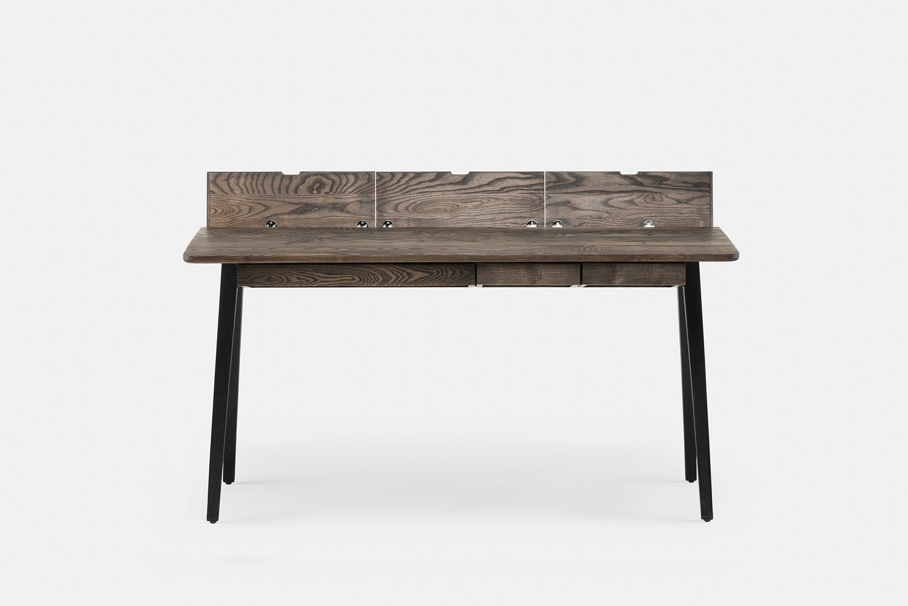 Orson desk, made in rich hardwood and cast iron, simply and quietly performs the task required, while remaining approachable and appealing to the senses. Three solid wood drawers provide ample storage, while three small compartments at the back of the desk provide an efficient and attractive cable management system. Accessories designed to complement the desk include two storage trays and a pencil holder which are available separately.