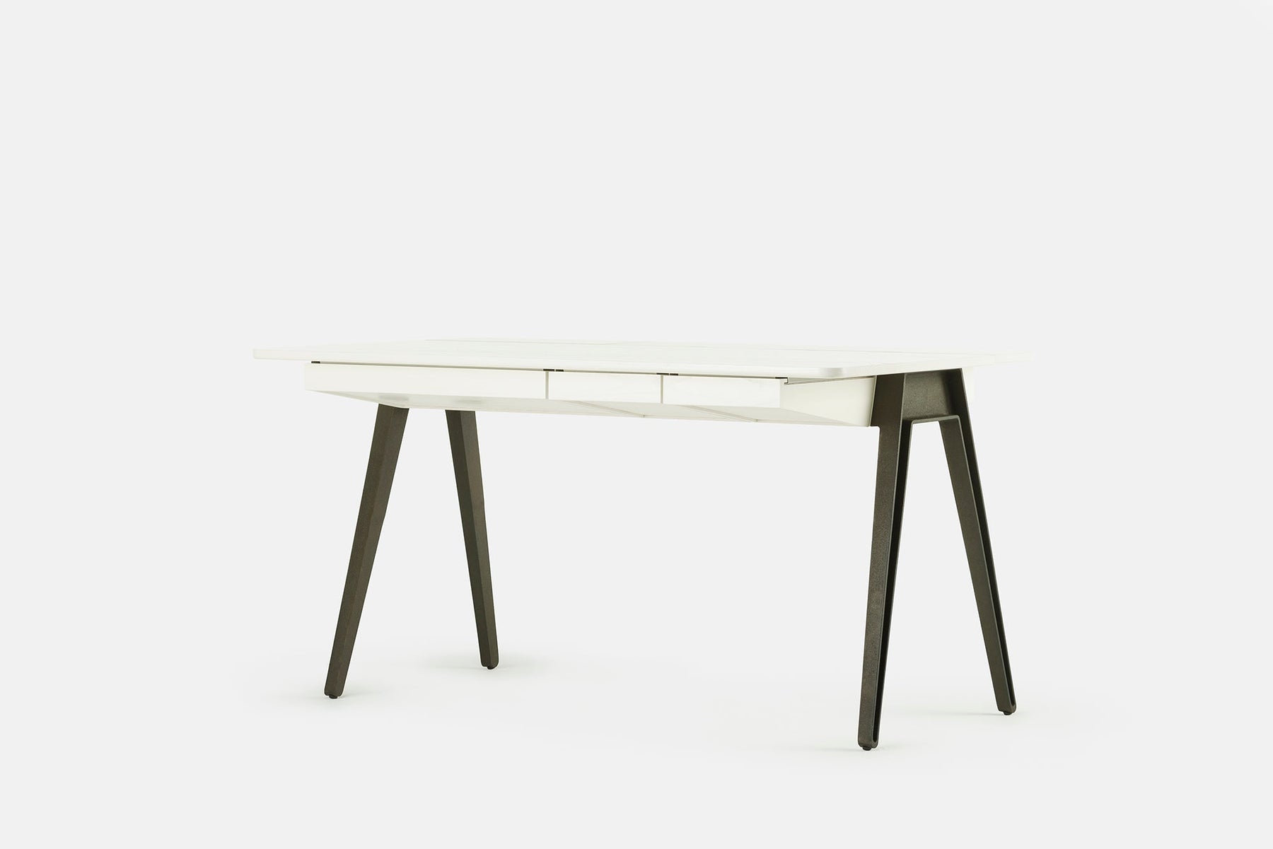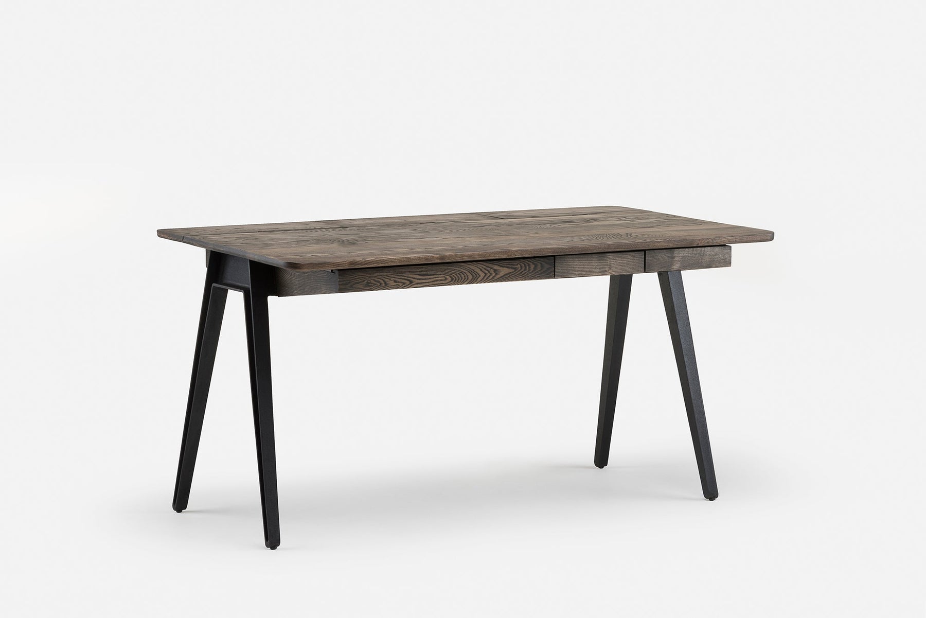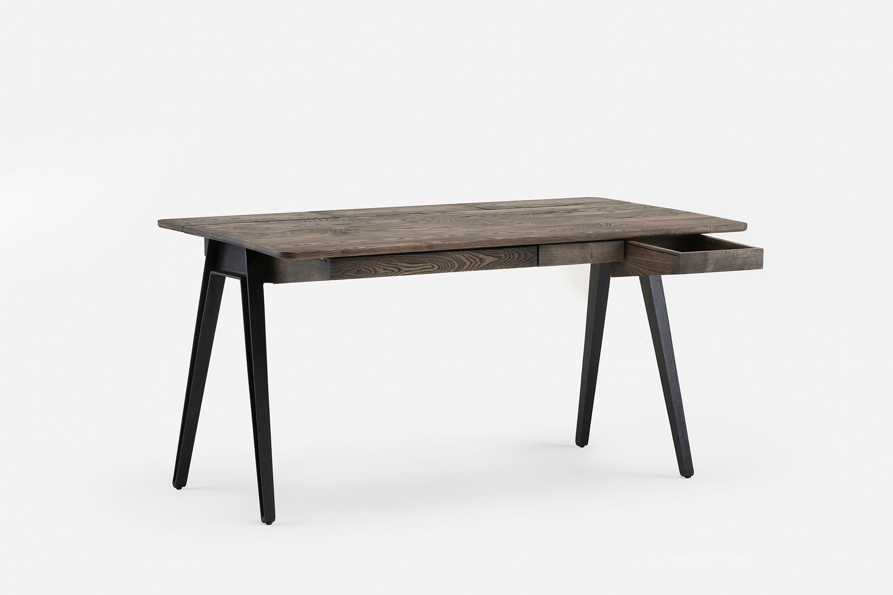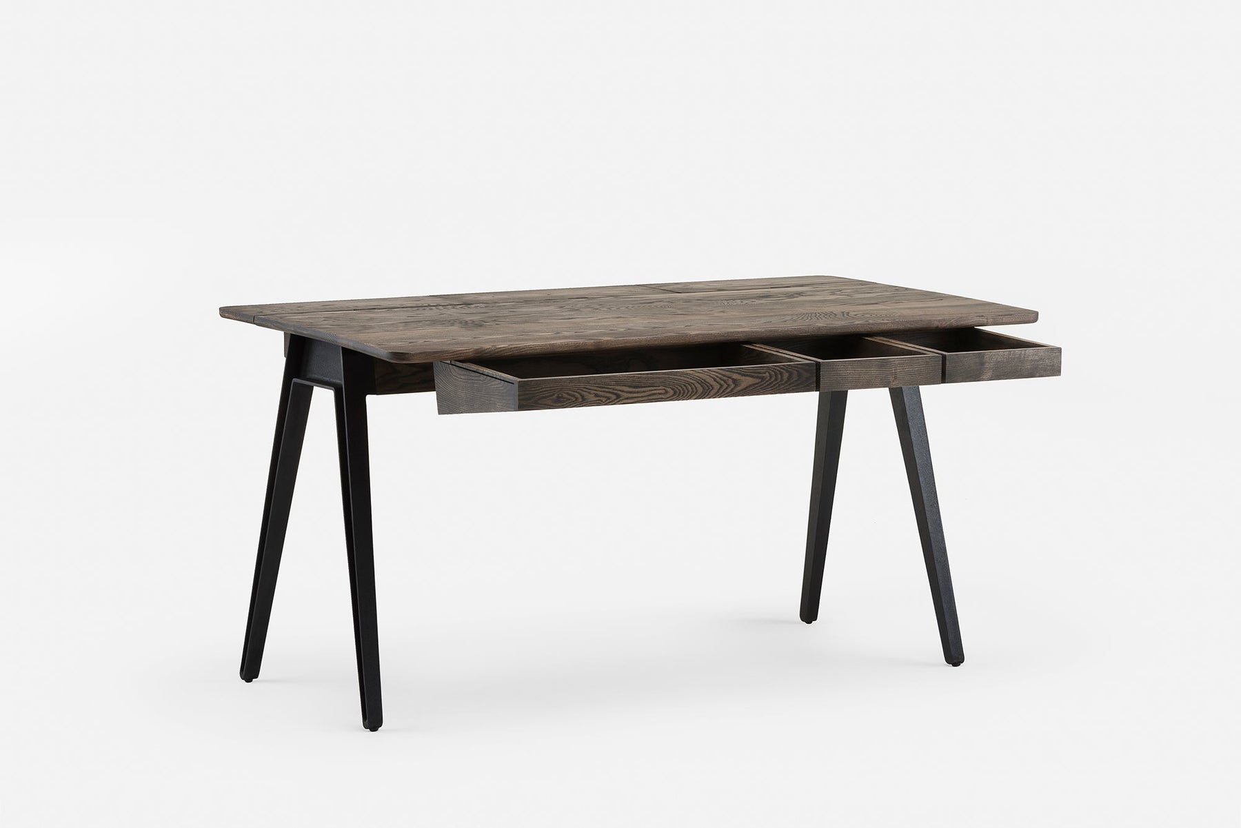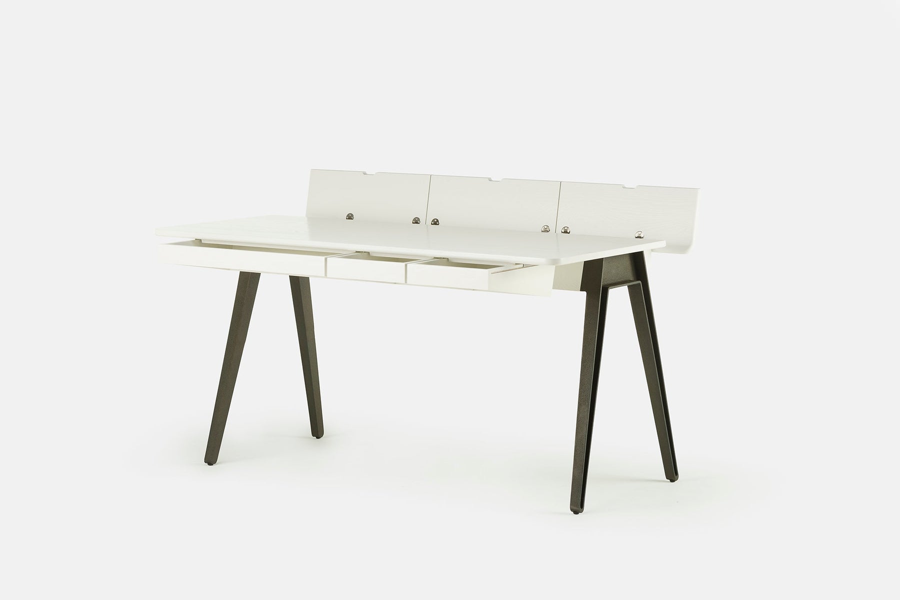 Orson desk, made in rich hardwood and cast iron, simply and quietly performs the task required, while remaining approachable and appealing to the senses. Three solid wood drawers provide ample storage, while three small compartments at the back of the desk provide an efficient and attractive cable management system. Accessories designed to complement the desk include two storage trays and a pencil holder which are available separately.
