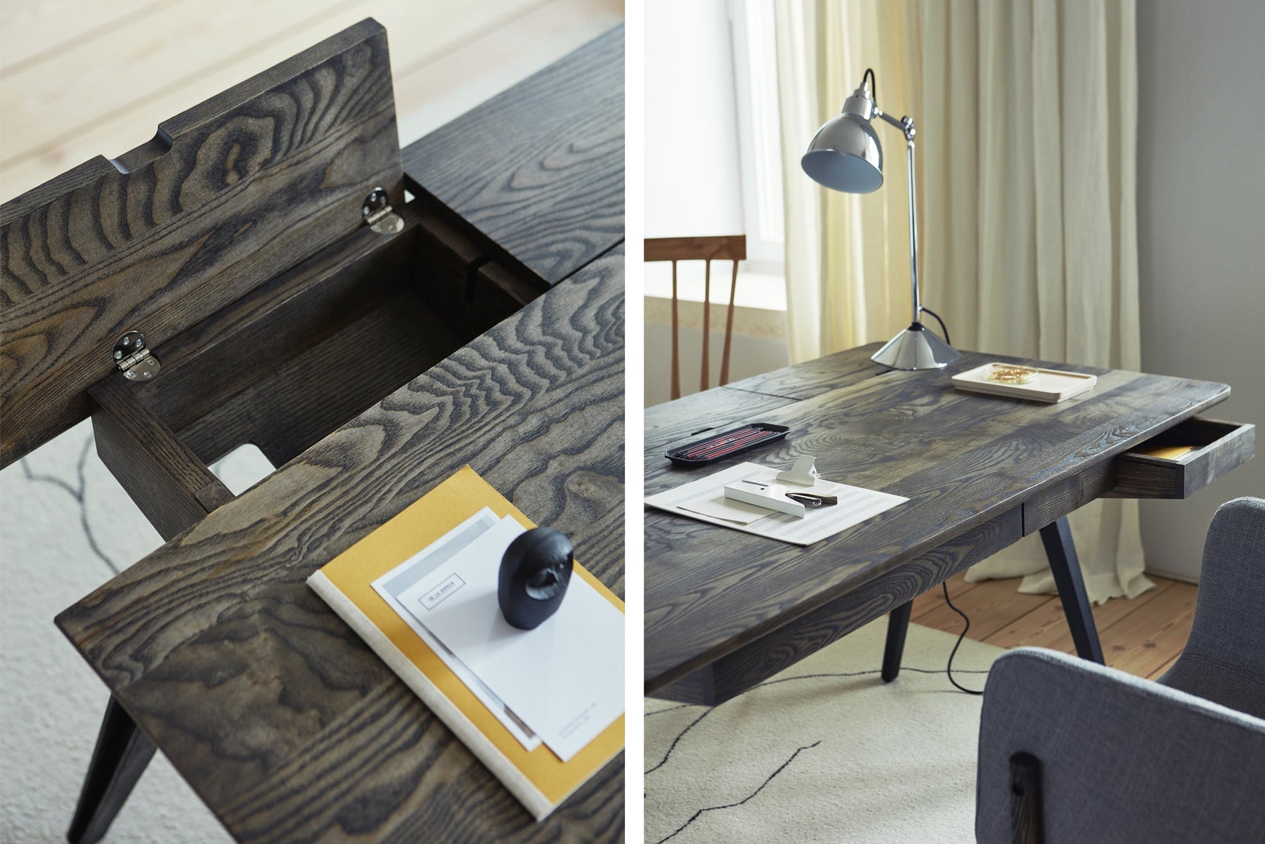 Timber is sustainable solid wood from North America or Europe, offering long-term repairability of the surface. Natural colour and grain variations in every plank make each piece an individual. Traditional wood joinery bonded with wood glue ensures structural integrity. All finishes are non-toxic and applied by hand, sprayed or rubbed.