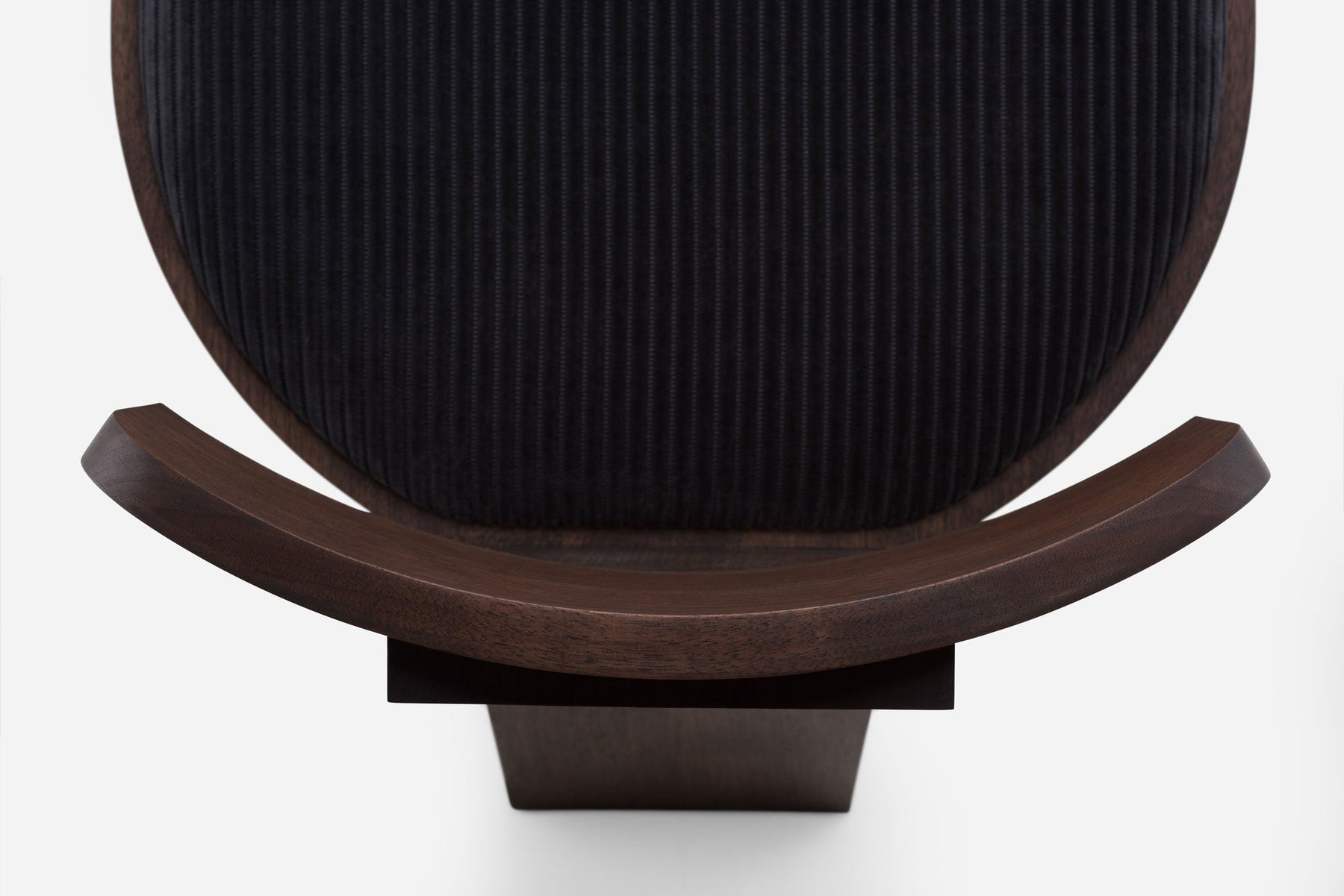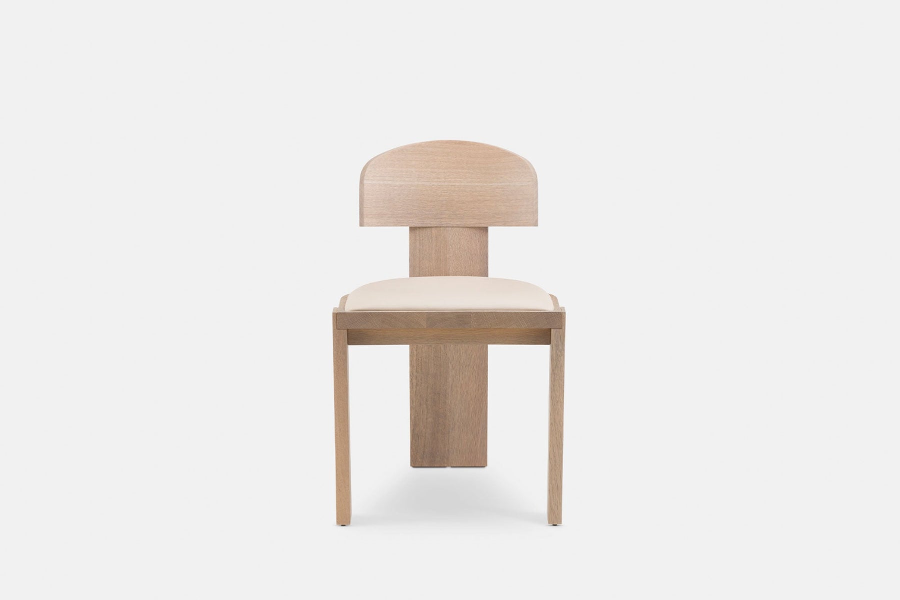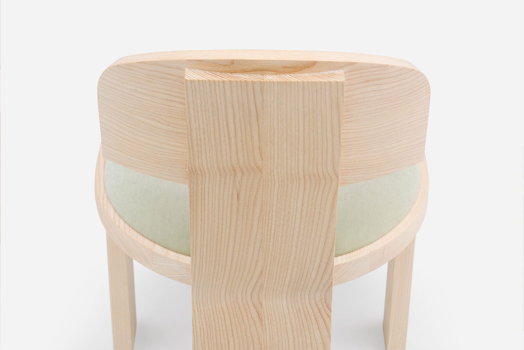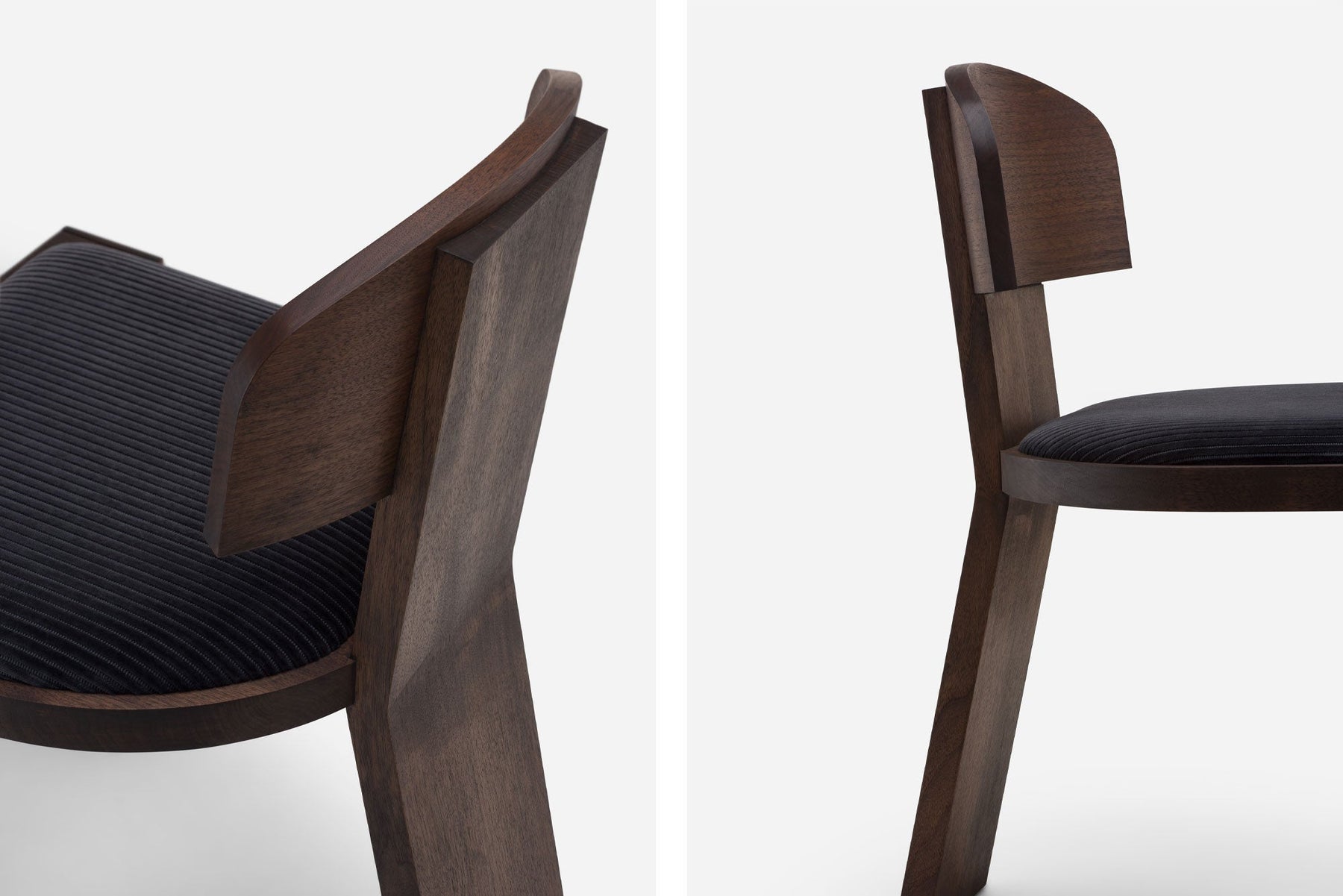 Vega chairs are named after the North Star of the Past and the Futures. Sculptural and totemic in shape, the three-legged chairs designed by Anthony Guerrée are crafted in solid timber and feature an upholstered seat. The imposing appearance contrasts with the delicate curve of the crescent moon backrest. In a playful game of opposites, Vega A and Vega B can be differentiated by the orientation of their backrests.