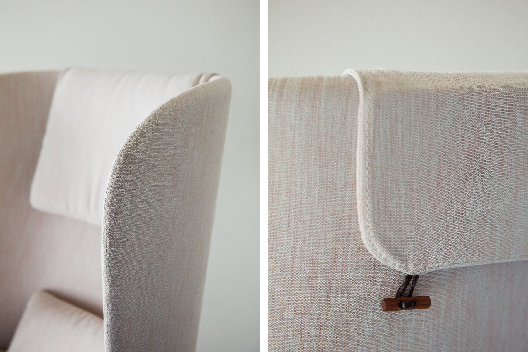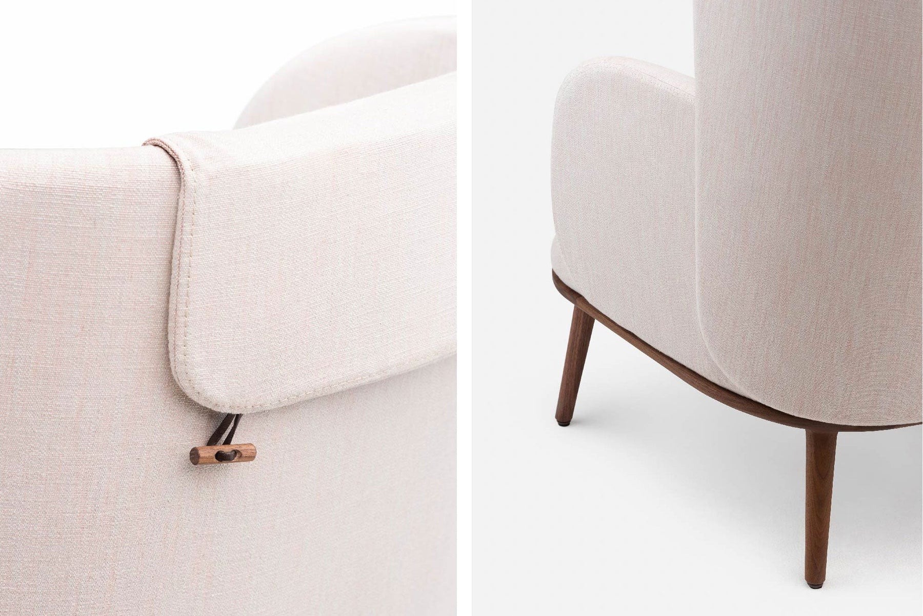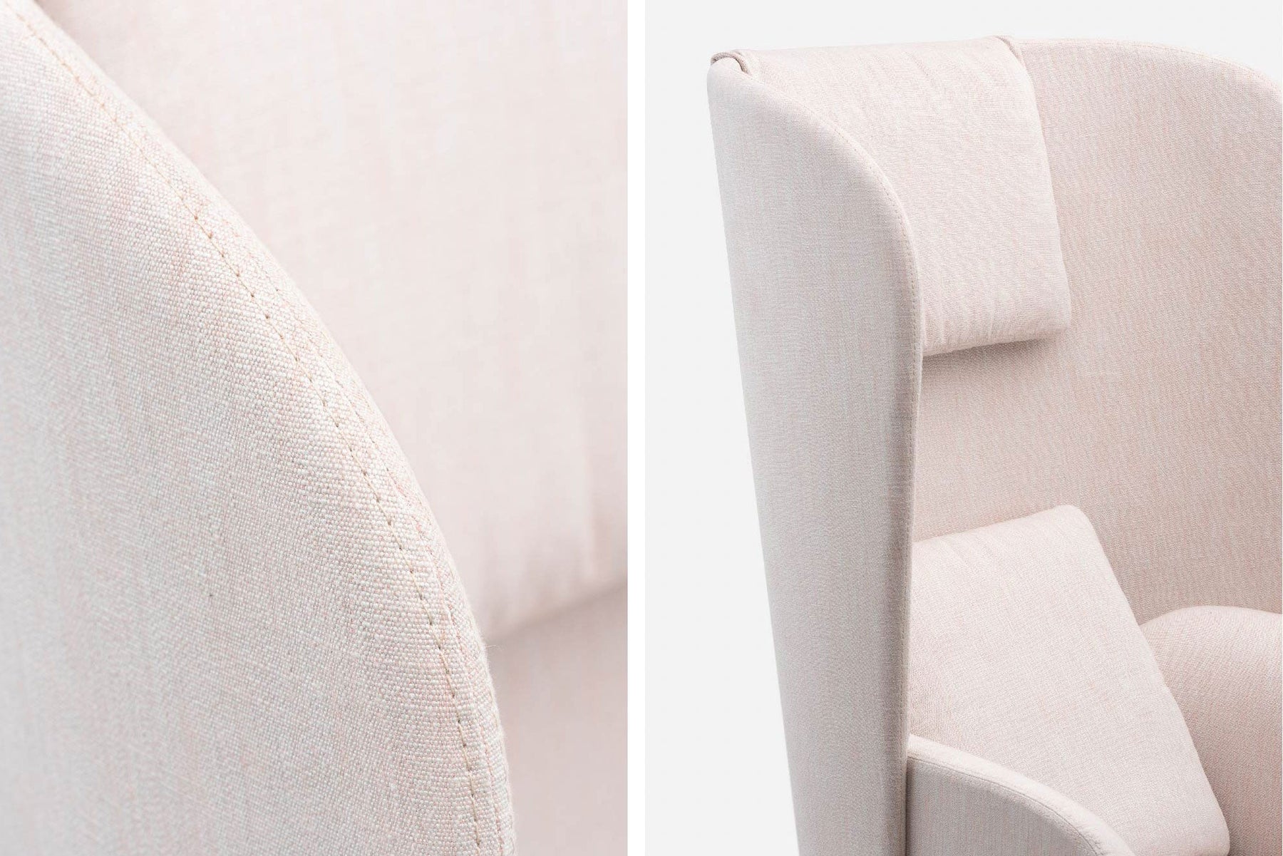 Blanche is an upright reading chair comprised of layers of upholstered shells, the wraparound form offering a sense of privacy. The taut upholstery on the shells is offset by a luxuriously soft seat and slender solid wood legs.