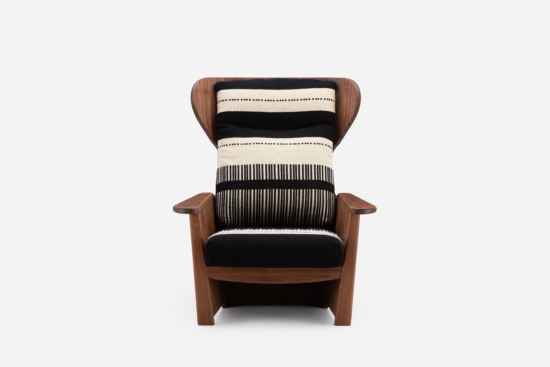 Available in black walnut, white oak, or ash in a range of finishes. Upholstered in Manta Lido, a hand woven traditional blanket from the Alentejo region of Portugal. See menus below for further material information.