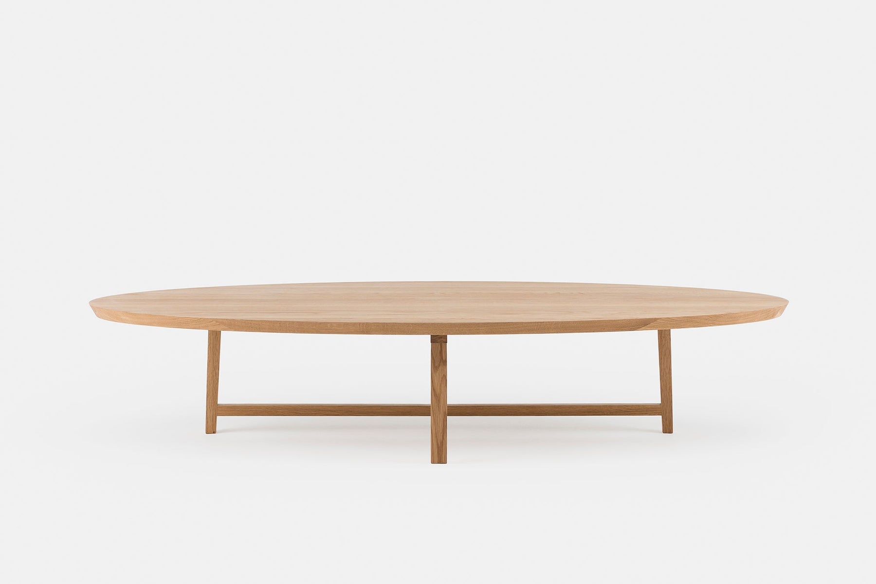 The Trio series is a tectonic exploration where the composition of the table legs is the design focal point. The tables stand on three legs, with each leg attached to another leg with an intermediate horizontal substructure. The tables express a purity of form and material, with the unexpected design focus under the table, where an intricately composed lattice work brings a hidden elegance to the otherwise simple and unassuming table ensemble.