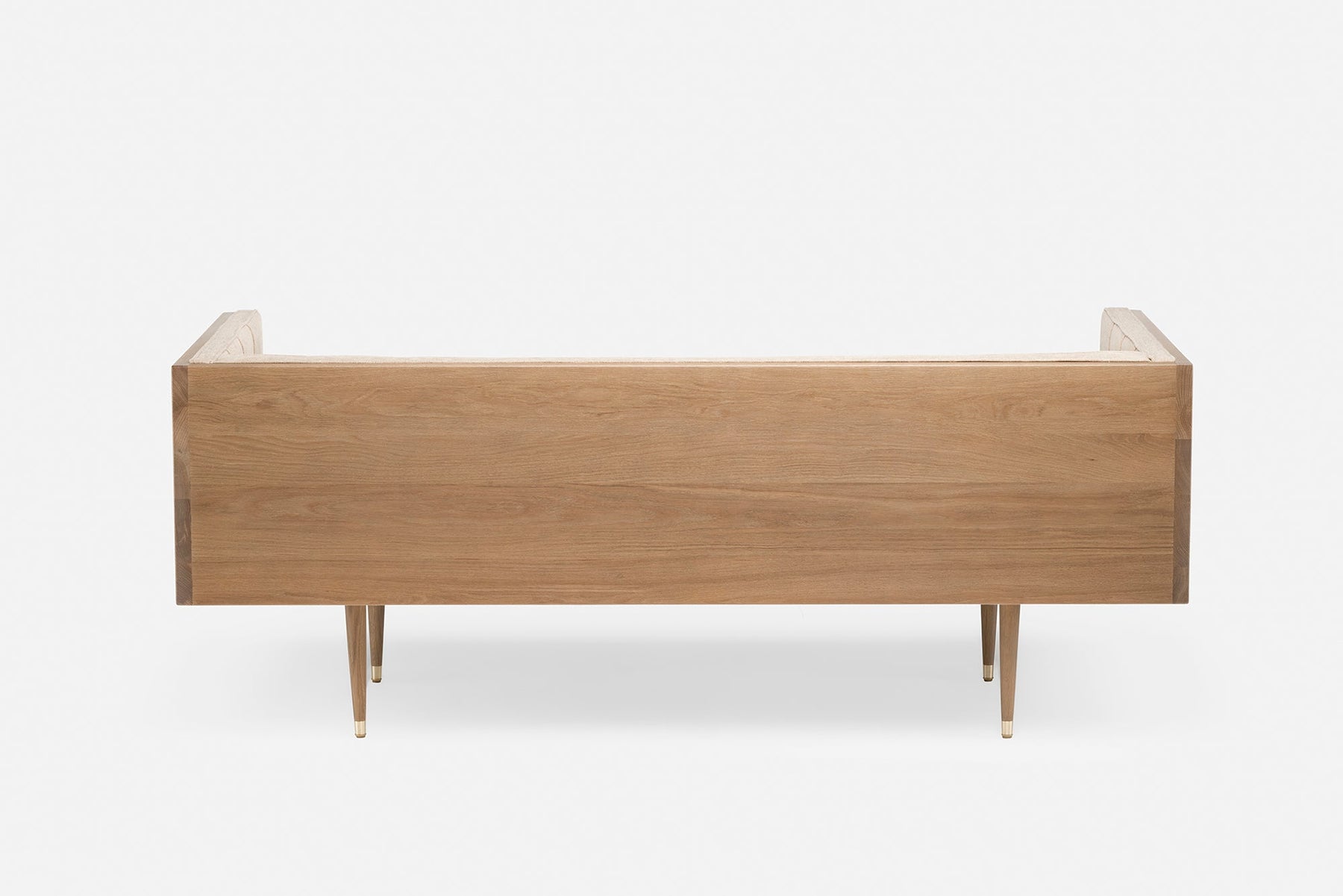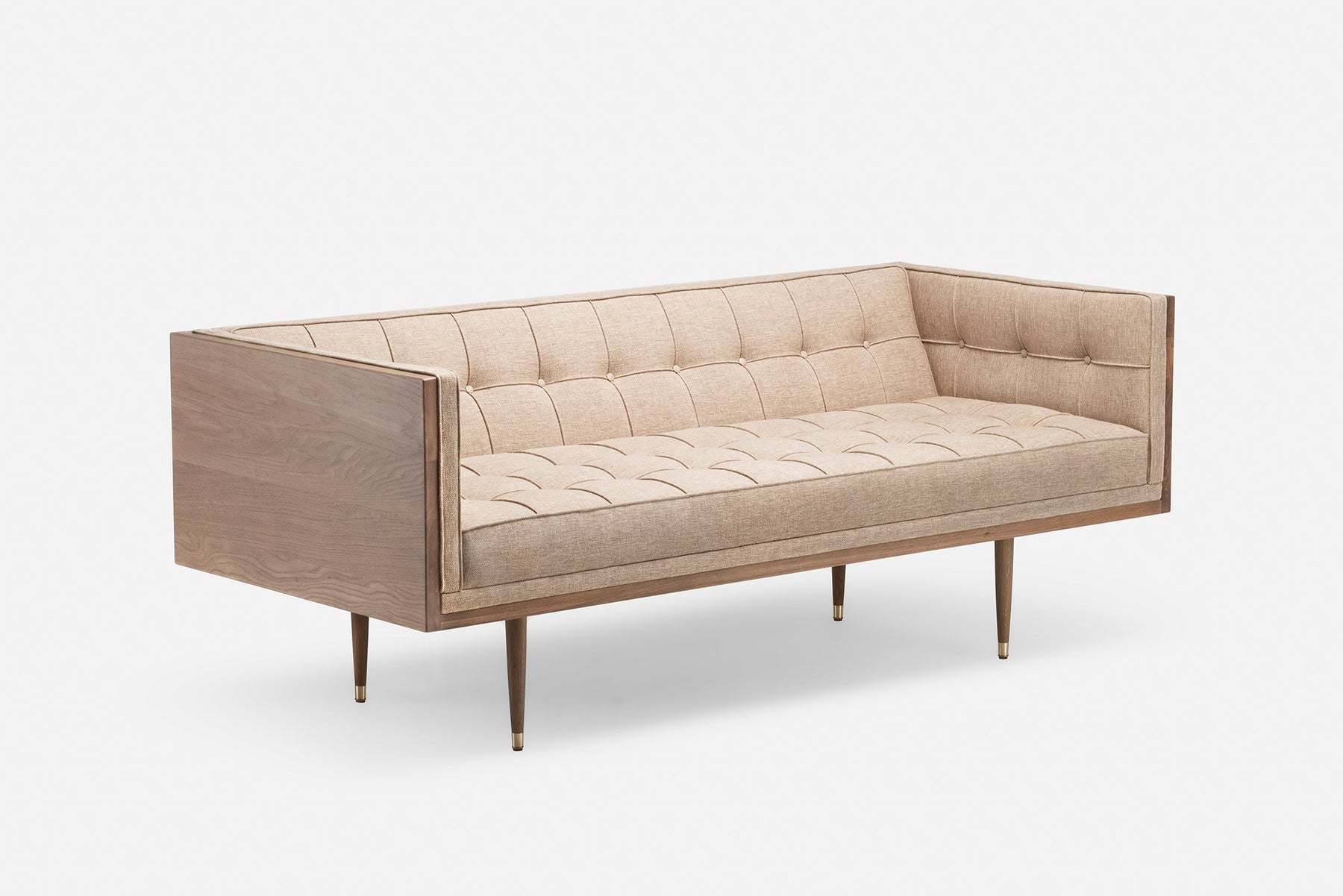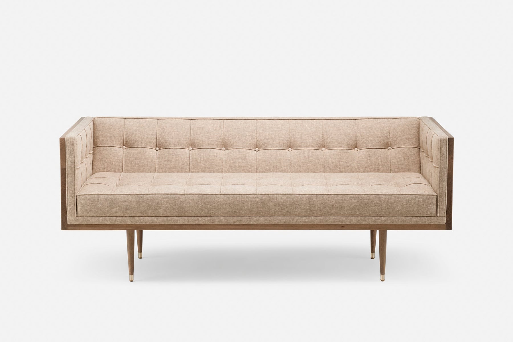 Box Sofa, inspired by the 1950s' modernist movement, has the pure shape of a box. The inner face of the solid wood form offers refined comfort with crisp upholstery and classic tuft detailing. The four supporting legs appear to be impossibly slender, creating a stunning profile.