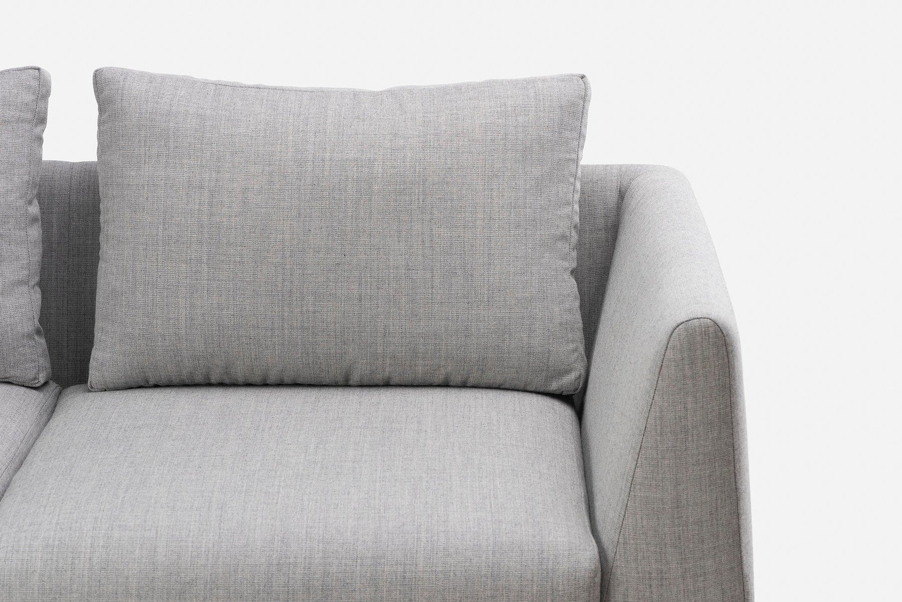 Hepburn is glamorous and light, with a tapered arm and a shallow base raised on slender solid wood legs, and an optional cross detail on the cushions. Available as a fixed 3-seater sofa or as a modular system.