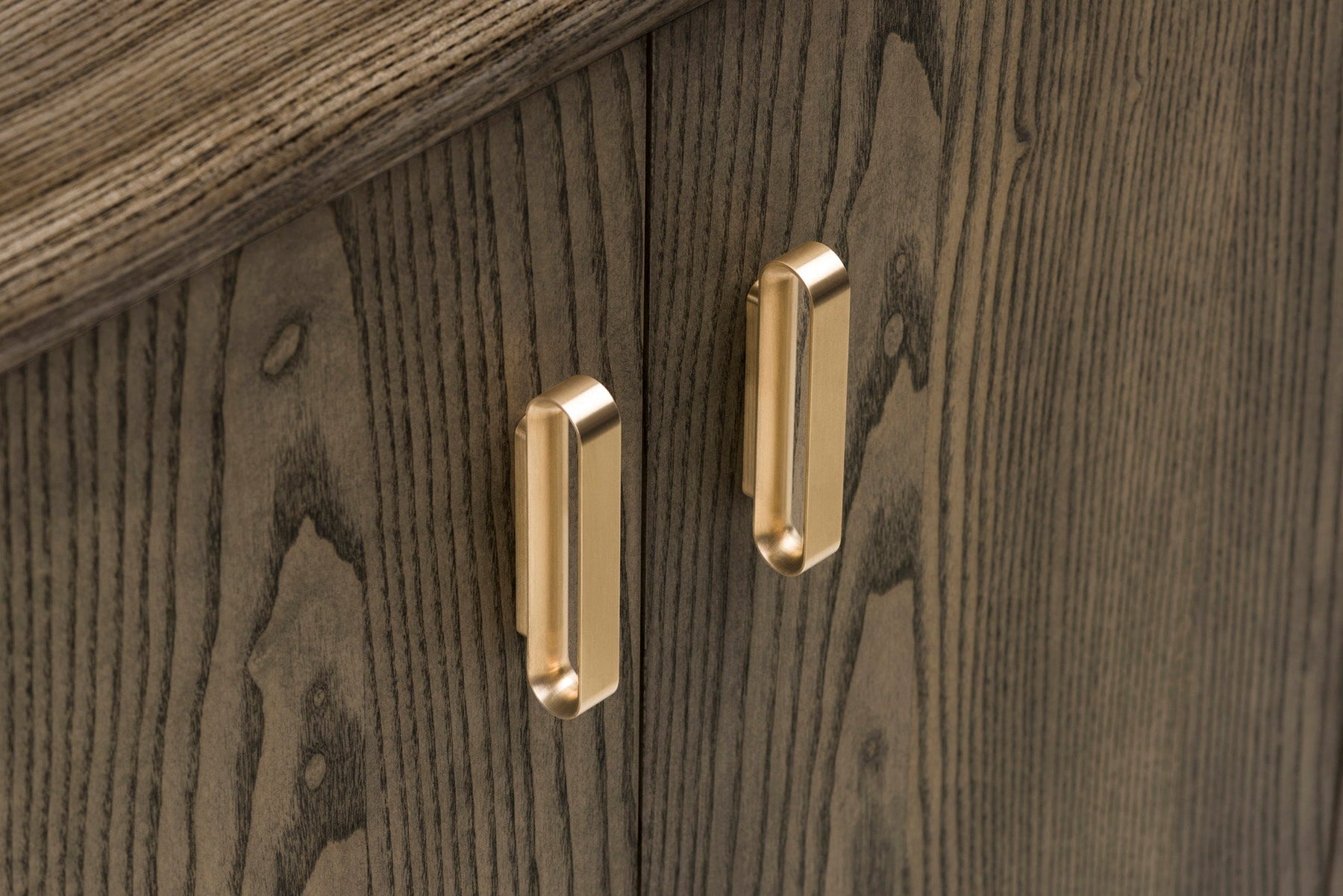 The solid wood cabinets feature machined brass handles and an elegant leg frame. Organisation is optimised with cable management, adjustable internal shelving, and optional internal storage trays, available separately, that connect to the shelves with hidden magnets.