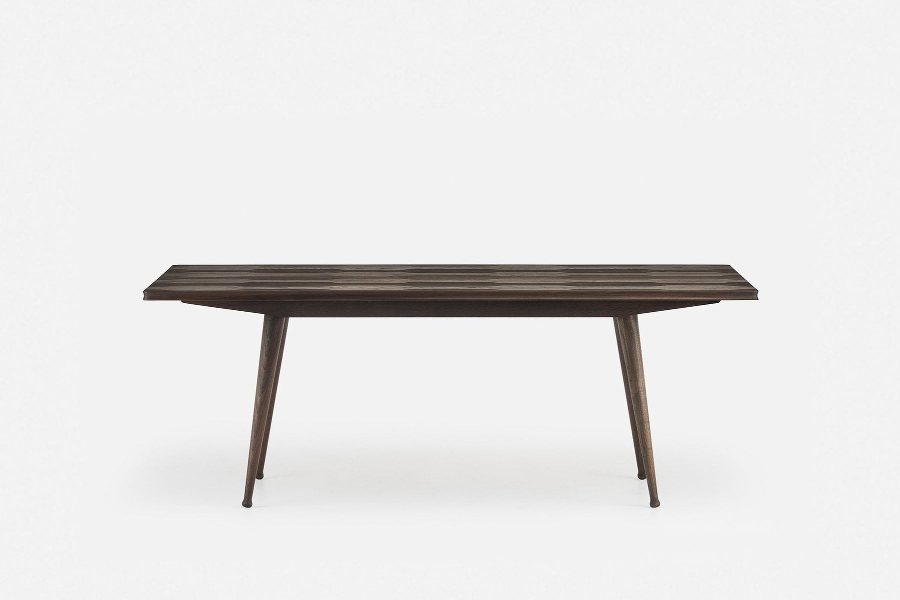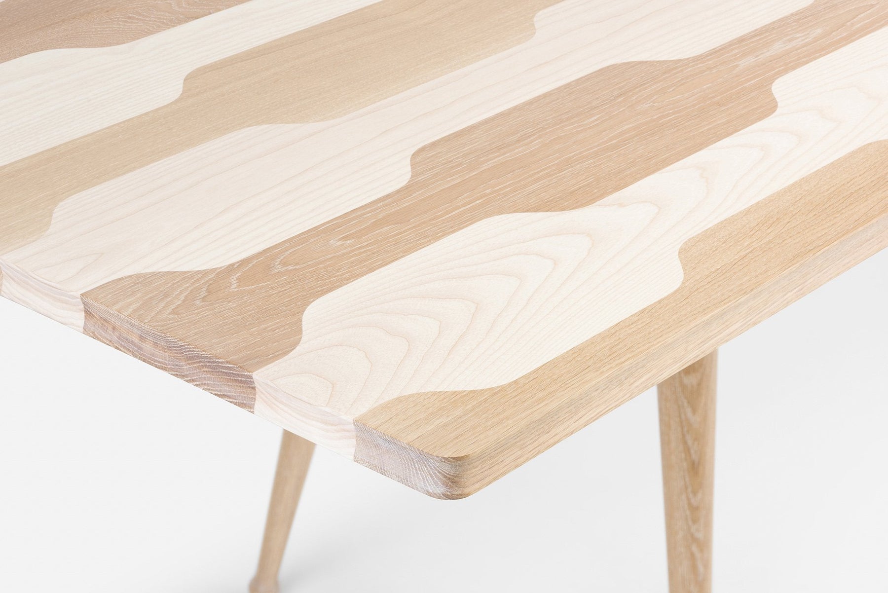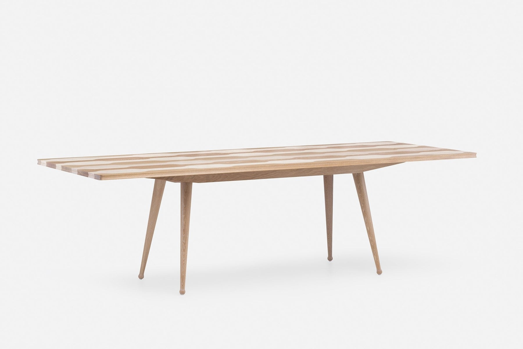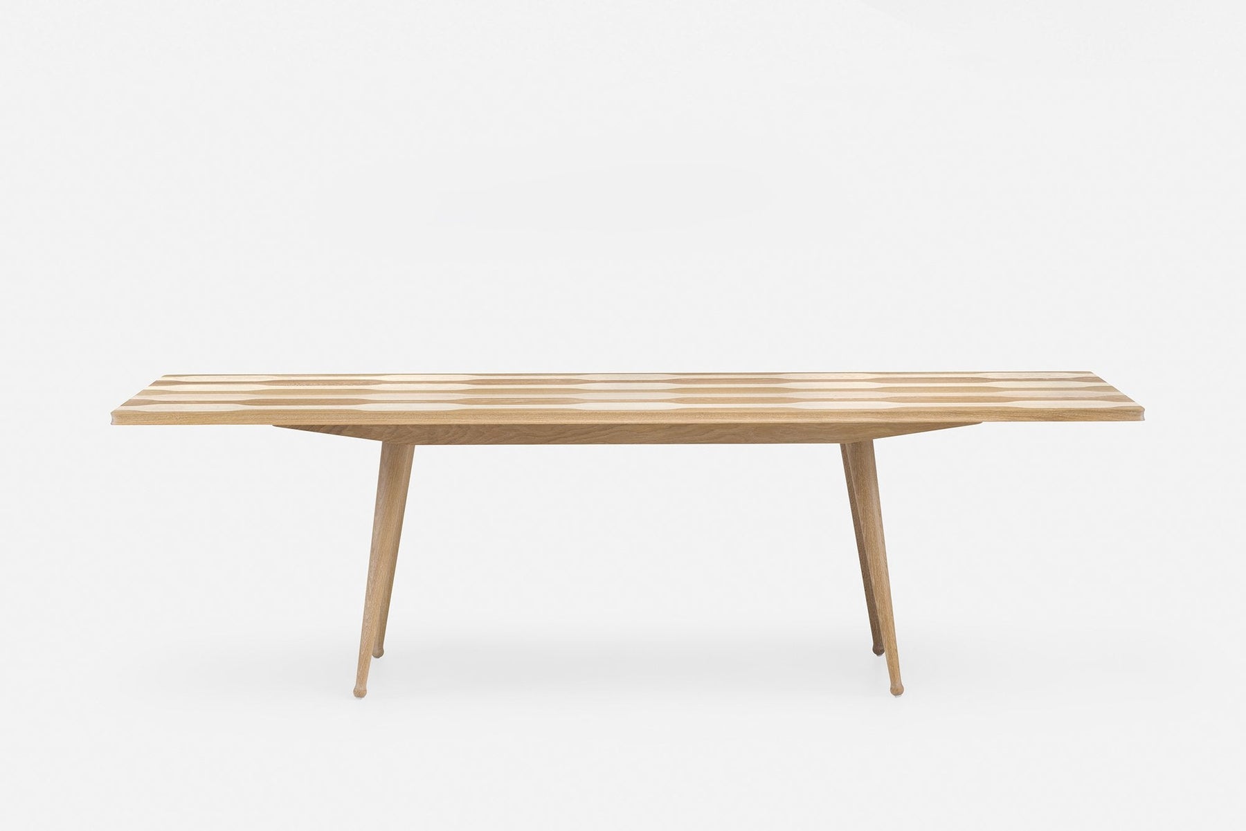 Tavli is a solid wood dining table with a tabletop that features a decorative joint detail: each plank in the tabletop is shaped with an undulating edge, creating a continuous, repeating geometric pattern across the length of the table. Named after the backgammon tavli board, this table reimagines the decorative wood detailing of its namesake.