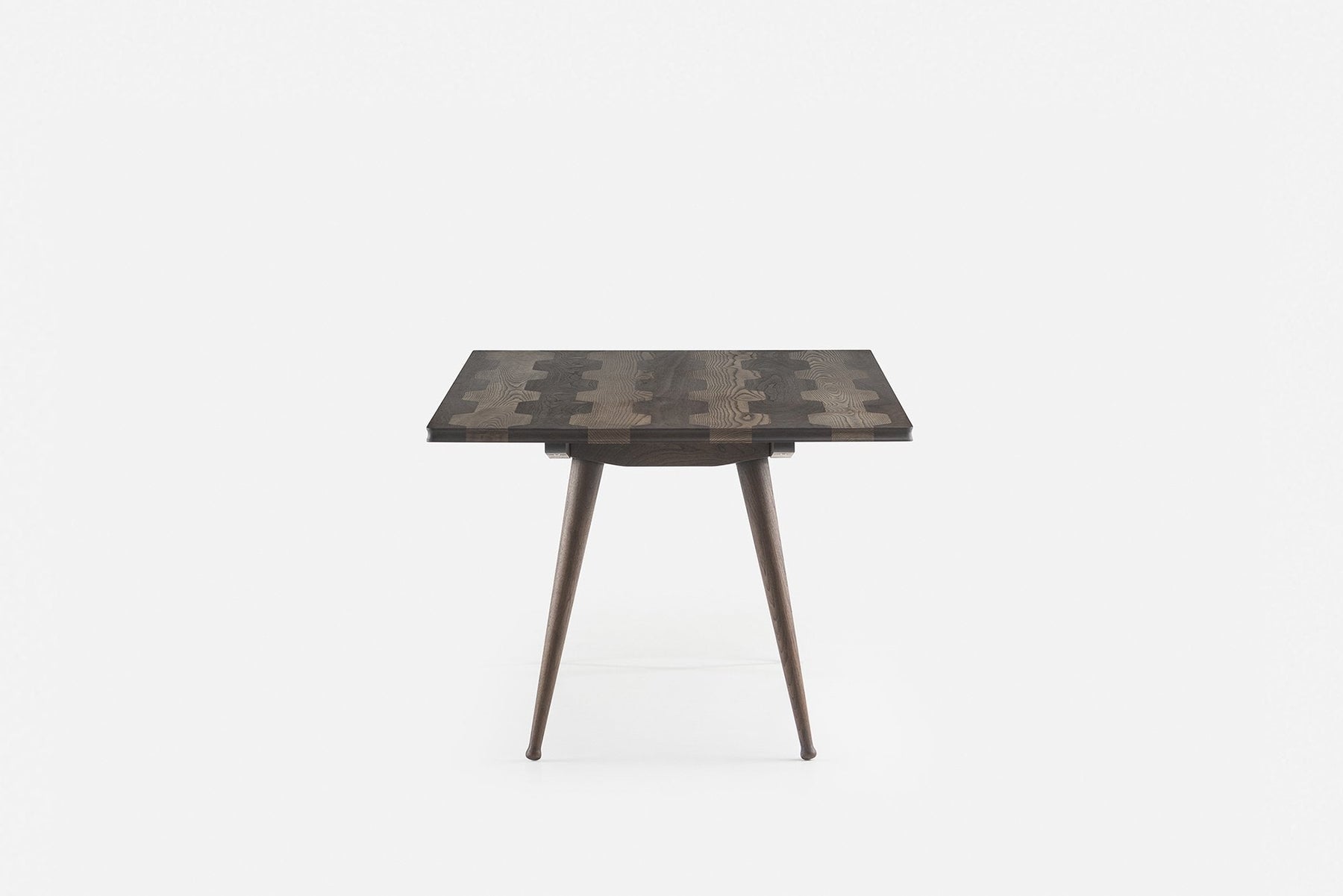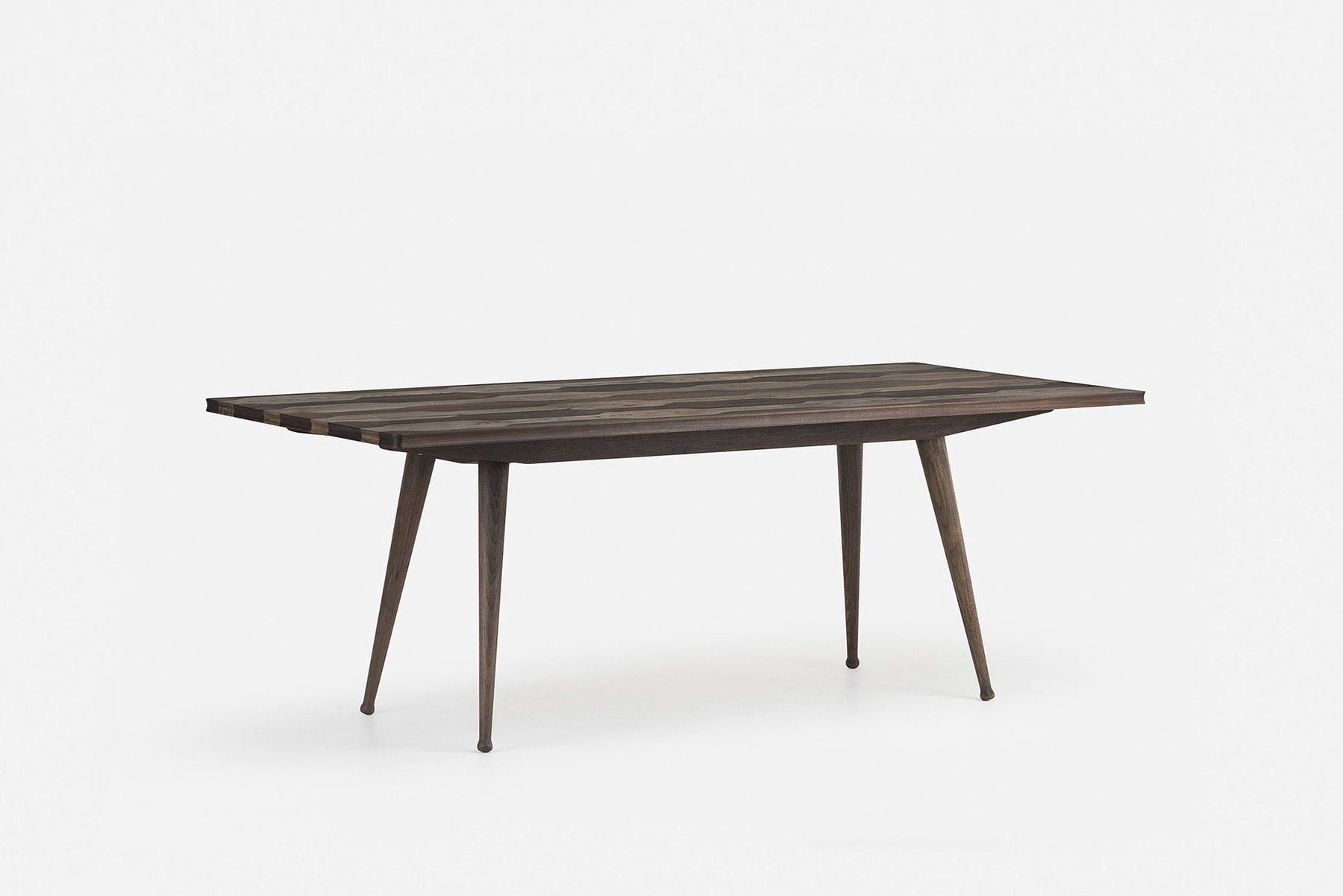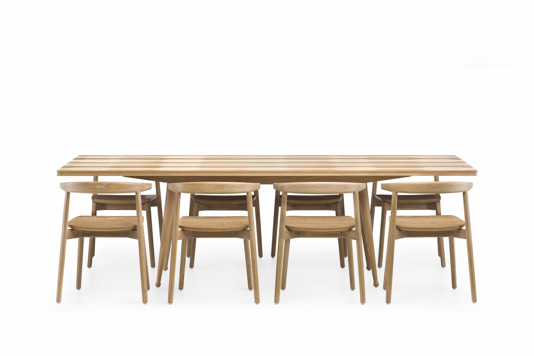 Tavli is a solid wood dining table with a tabletop that features a decorative joint detail: each plank in the tabletop is shaped with an undulating edge, creating a continuous, repeating geometric pattern across the length of the table. Named after the backgammon tavli board, this table reimagines the decorative wood detailing of its namesake.