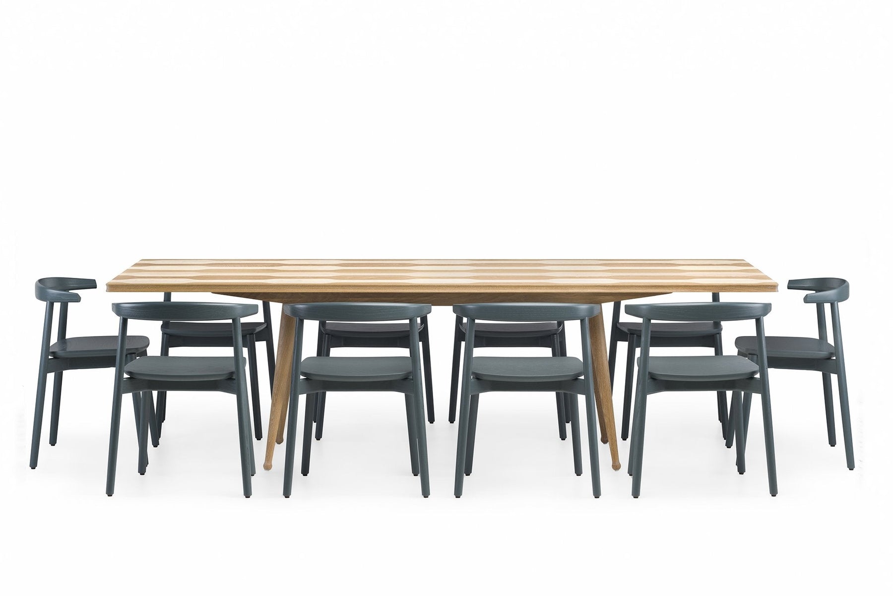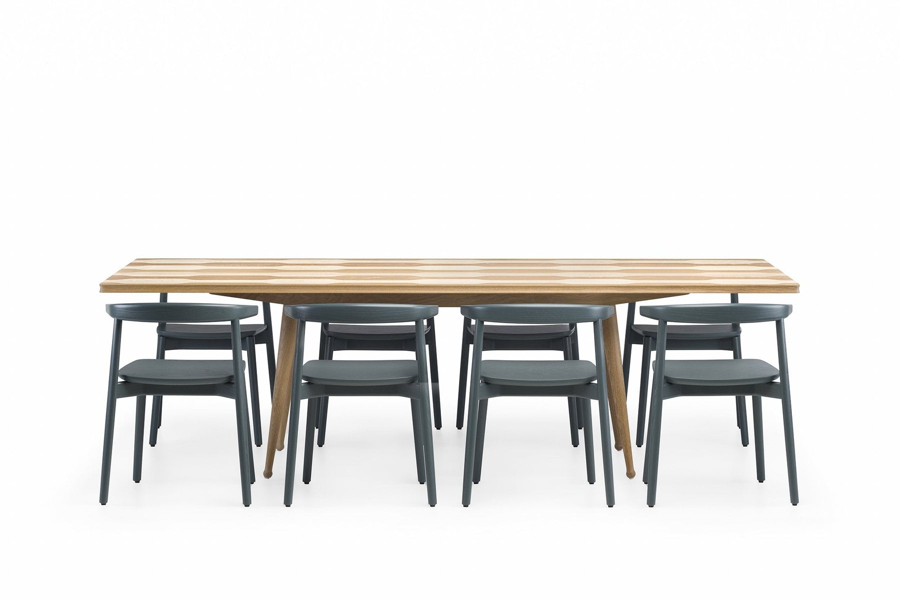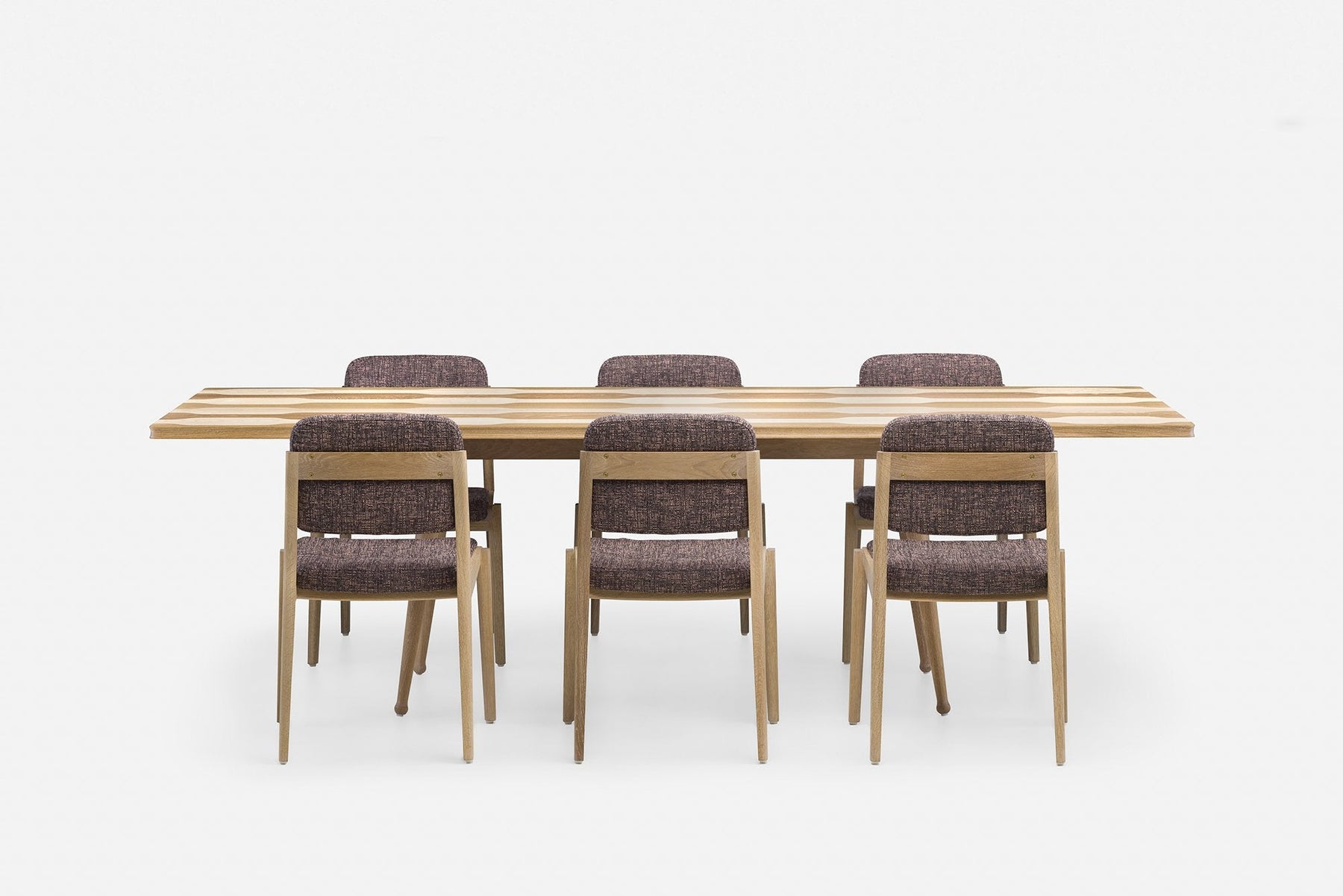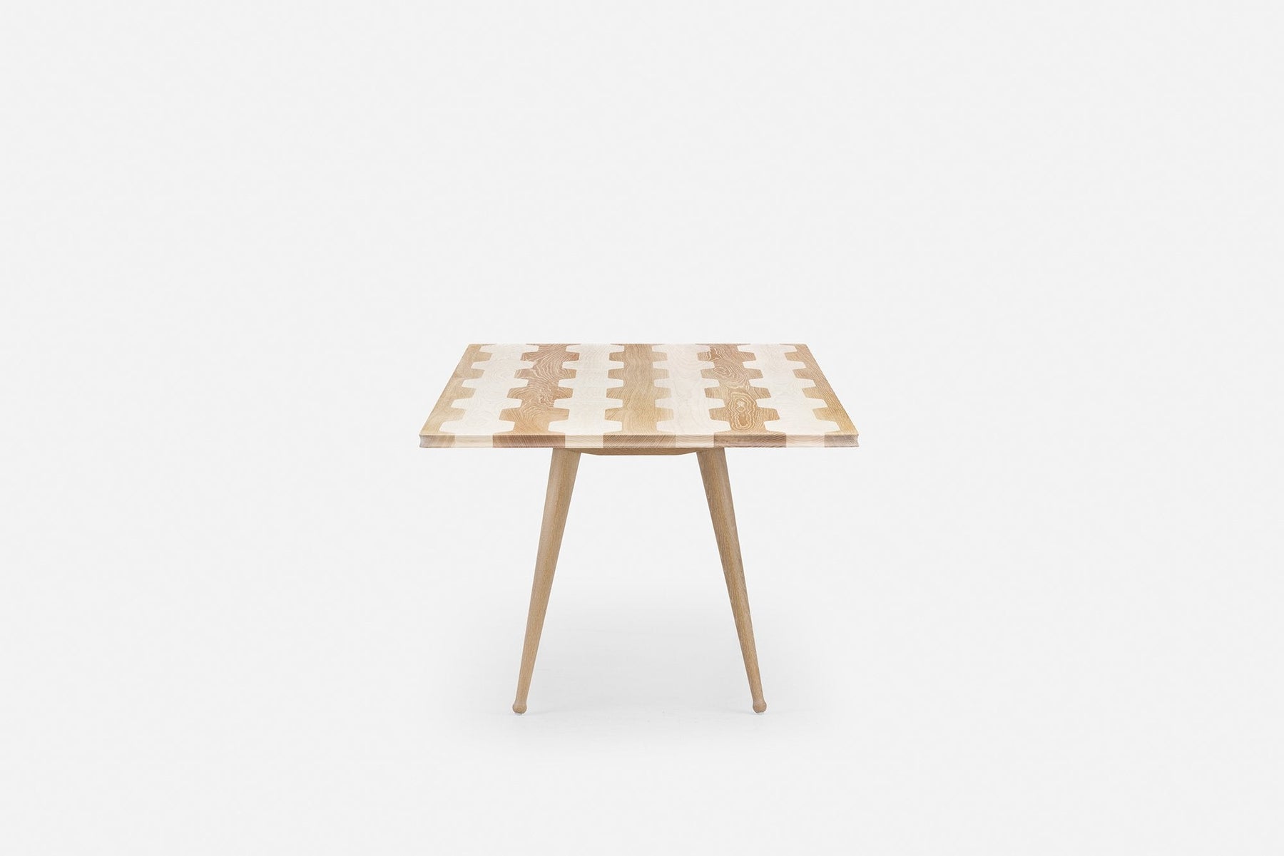 Tavli is a solid wood dining table with a tabletop that features a decorative joint detail: each plank in the tabletop is shaped with an undulating edge, creating a continuous, repeating geometric pattern across the length of the table. Named after the backgammon tavli board, this table reimagines the decorative wood detailing of its namesake.