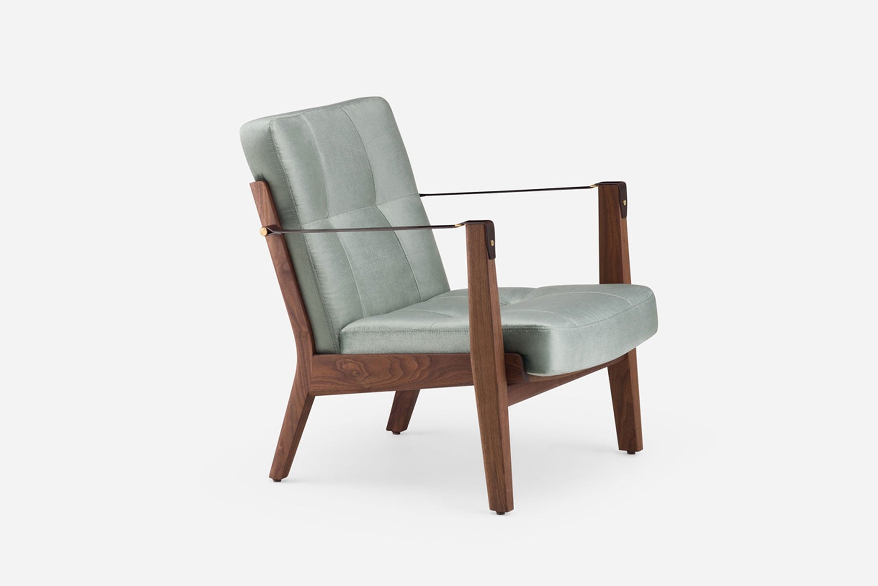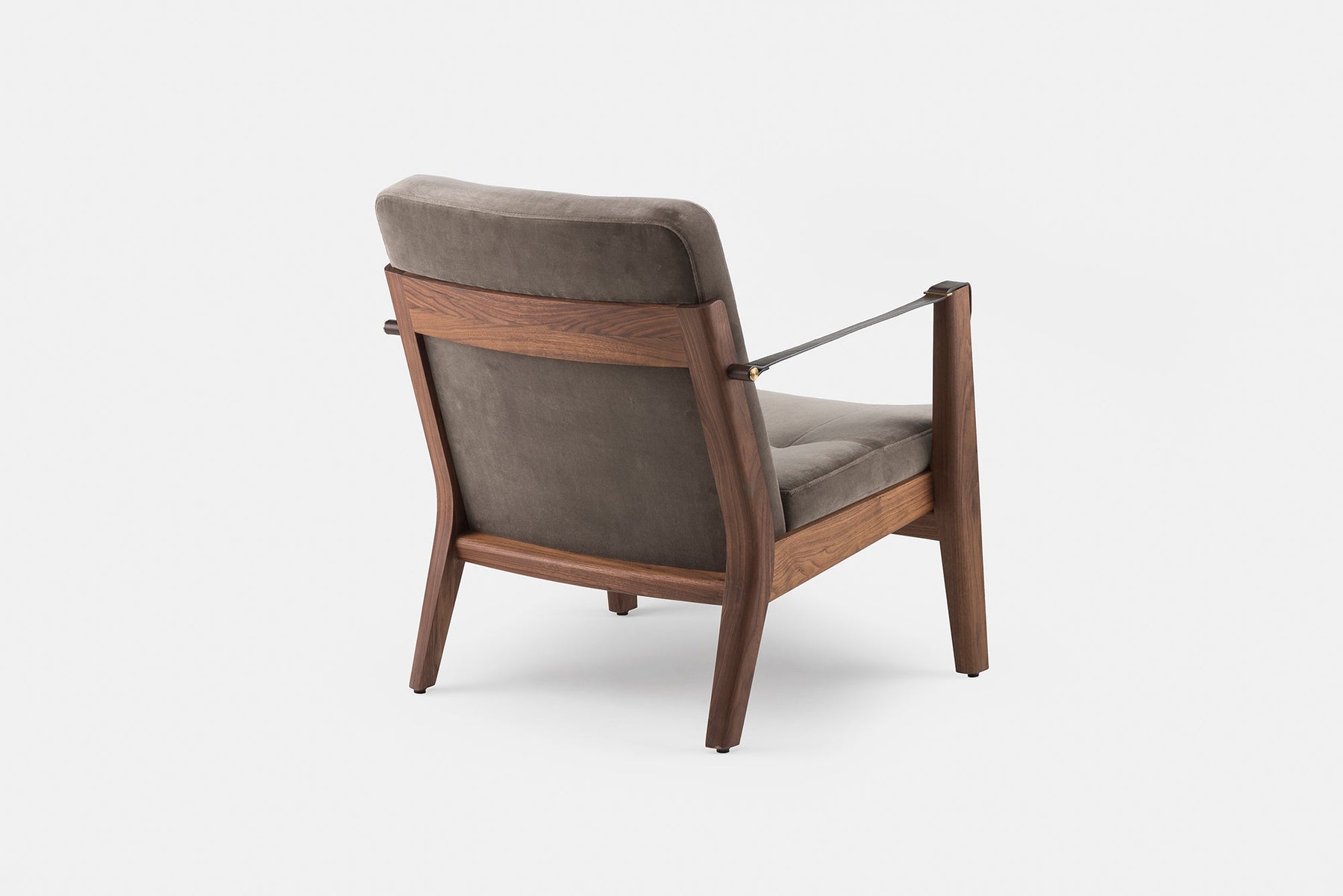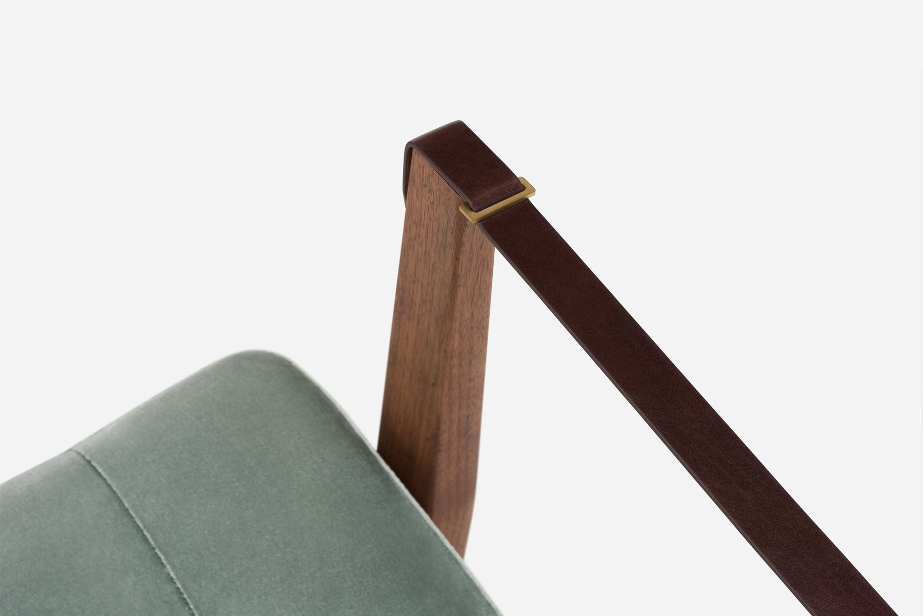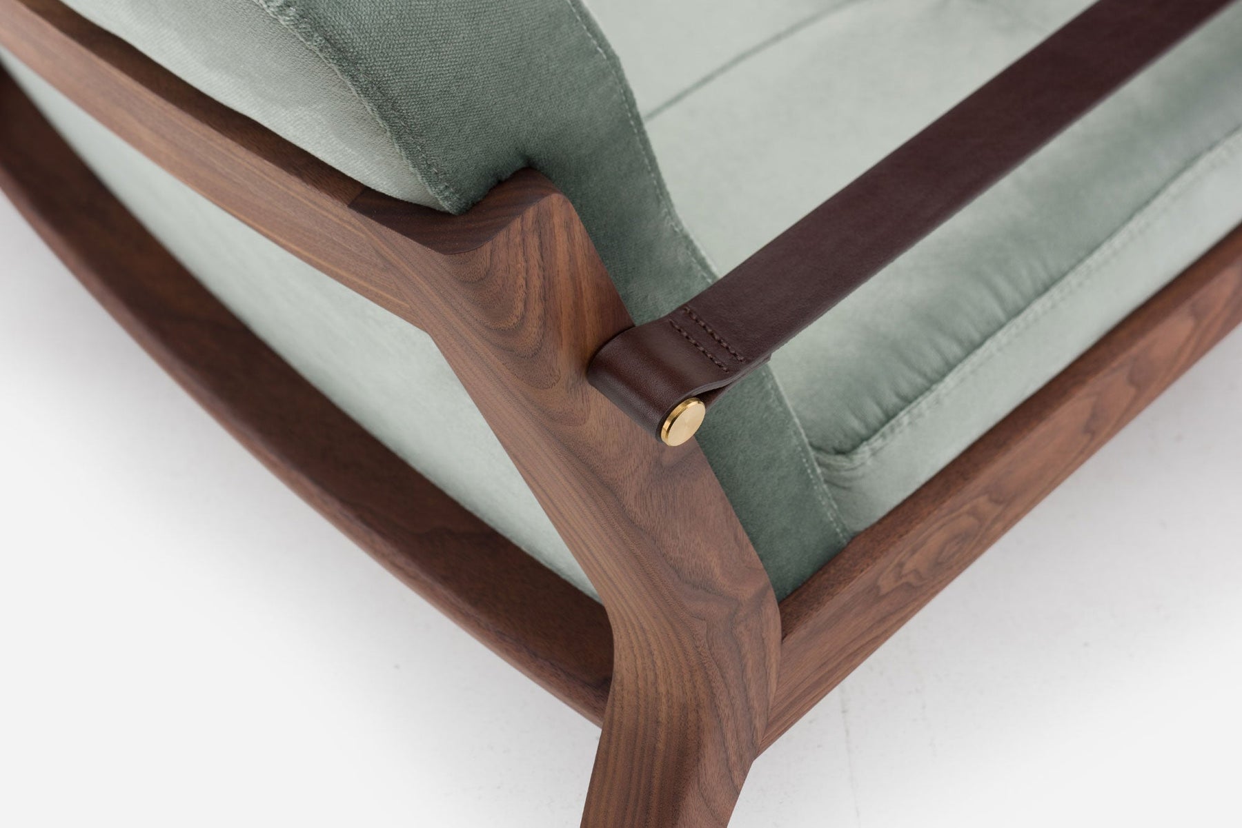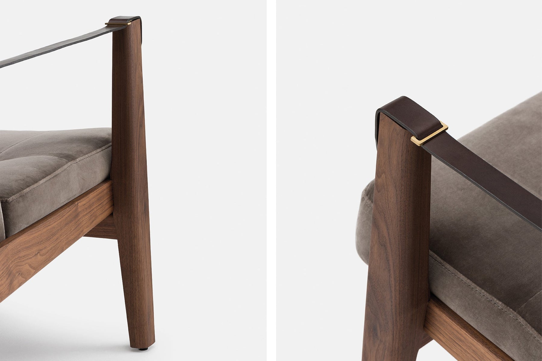 Available in black walnut, white oak, or ash in a range of finishes, and a range of fabric and leather options. Leather belting strap arms in black or brown with brass-coloured PVD detailing. See menus below for further material information.
