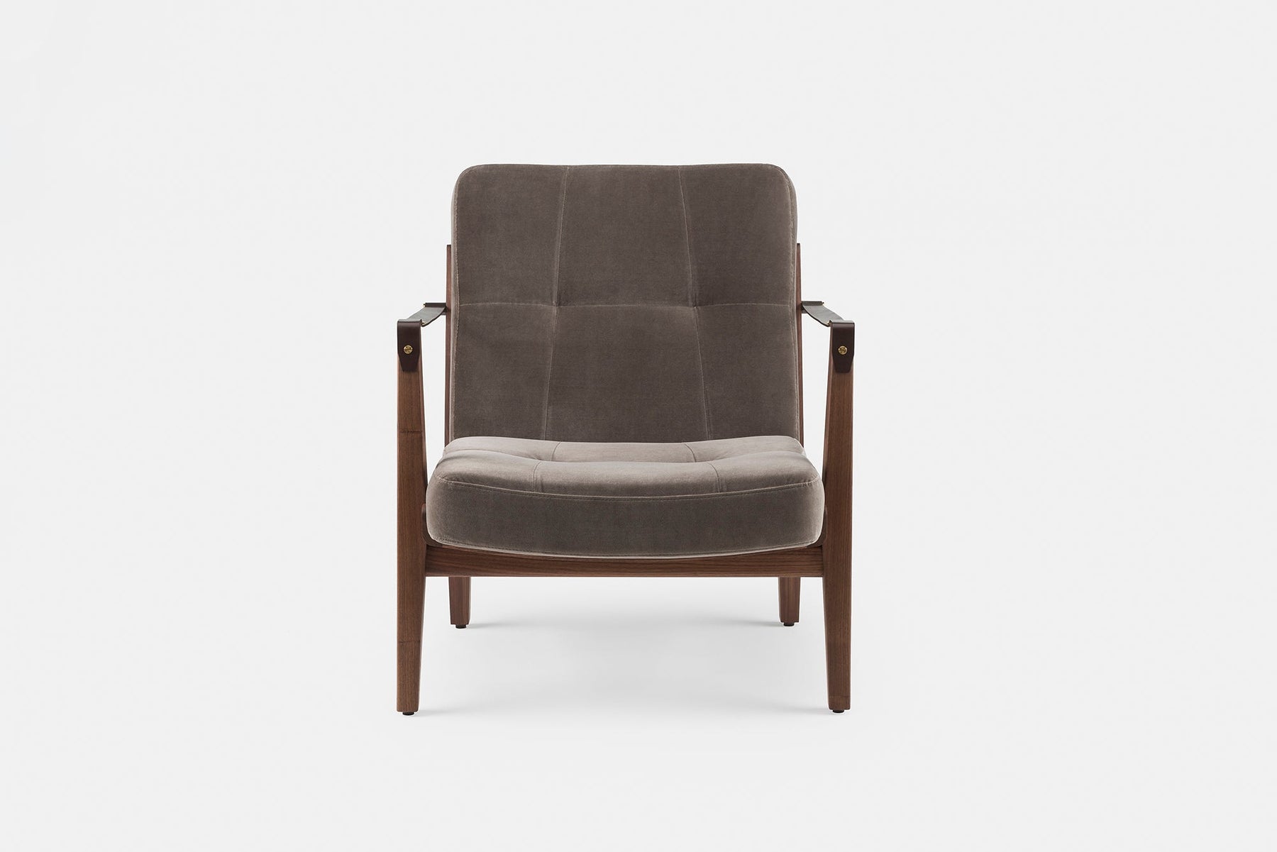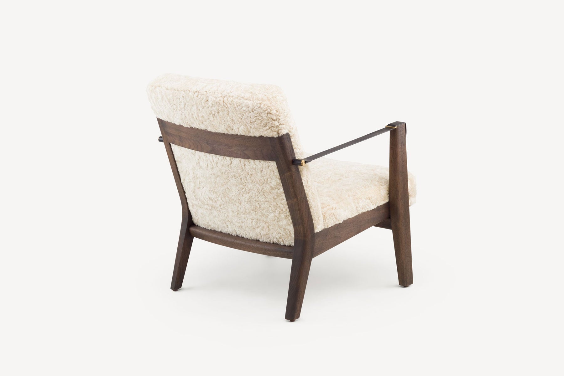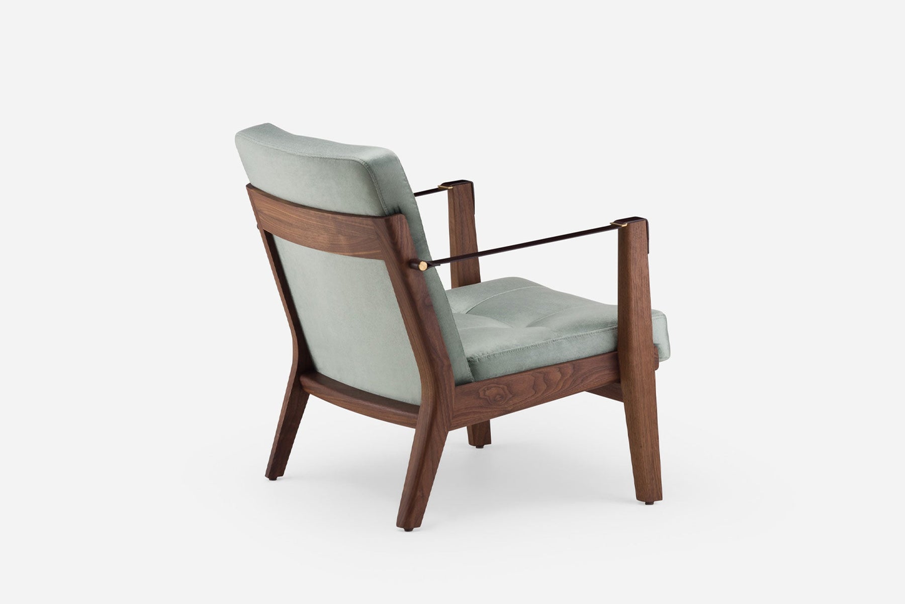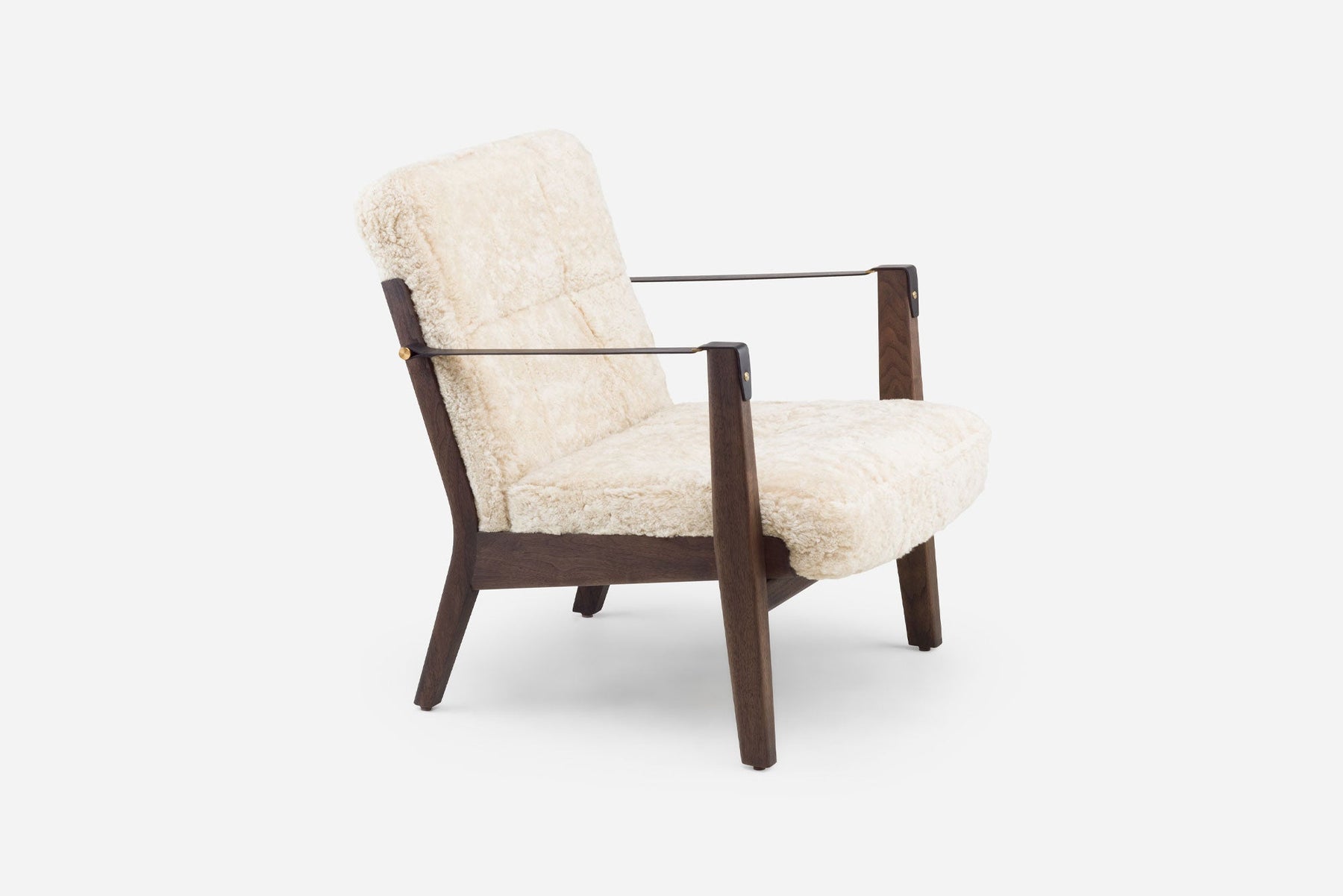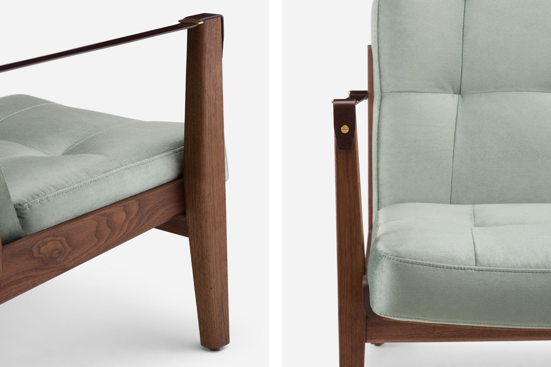Available in black walnut, white oak, or ash in a range of finishes, and a range of fabric and leather options. Leather belting strap arms in black or brown with brass-coloured PVD detailing. See menus below for further material information.