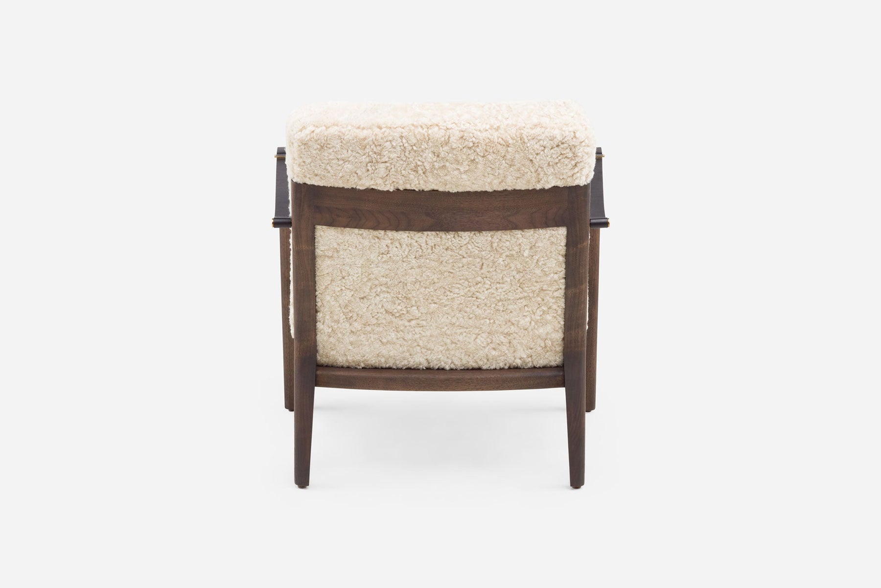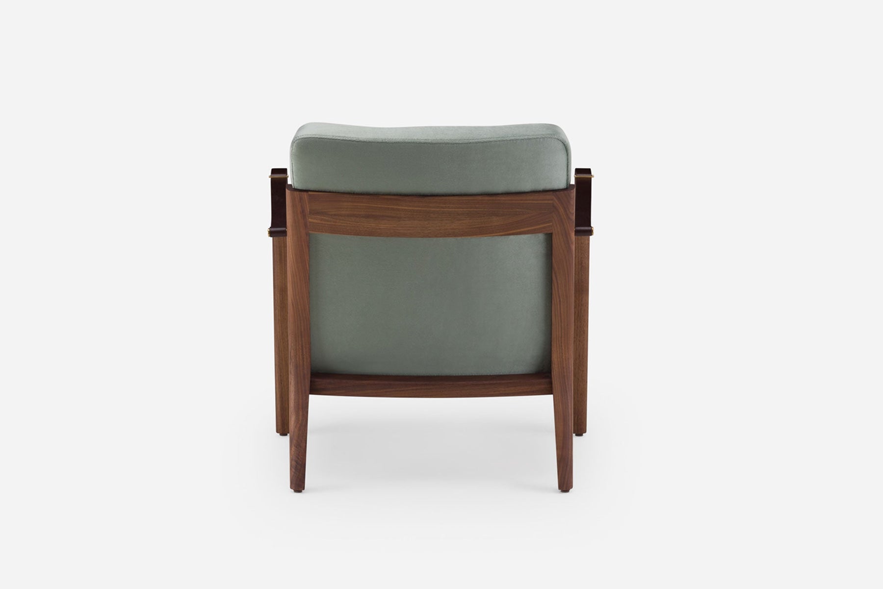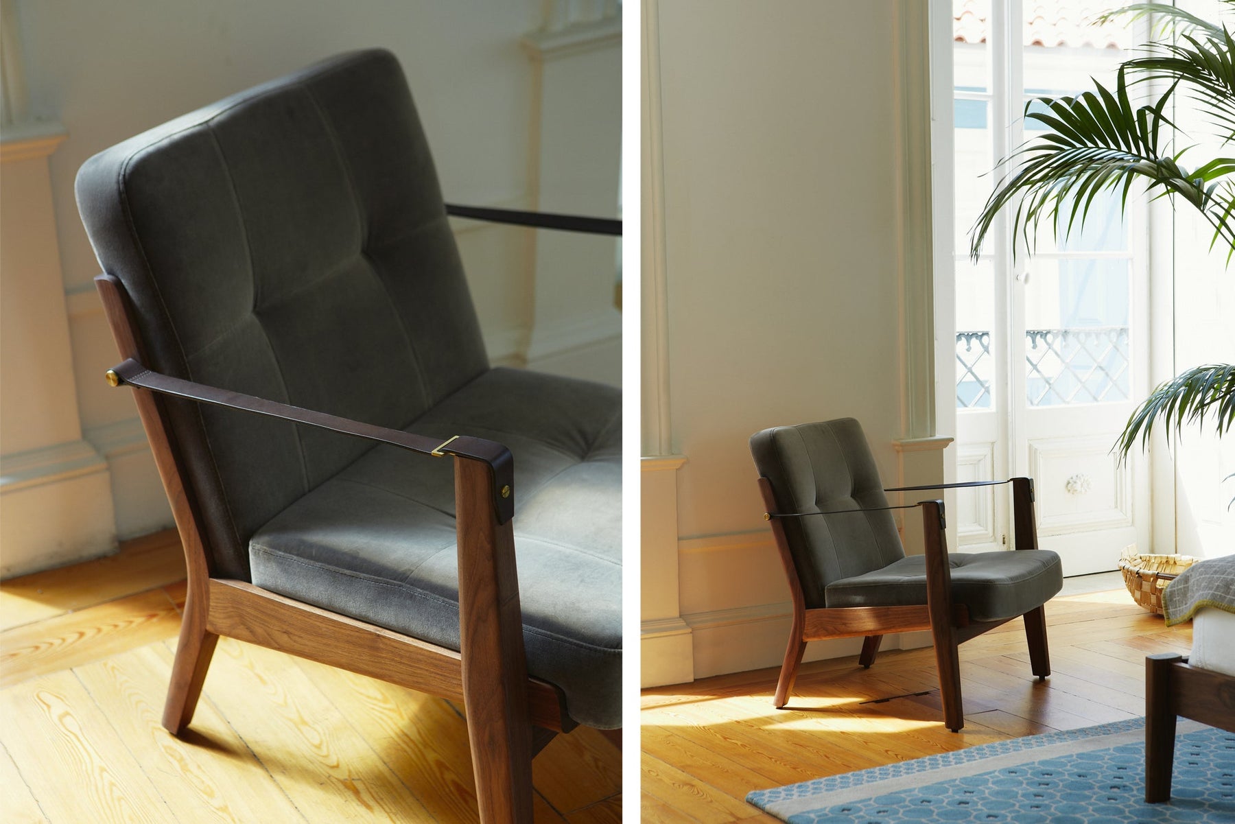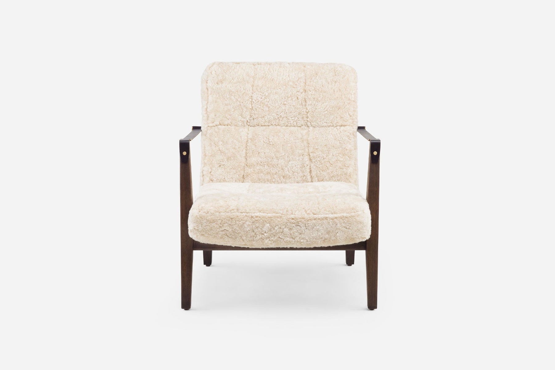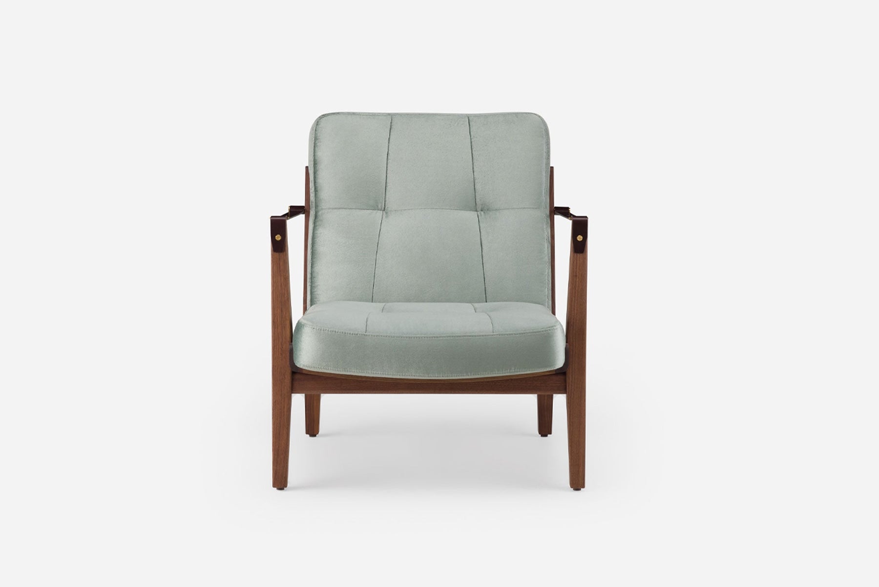 Available in black walnut, white oak, or ash in a range of finishes, and a range of fabric and leather options. Leather belting strap arms in black or brown with brass-coloured PVD detailing. See menus below for further material information.
