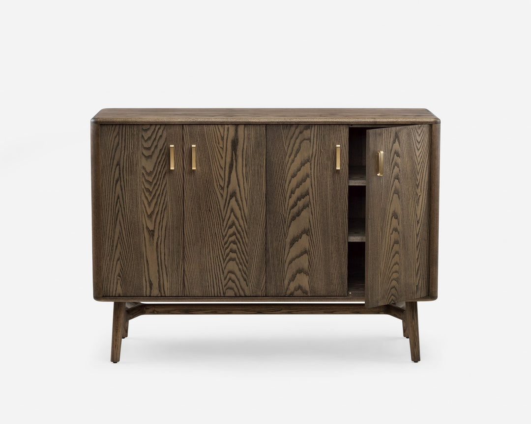 The solid wood cabinets, now available in three sizes, feature machined brass handles and an elegant leg frame. Organisation is optimised with cable management, adjustable internal shelving, and optional internal storage trays, available separately, that connect to the shelves with hidden magnets.
