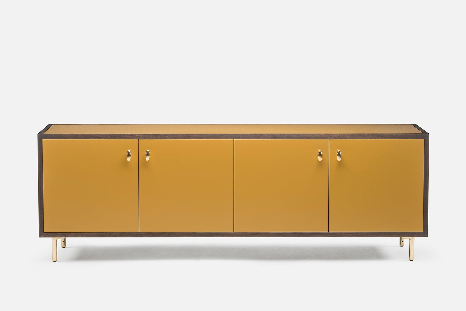 Inspired by the juxtaposition of old and new design seen in converted Brooklyn brownstones, Classon Sideboard is modern with historical references. Polished brass door pulls and legs elegantly complement the cabinet body available in painted hdf and a range of timbers and finishes.