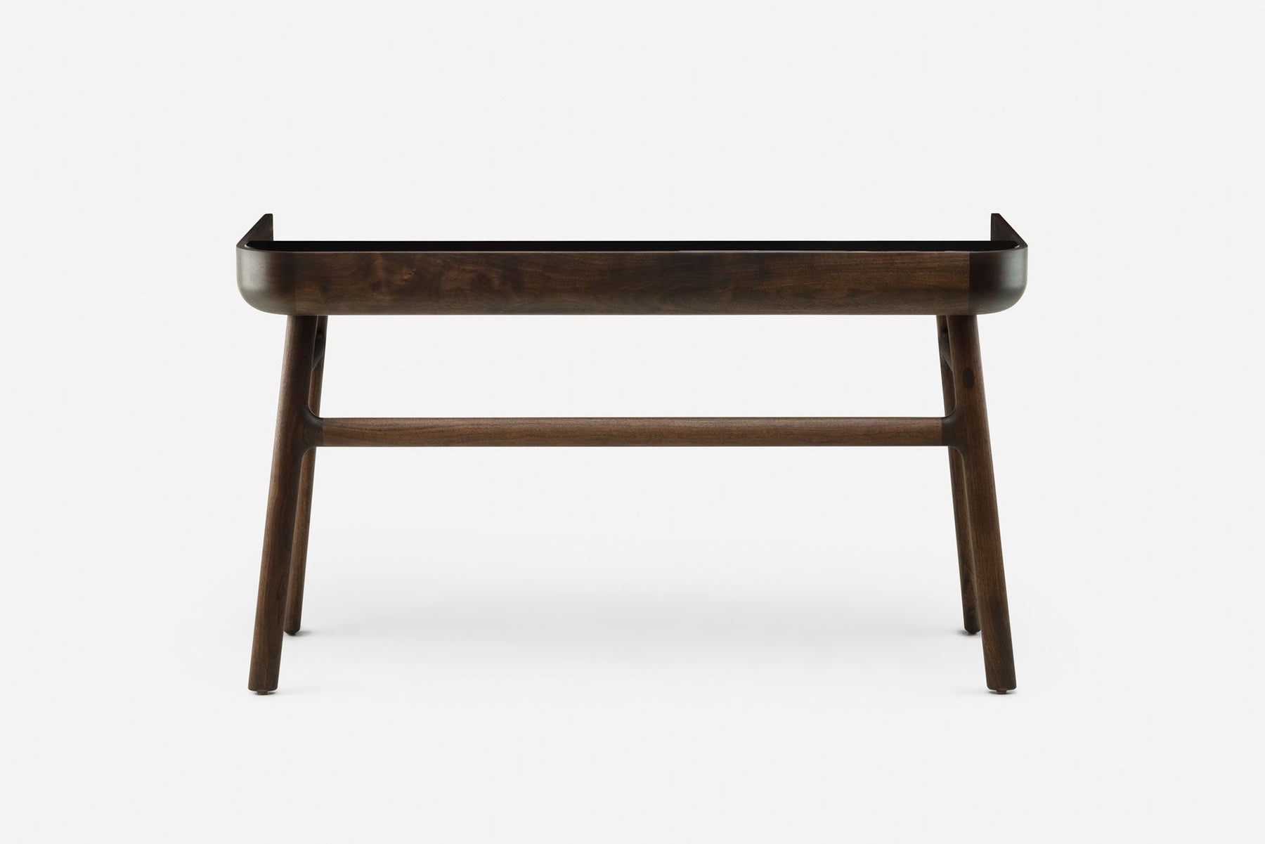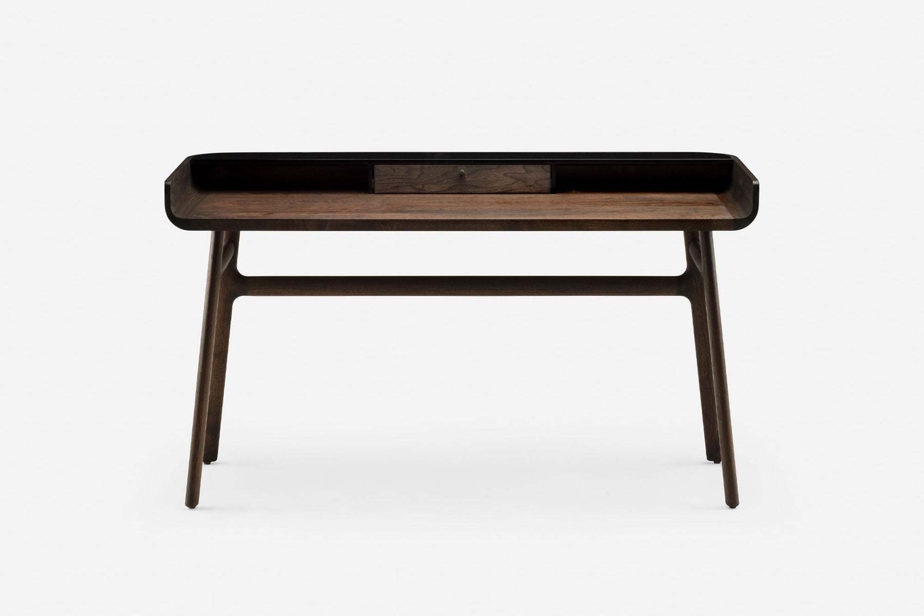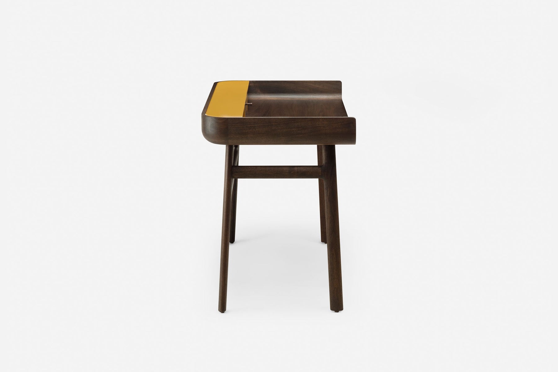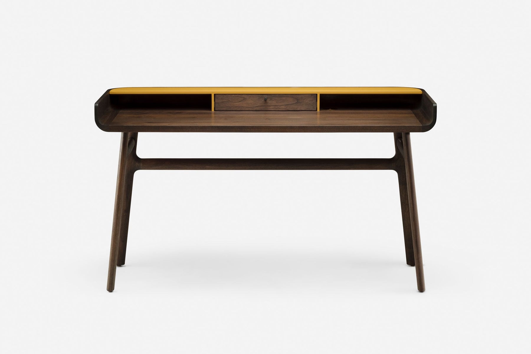 Crafted in wood with lacquer accents, Harold is a classic writing desk featuring a tabletop drawer and open storage spaces. The upward curves at the sides of the tabletop are machined from generous planks of premium timber. Slender H-frame legs joined with wedge tenons provide visual levity.