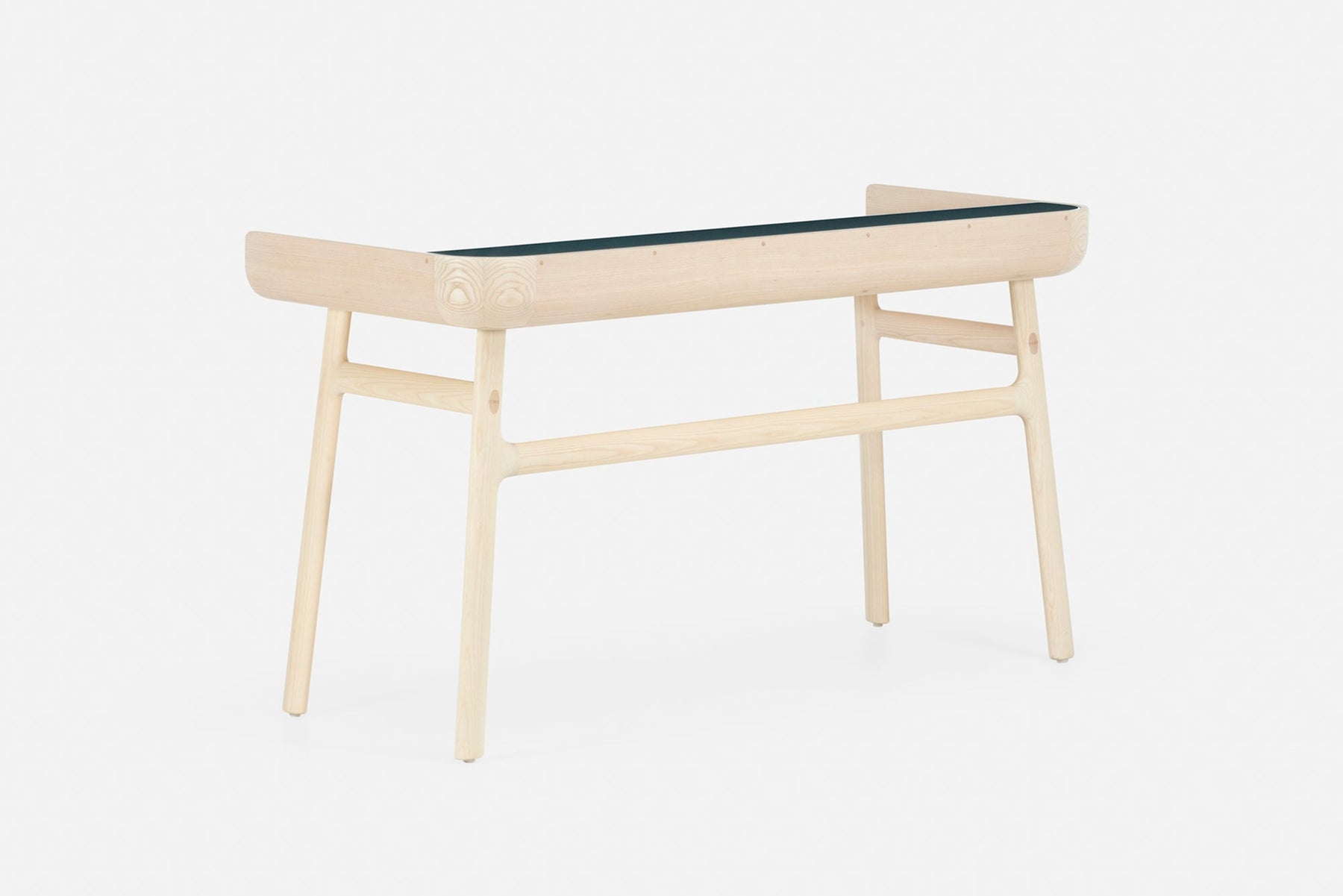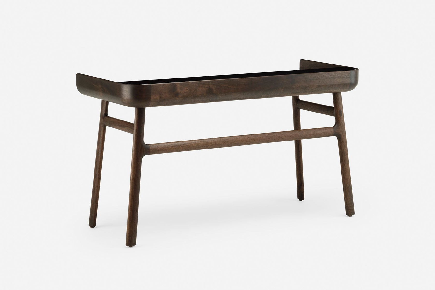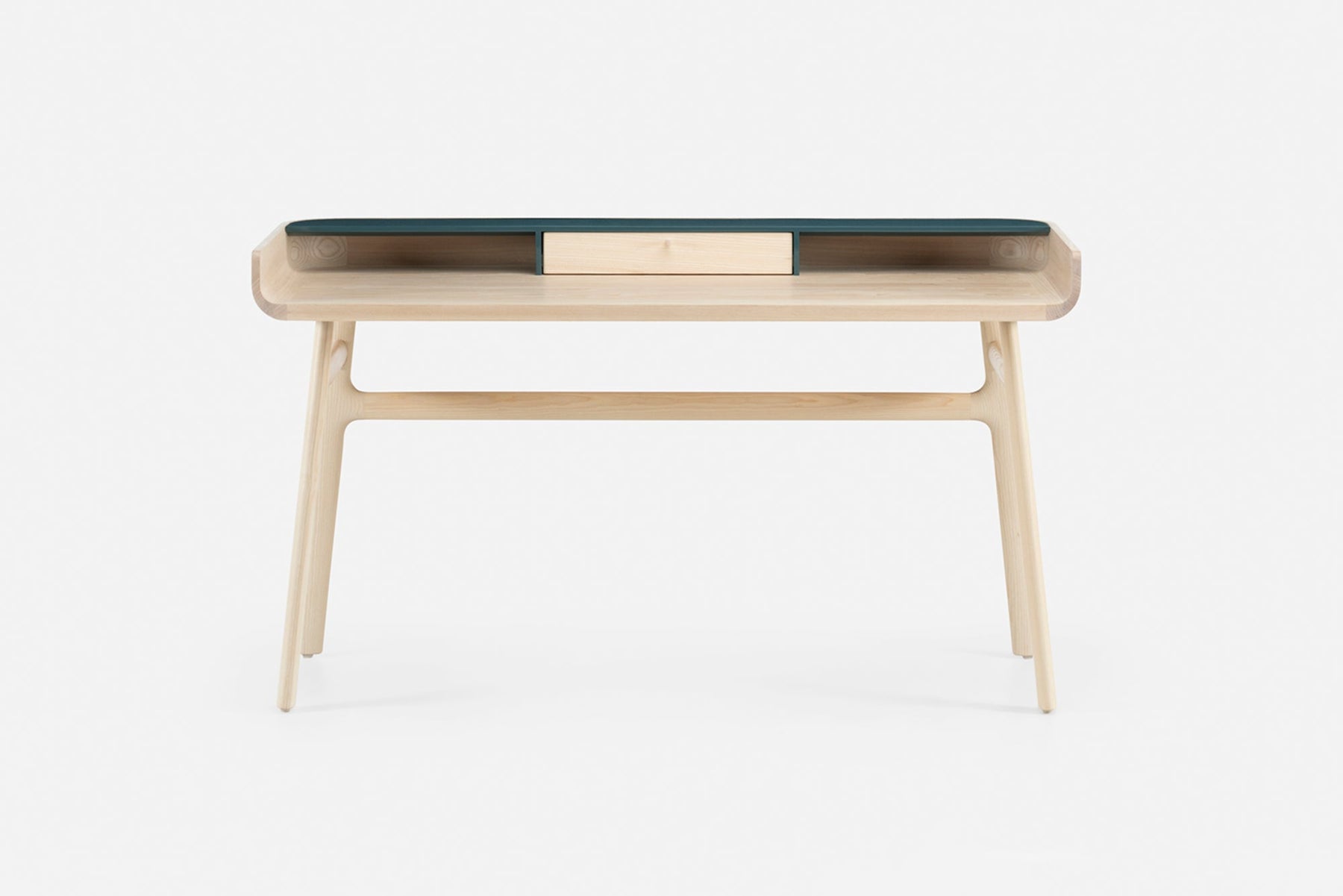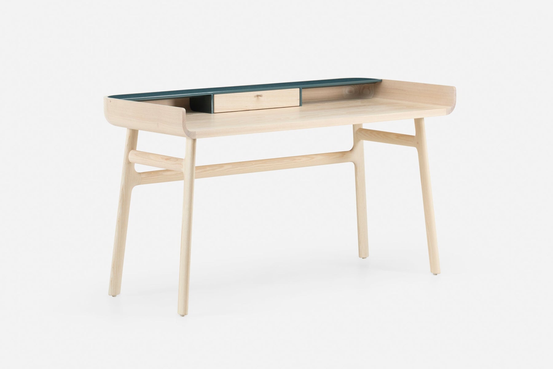 Crafted in wood with lacquer accents, Harold is a classic writing desk featuring a tabletop drawer and open storage spaces. The upward curves at the sides of the tabletop are machined from generous planks of premium timber. Slender H-frame legs joined with wedge tenons provide visual levity.