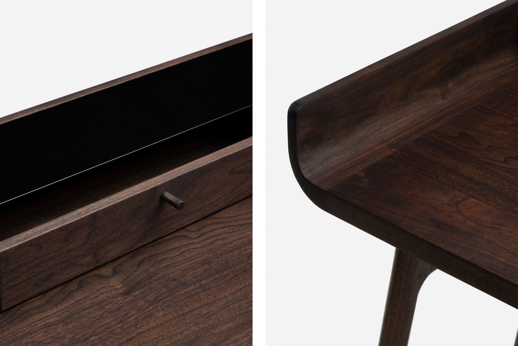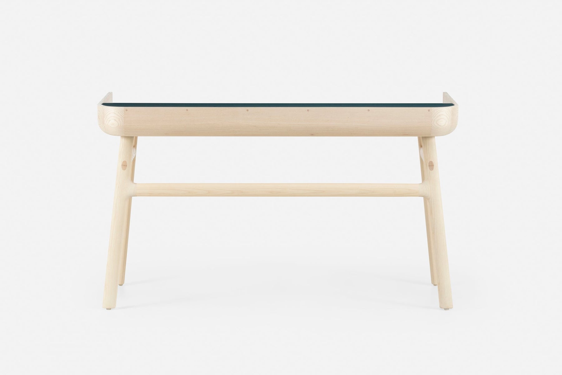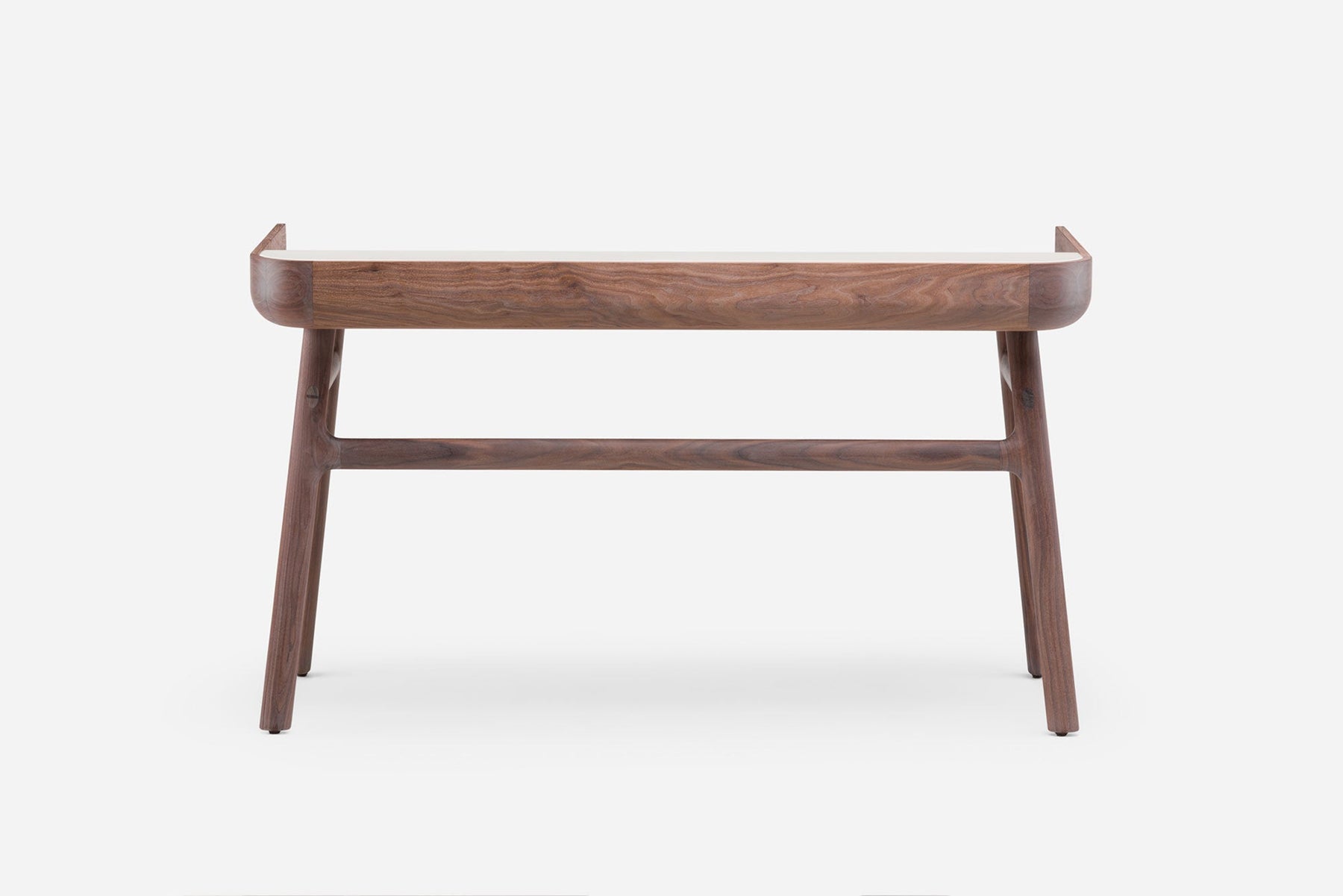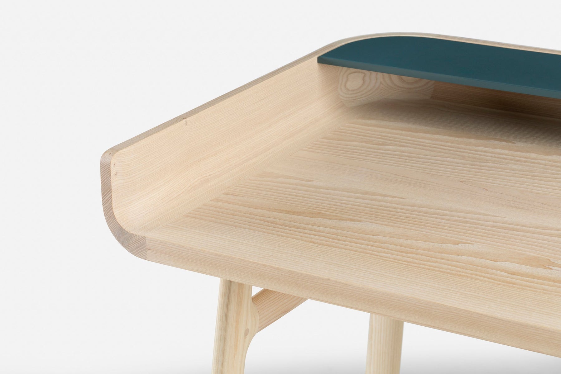 Crafted in wood with lacquer accents, Harold is a classic writing desk featuring a tabletop drawer and open storage spaces. The upward curves at the sides of the tabletop are machined from generous planks of premium timber. Slender H-frame legs joined with wedge tenons provide visual levity.
