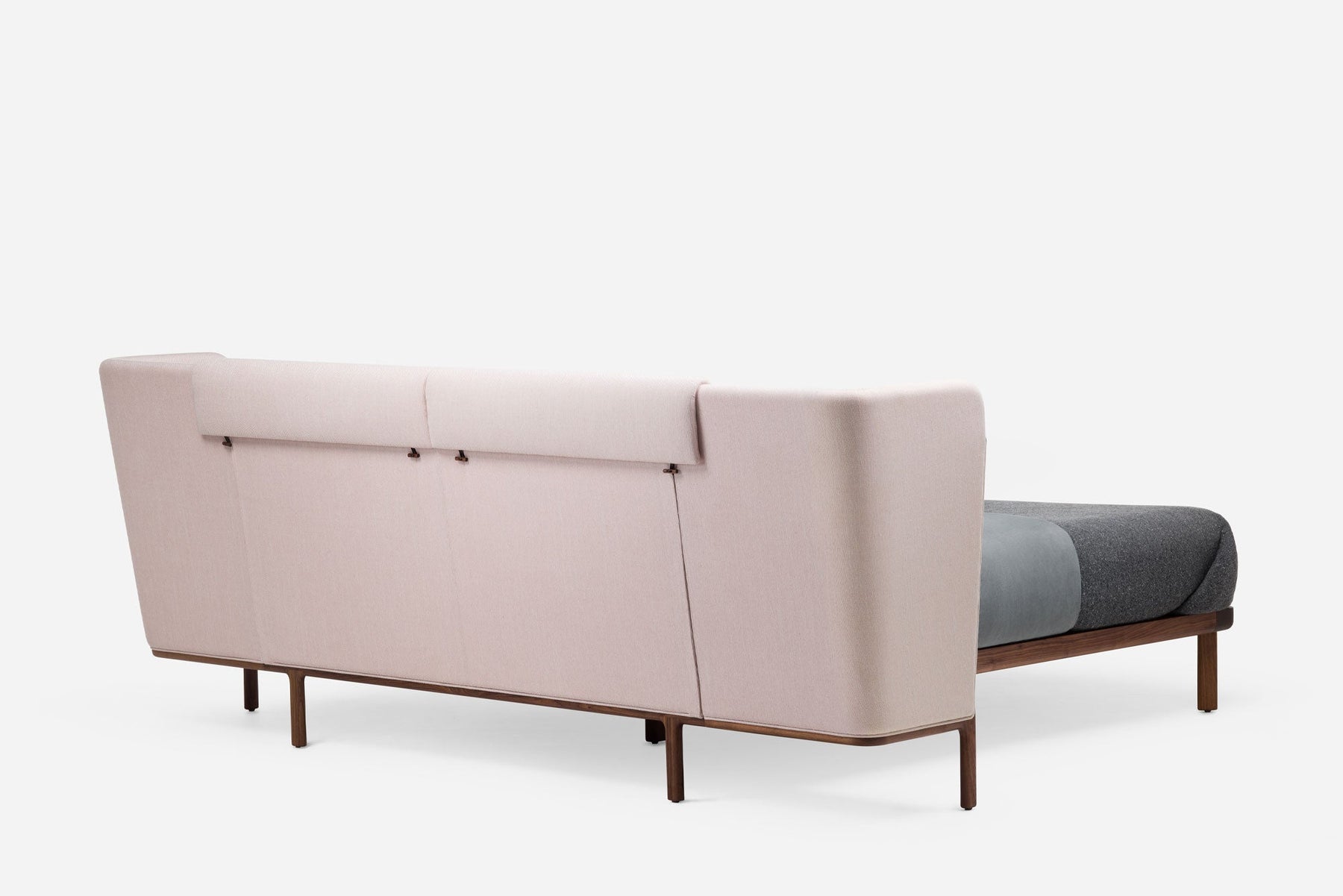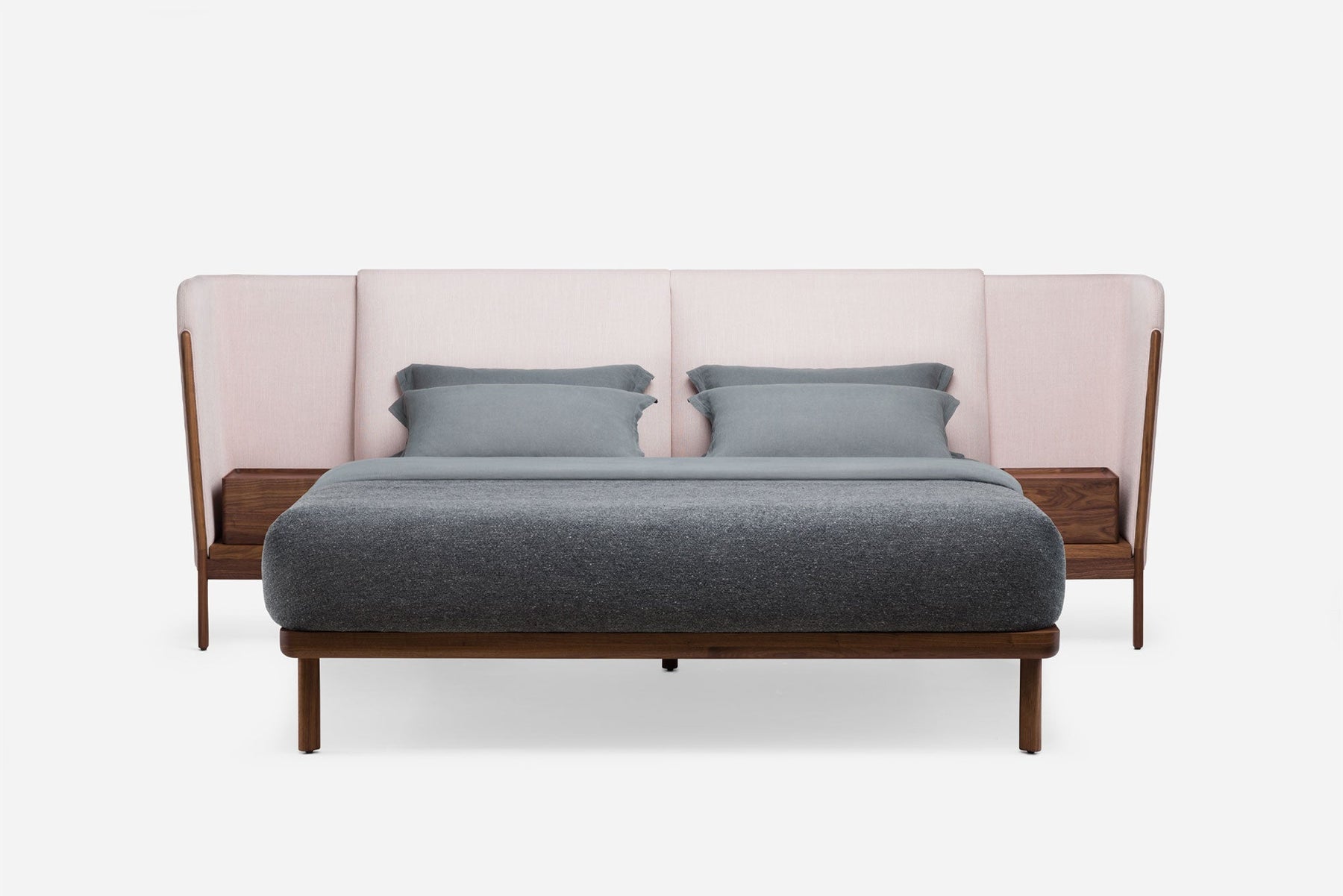 Dubois is a bed system crafted in premium solid hardwood and luxurious fabrics. The wraparound headboard provides a sense of privacy, while the exposed timber frame and generous expanse of upholstery celebrates the quality of materials and craft. Suitable for residential or contract environments, the bed is available with a low or tall headboard, with or without integrated bedside tables.