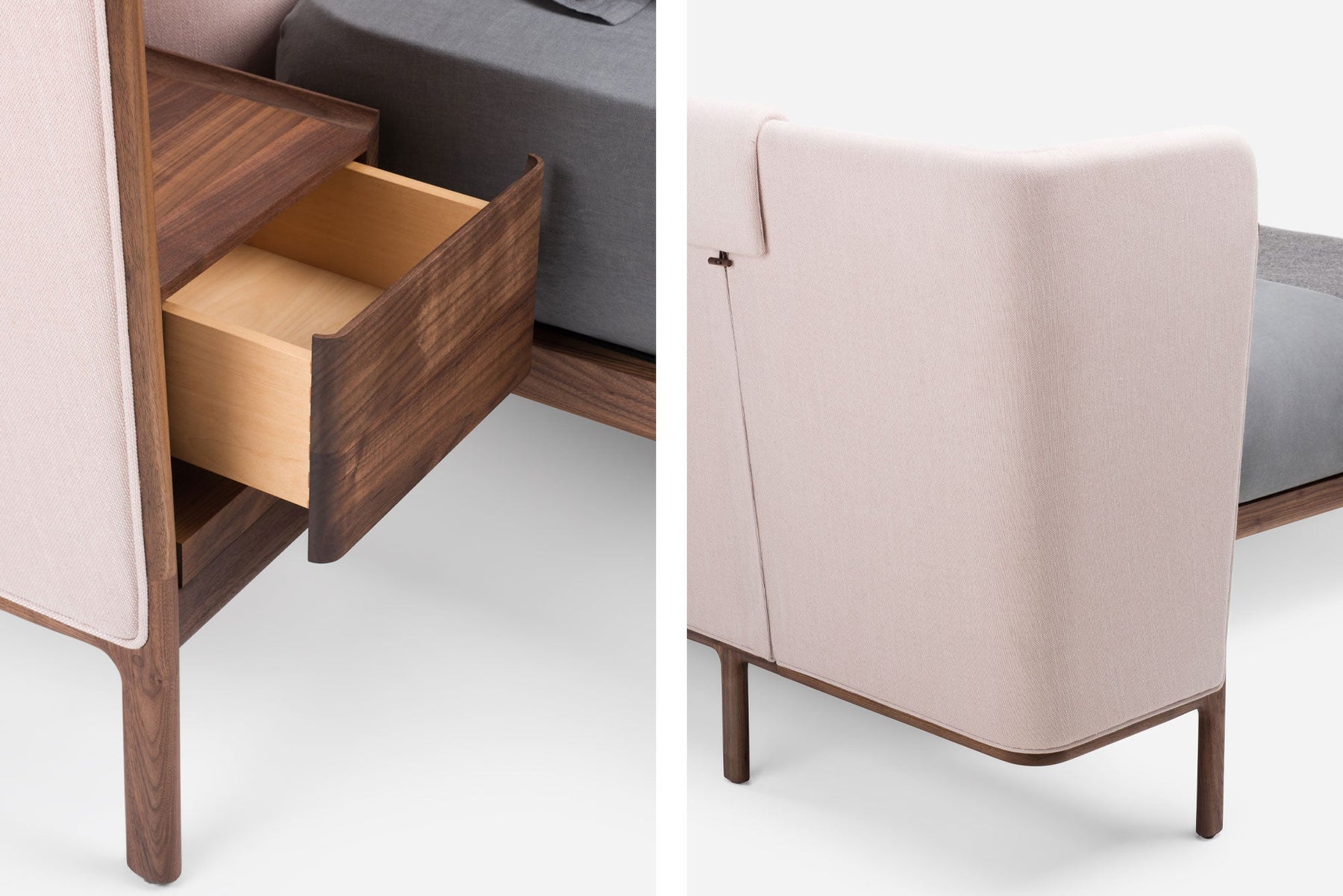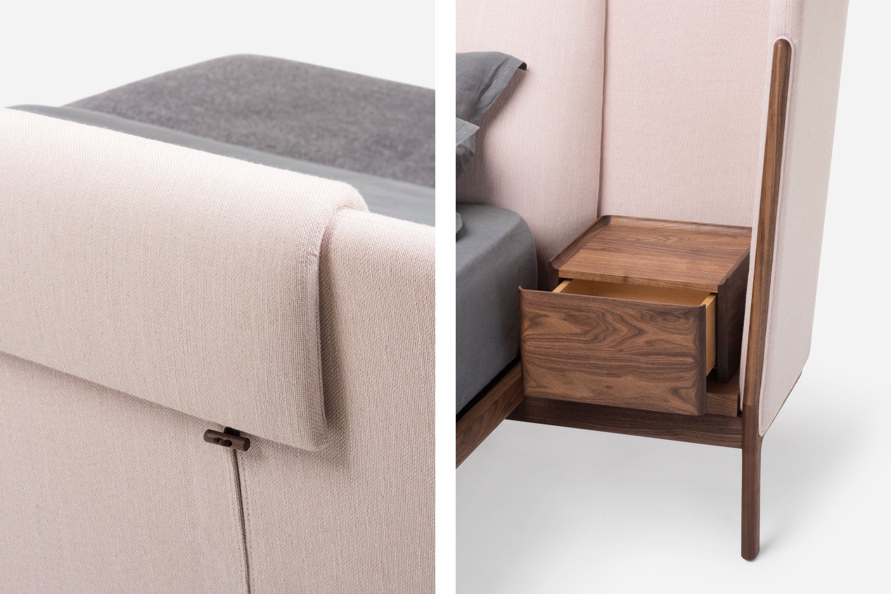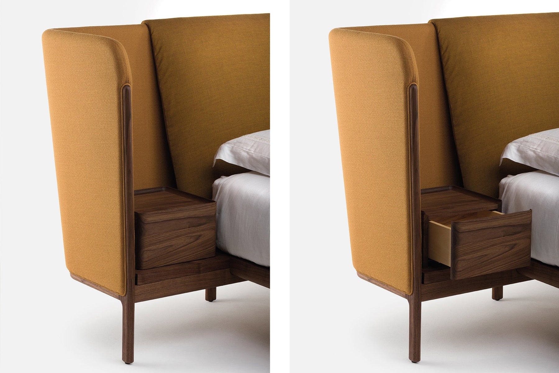 Integrated solid wood bedside tables include deep drawers with interiors made from basswood, a blond timber with outstanding stability in varying climates, ensuring a smooth-running function. Drawers are detailed with dovetail joinery and a soft-close mechanism.
