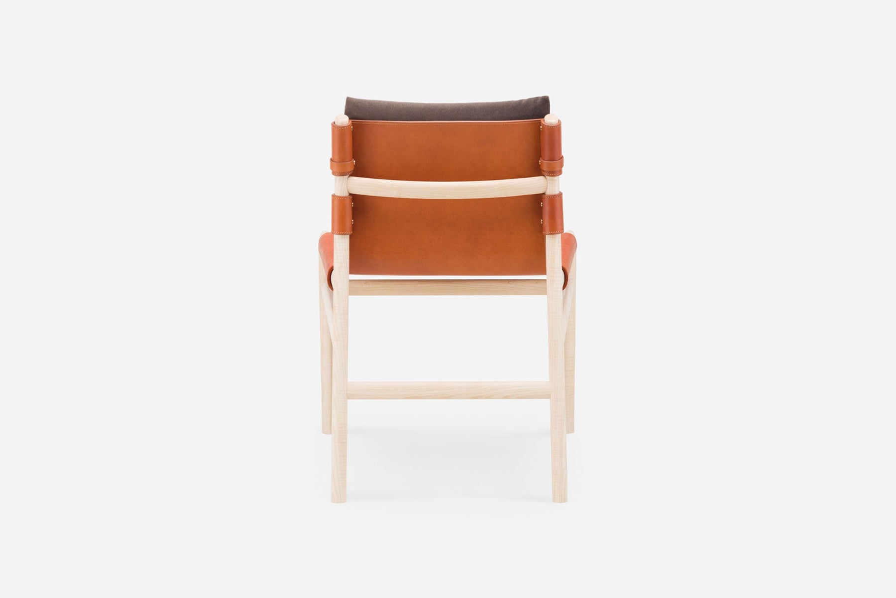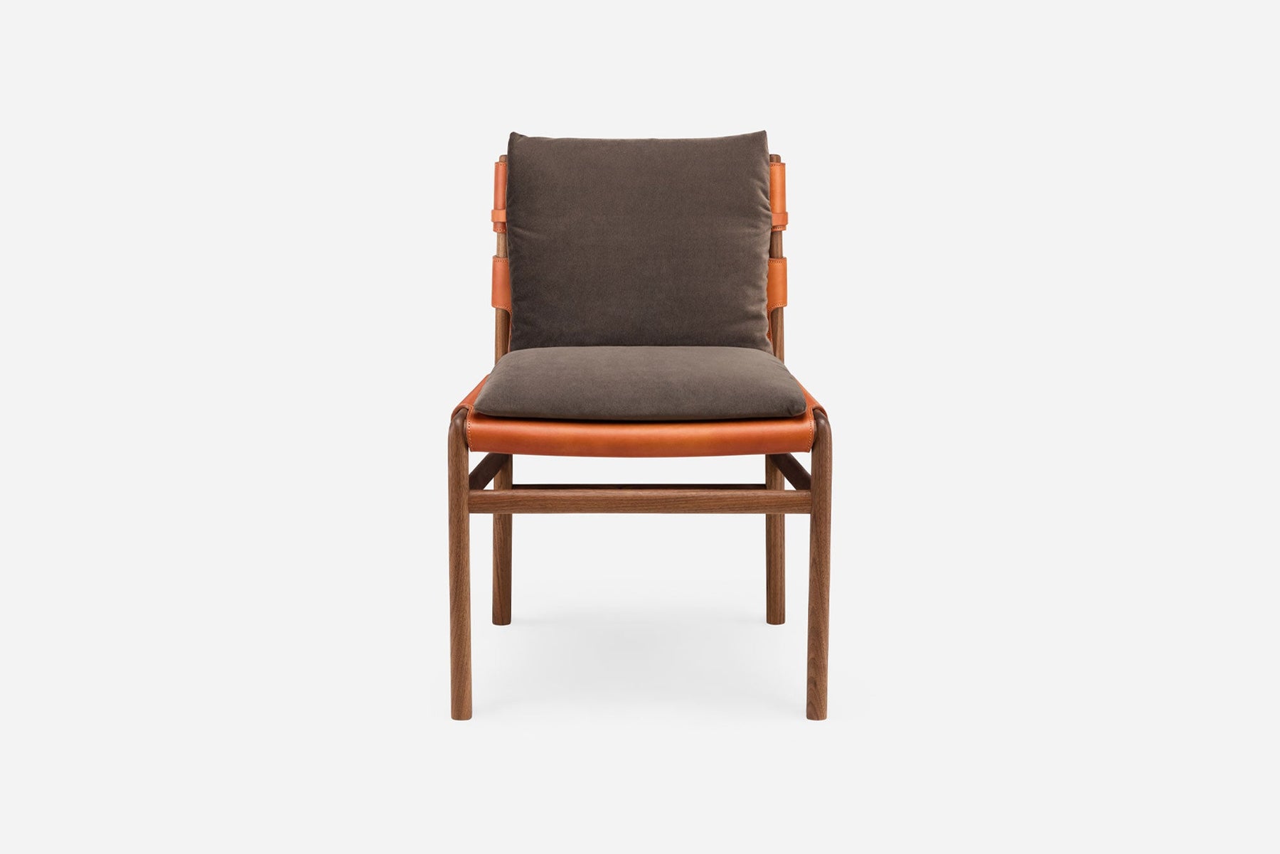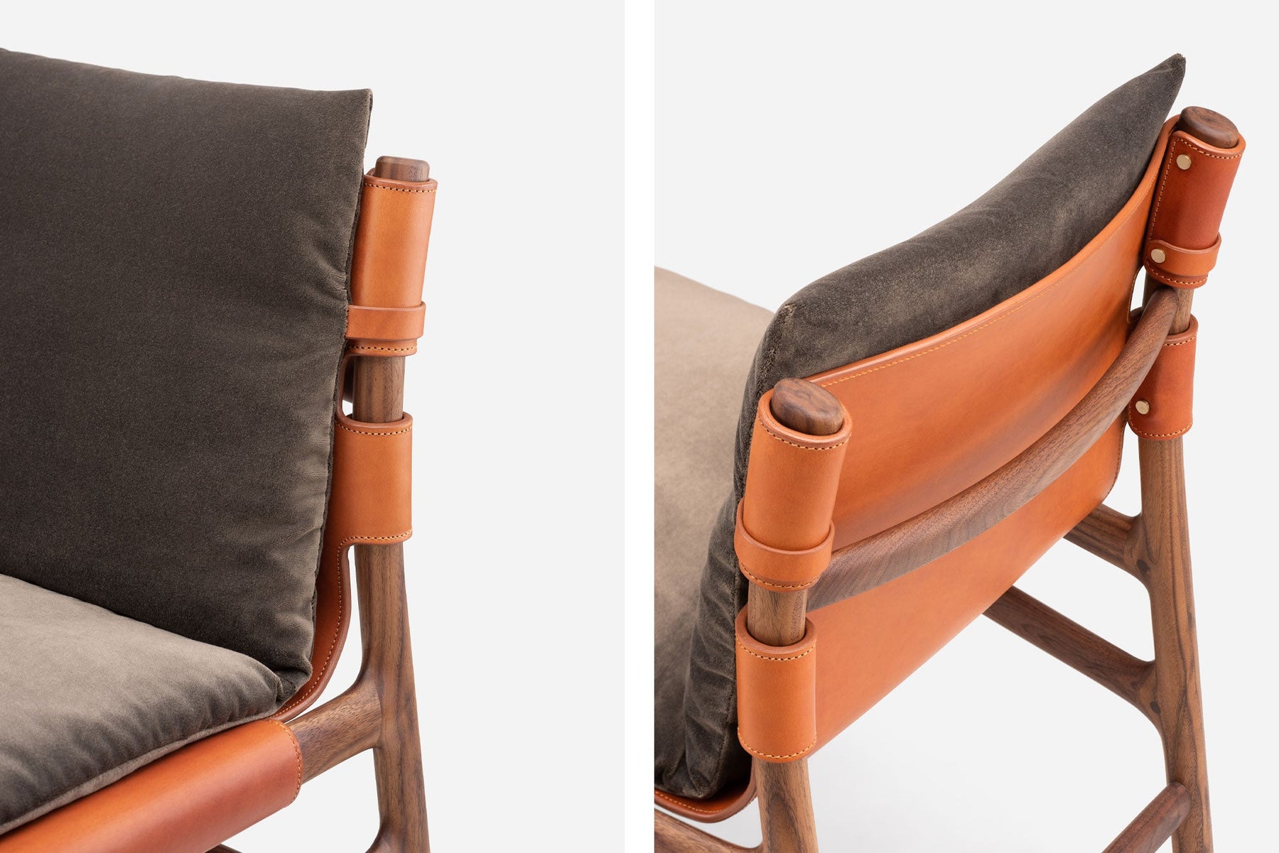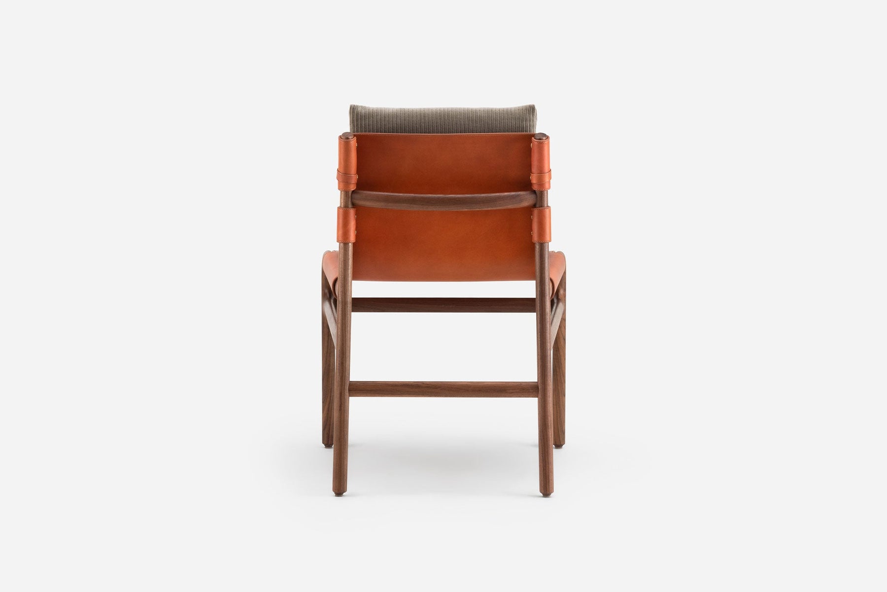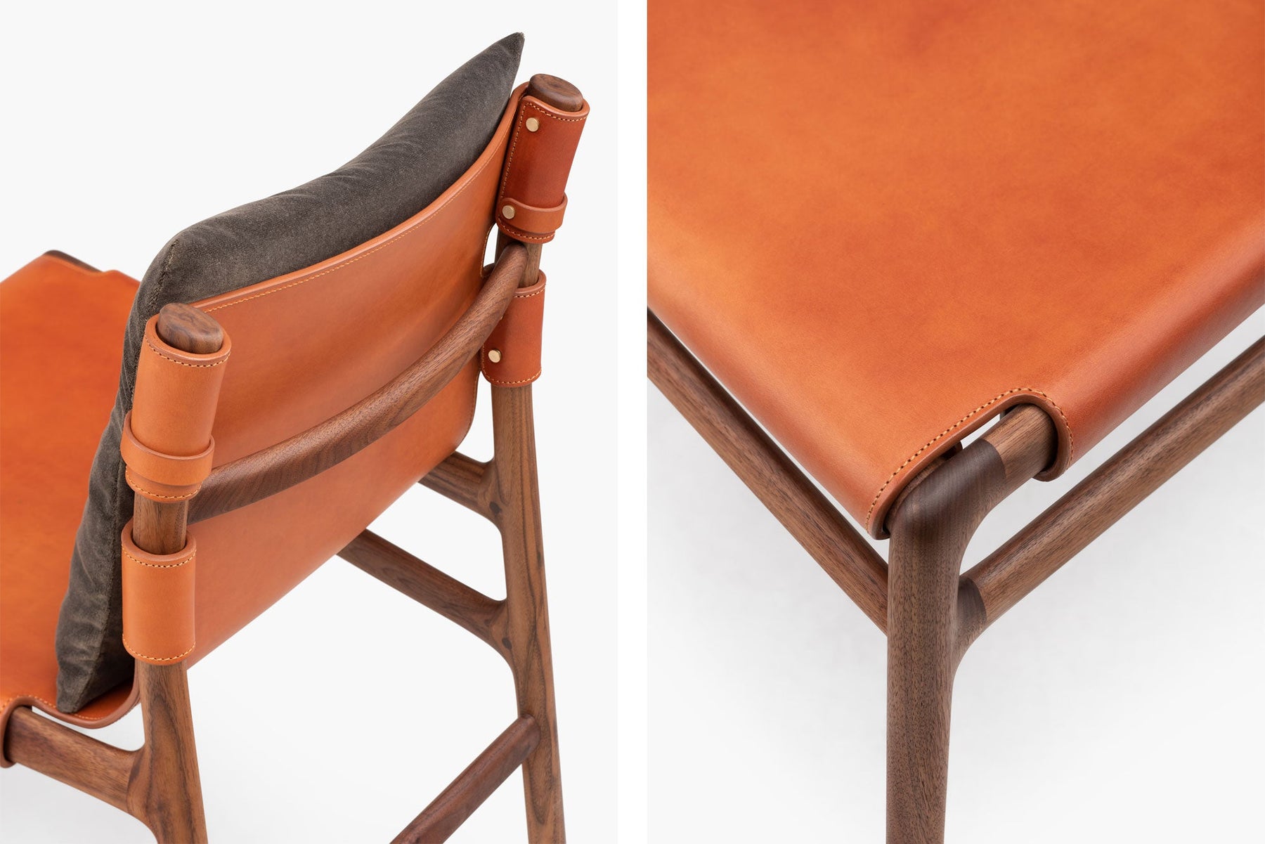 Sela dining chair, designed by Luca Nichetto, reflects a passion for woodworking, with a tactile timber form with beautiful joinery. An exquisite leather seat, custom made by a Portuguese saddler, is suspended from the chair frame, then softened with upholstered cushions. Sela boasts an ageless appearance with a contemporary edge; the perfect blend of natural elements, craftsmanship, and timeless appeal.