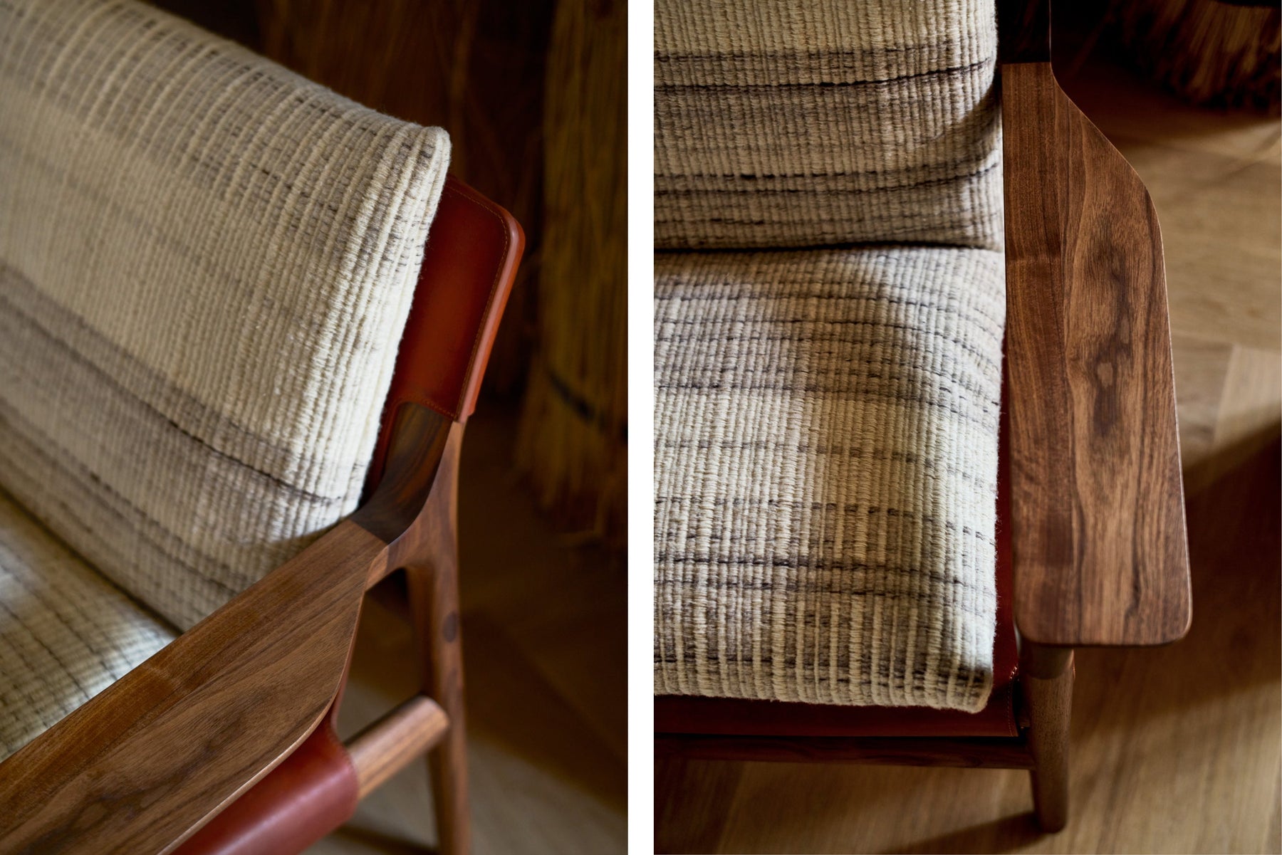 Available in black walnut, white oak, or ash in a range of finishes and saddle leather in a choice of colours. Upholstered in Manta Lido, a hand woven traditional blanket from the Alentejo region of Portugal. See menus below for further material information.