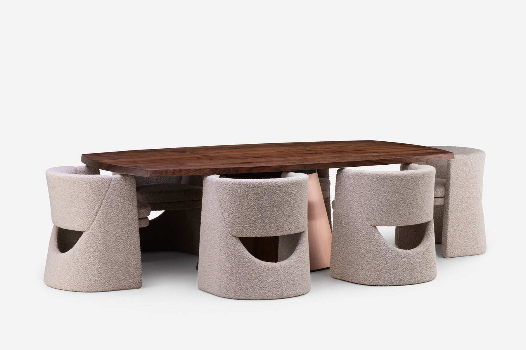 Orion, named after the most recognisable constellation in the night sky, artfully explores the concept of repetition with a central leg made from a series of overlapping solid wood slats forming a semi-oval met by a smooth curve of brass or copper. Expressing contemporary artistry, this table has a sculptural form imbued with the warmth of solid wood, bringing interest and a generous gathering place to any dining room.