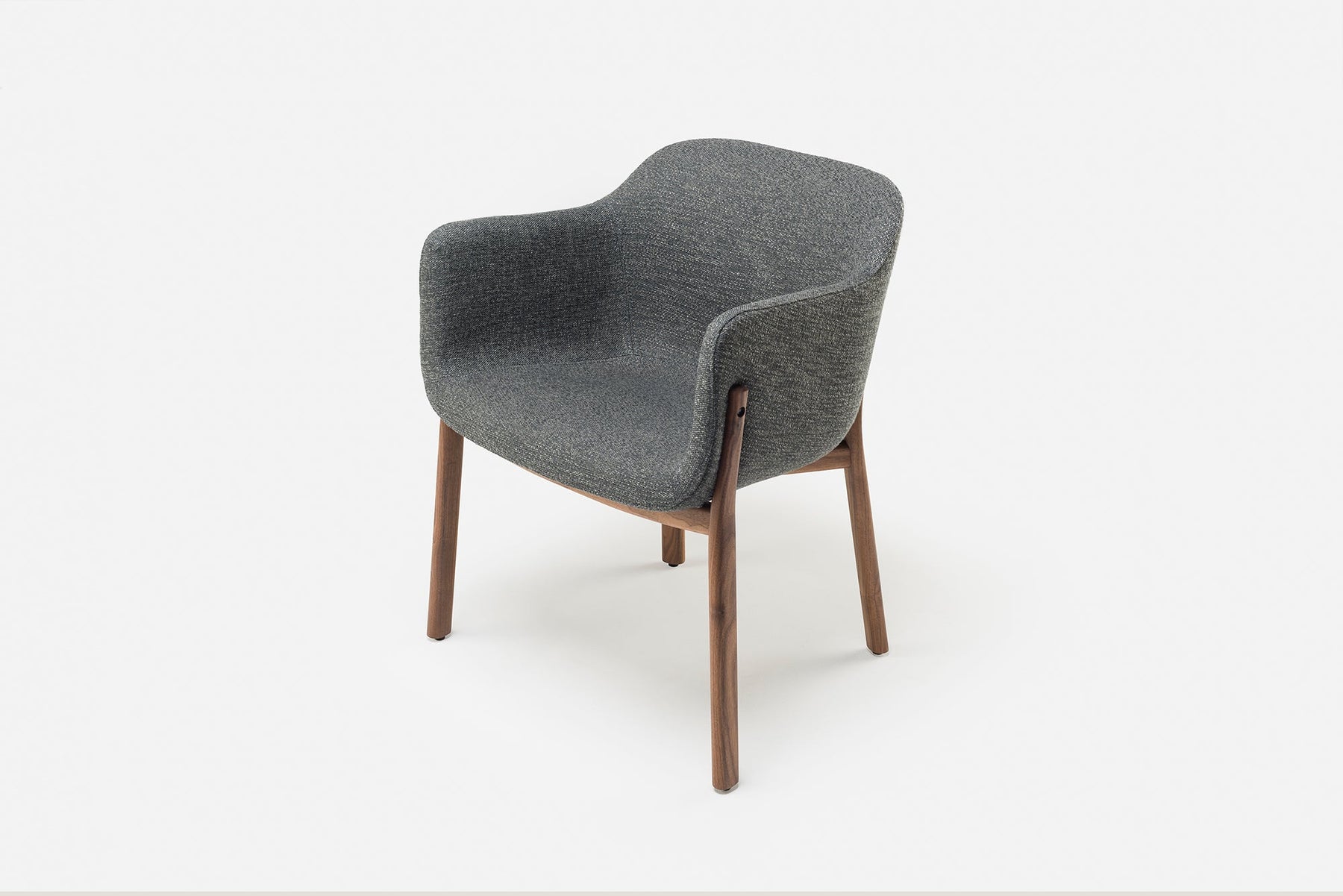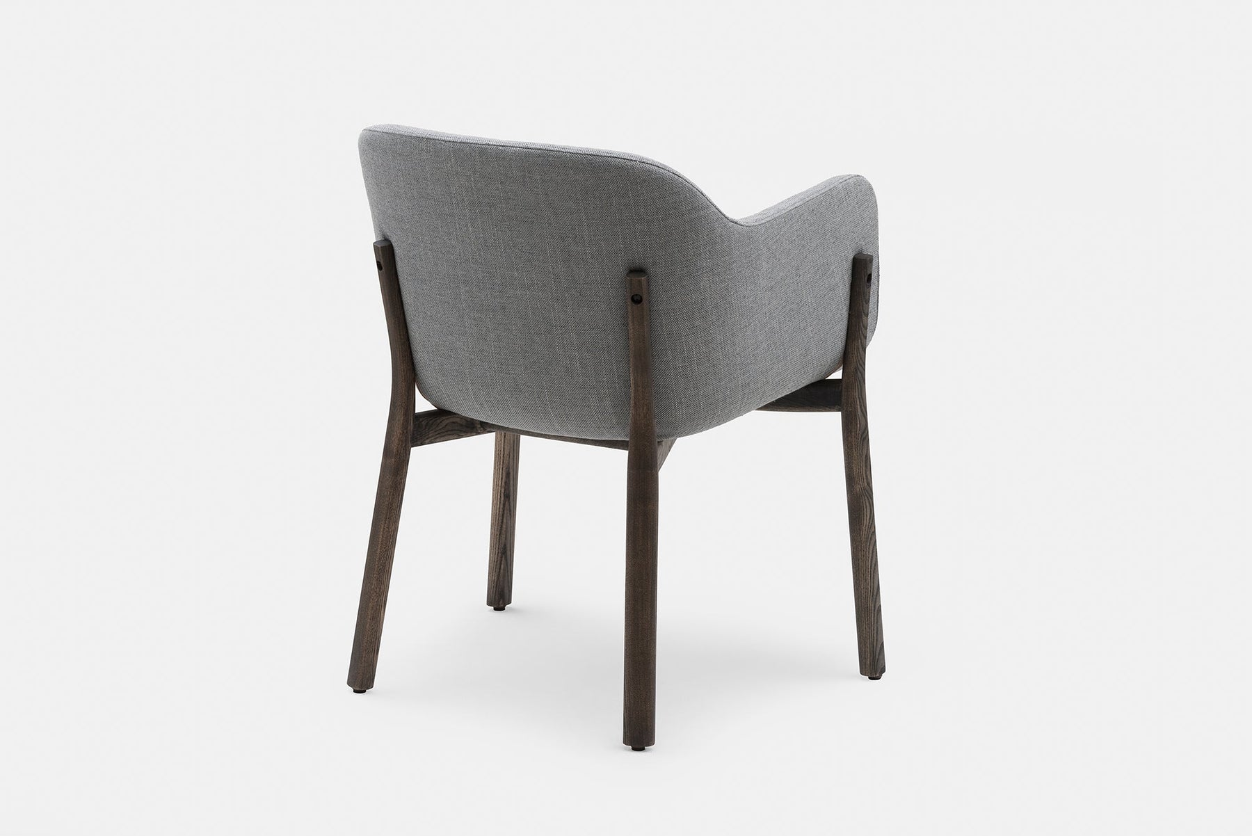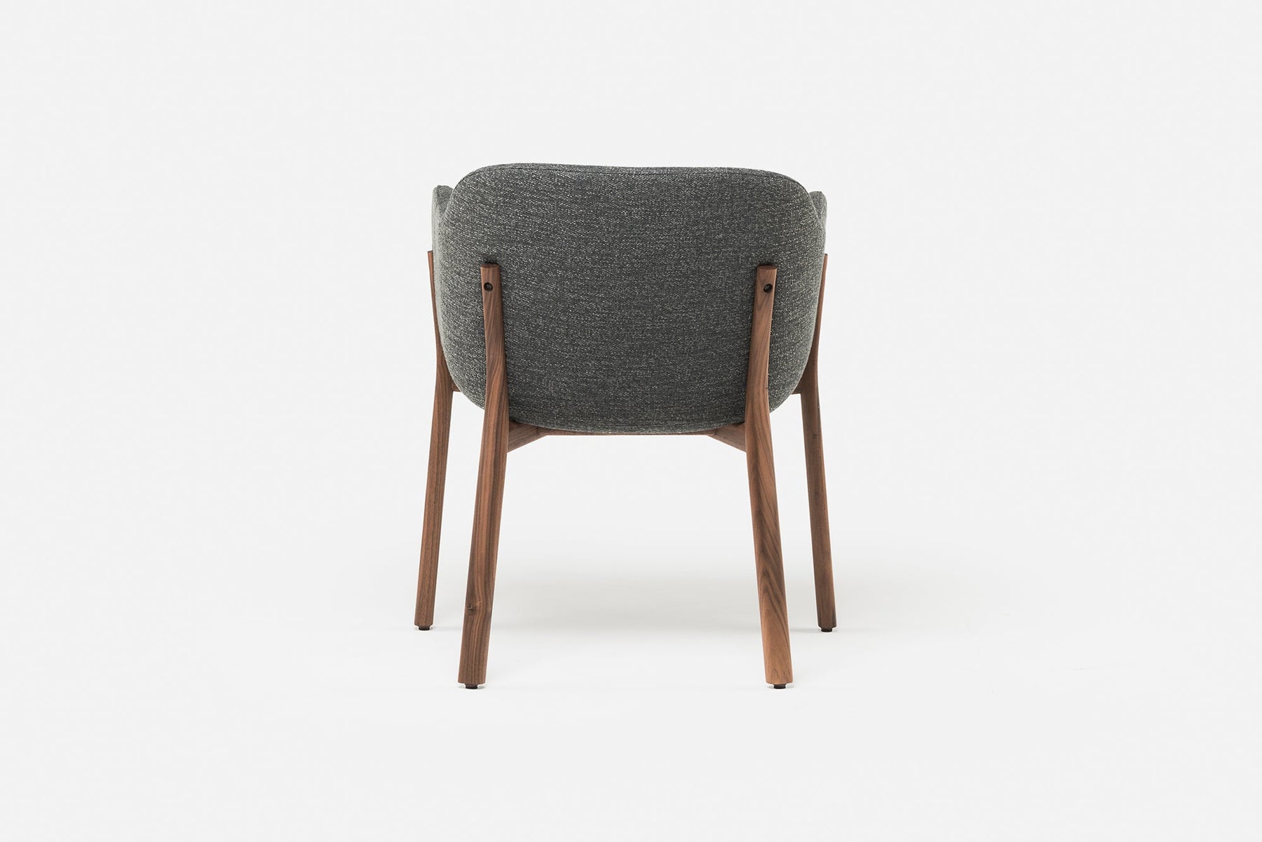 Porto is a comfortable tub dining chair with an exposed timber structure. Elegant and refined, its wraparound form is an expression of support, offering retreat. The slender timber leg frame, joined with mortise and tenon, crosses underneath the seat to visually lighten the form.