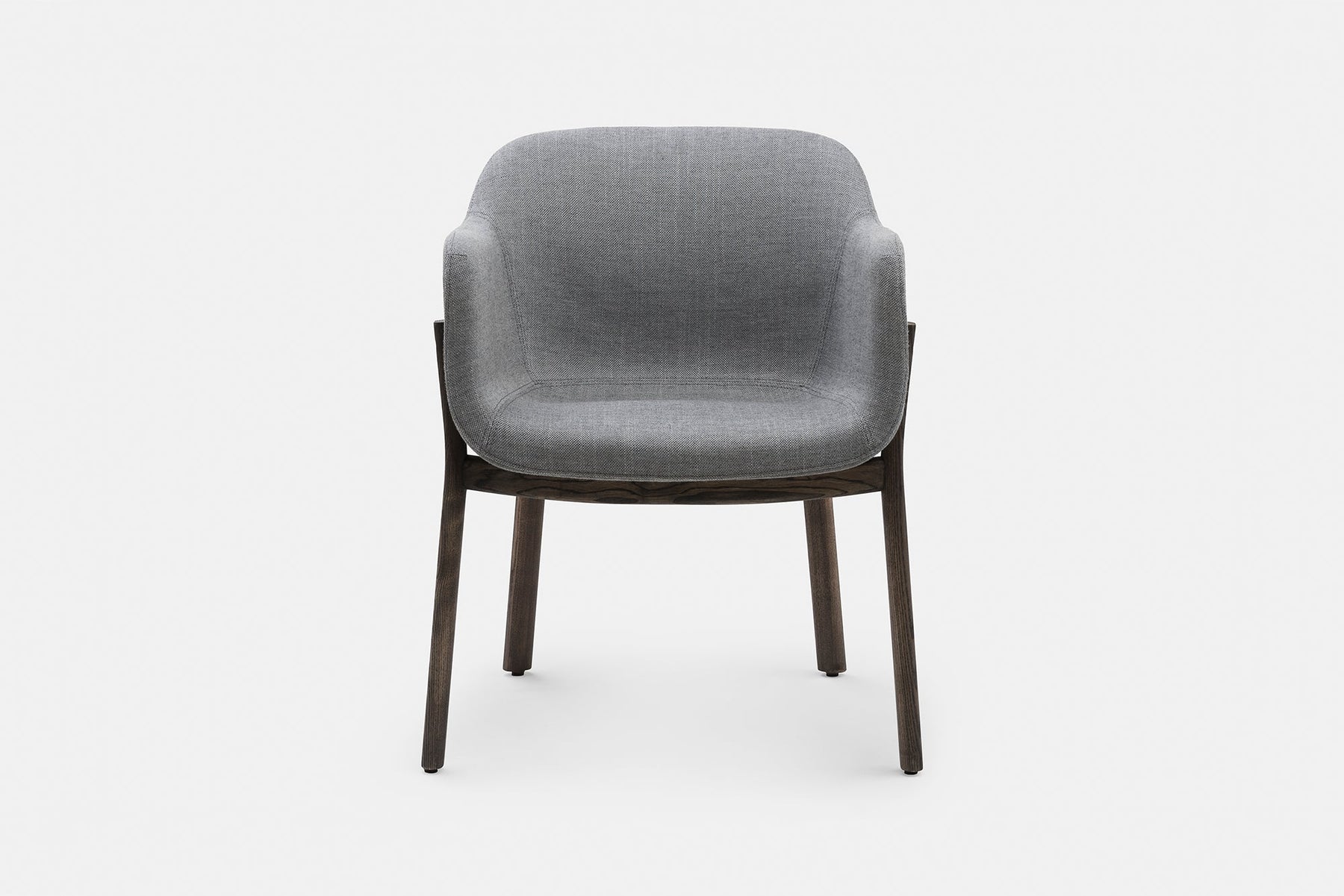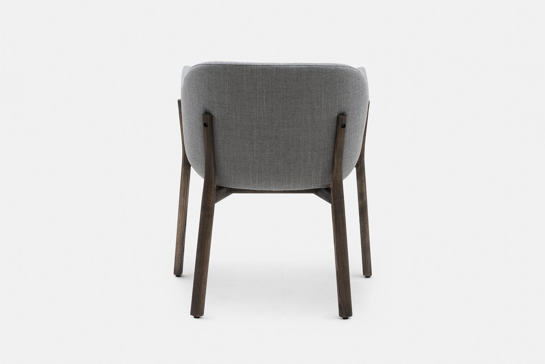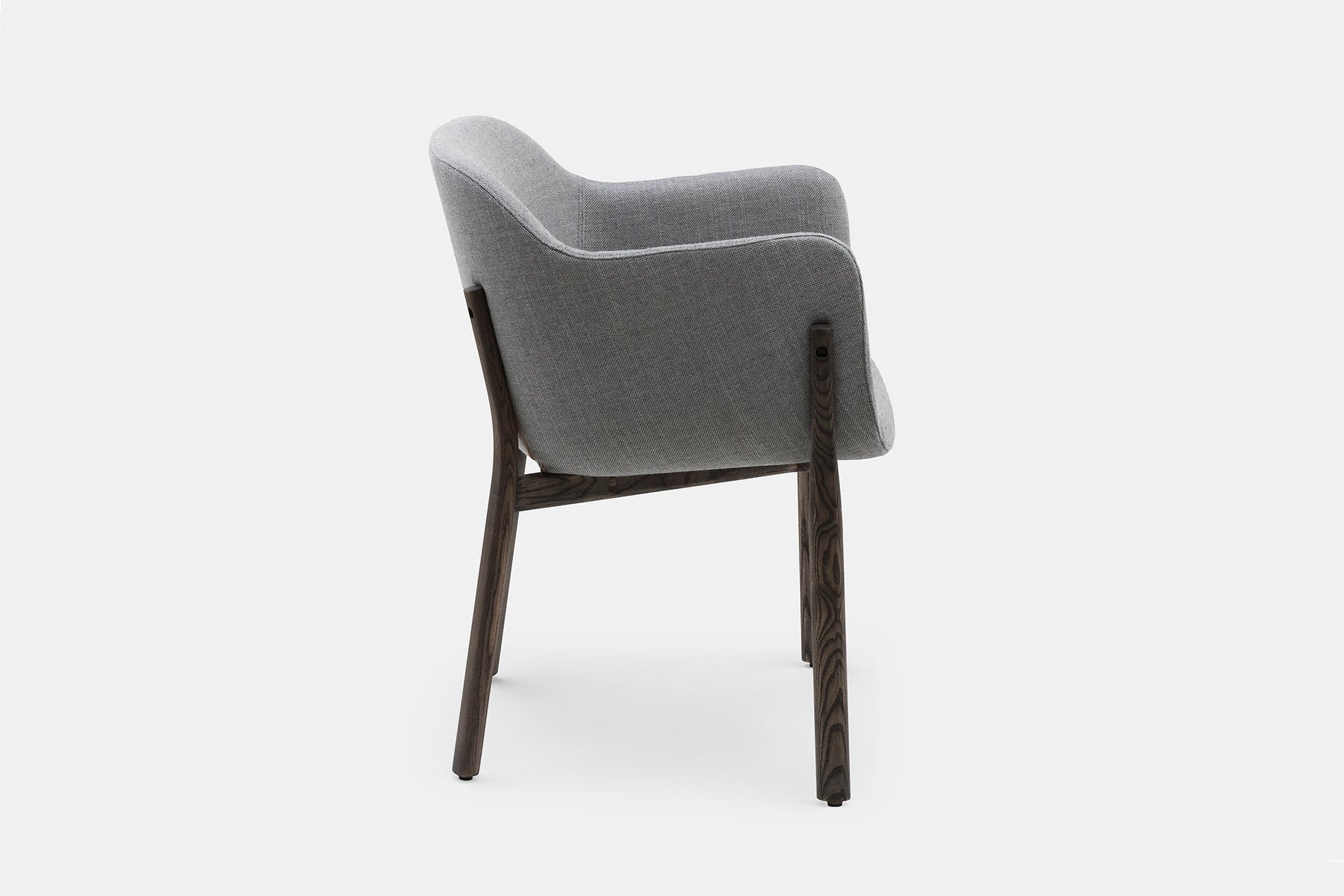 Porto is a comfortable tub dining chair with an exposed timber structure. Elegant and refined, its wraparound form is an expression of support, offering retreat. The slender timber leg frame, joined with mortise and tenon, crosses underneath the seat to visually lighten the form.
