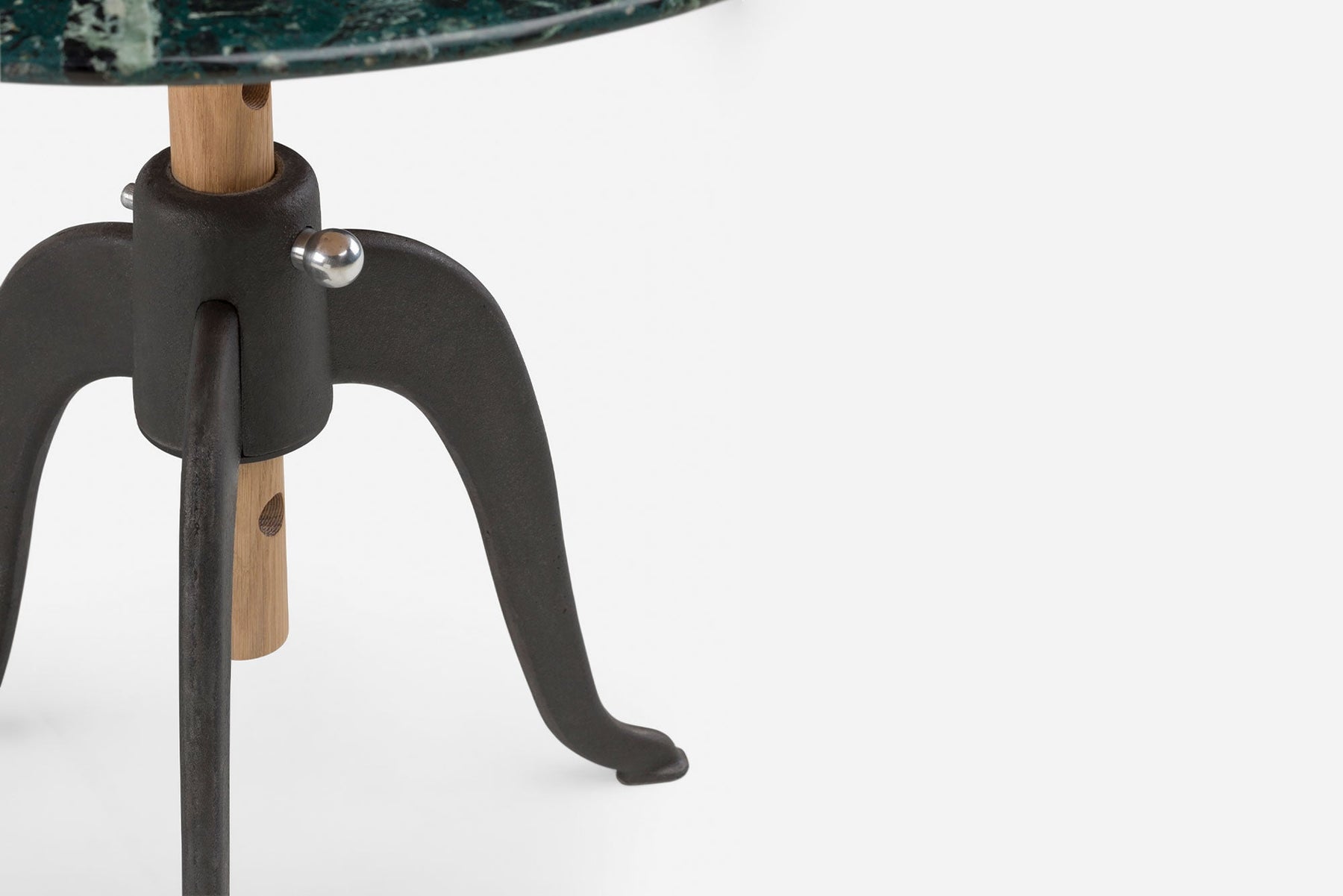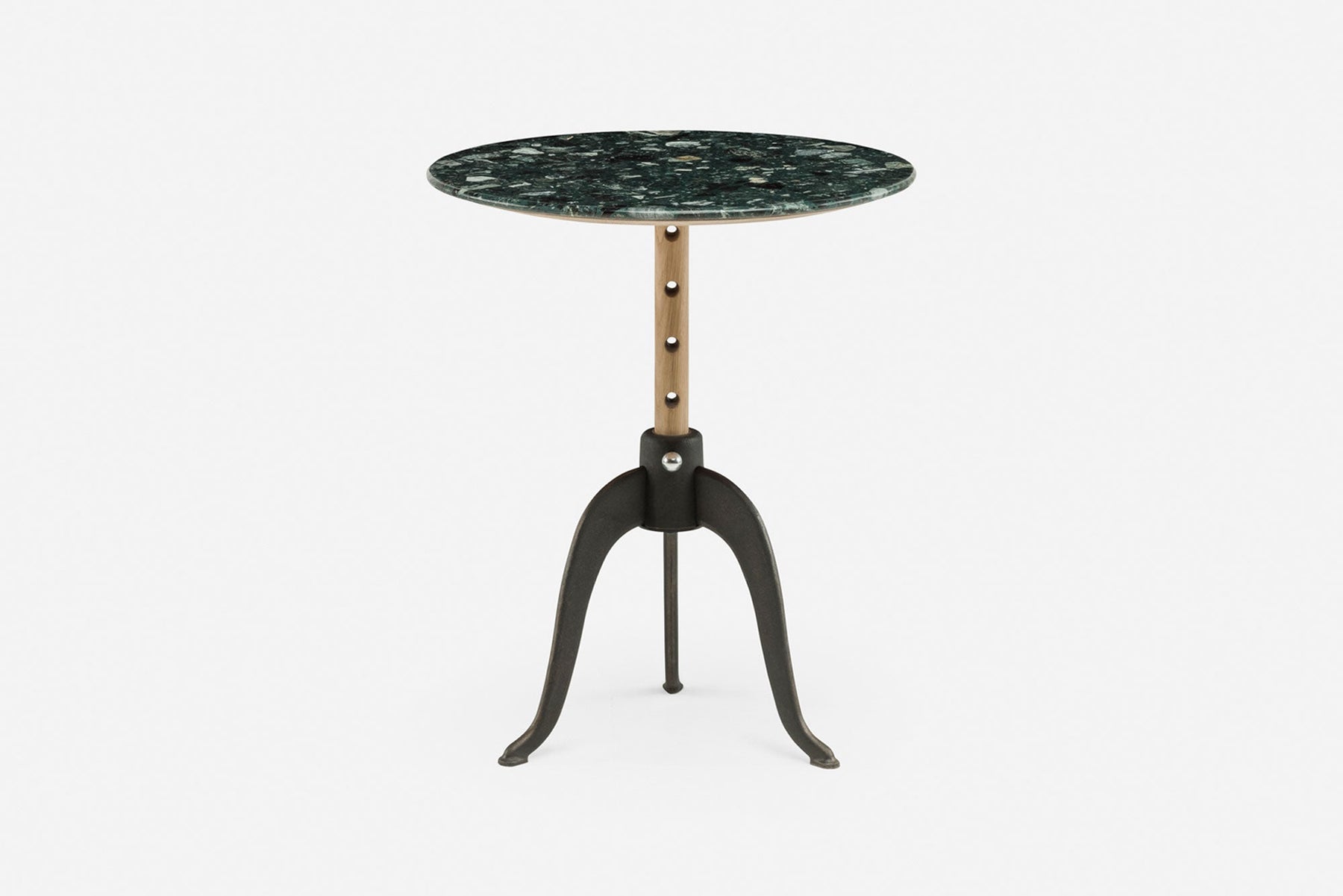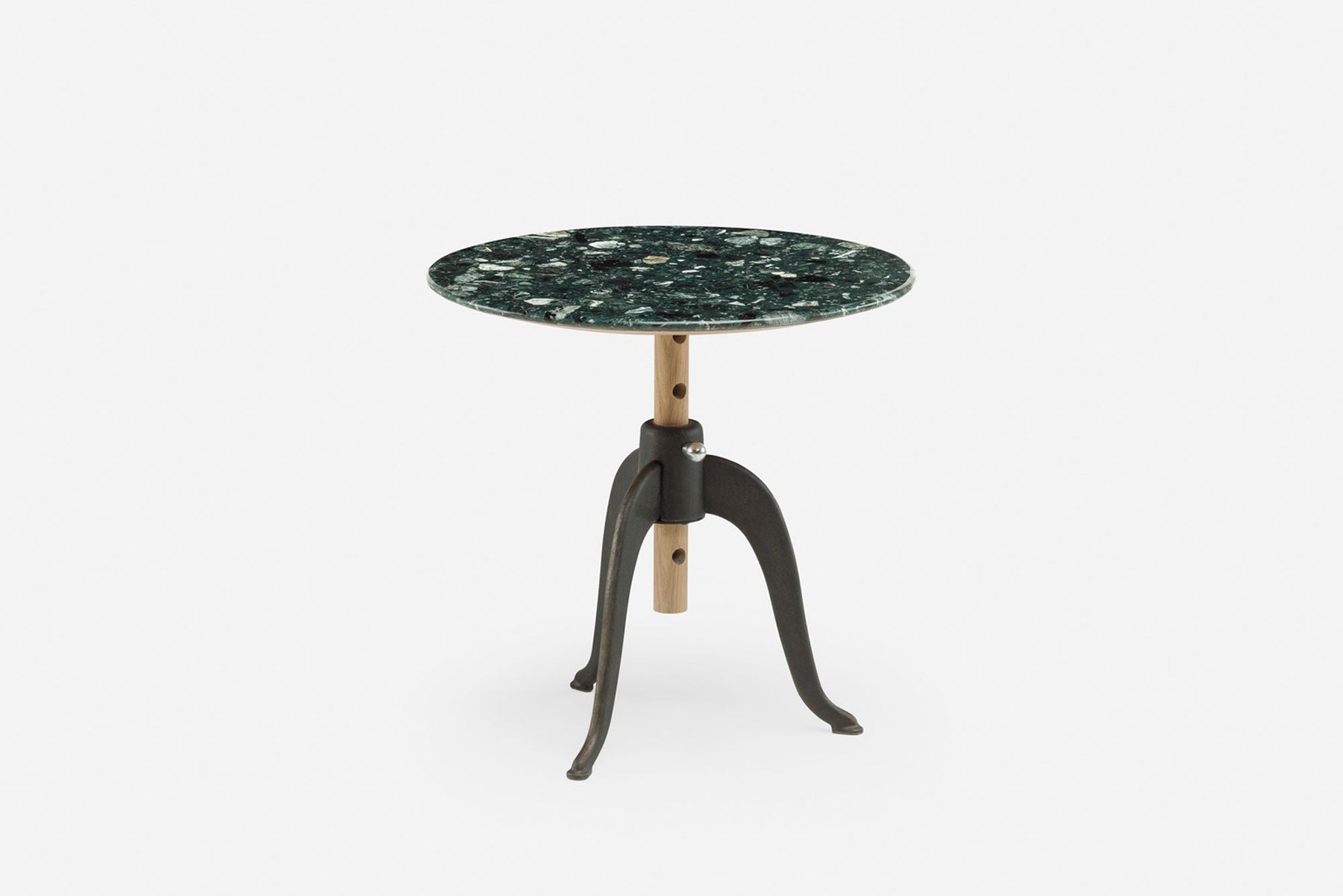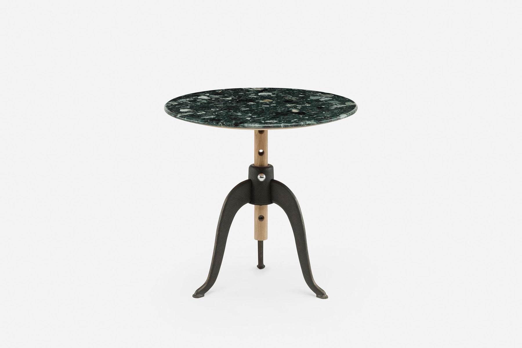 Sidekicks Height Adjustable Table is available with cast iron legs that allow the terrazzo tabletop to be raised to five different heights.