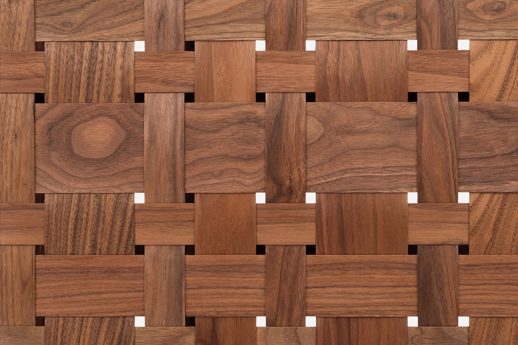 Available in black walnut, white oak, or ash in a range of finishes, ceramic, and a choice of panel options including woven timber, limited edition Flores Textile Linen, or COM, subject to approval. See menus below for further material information.