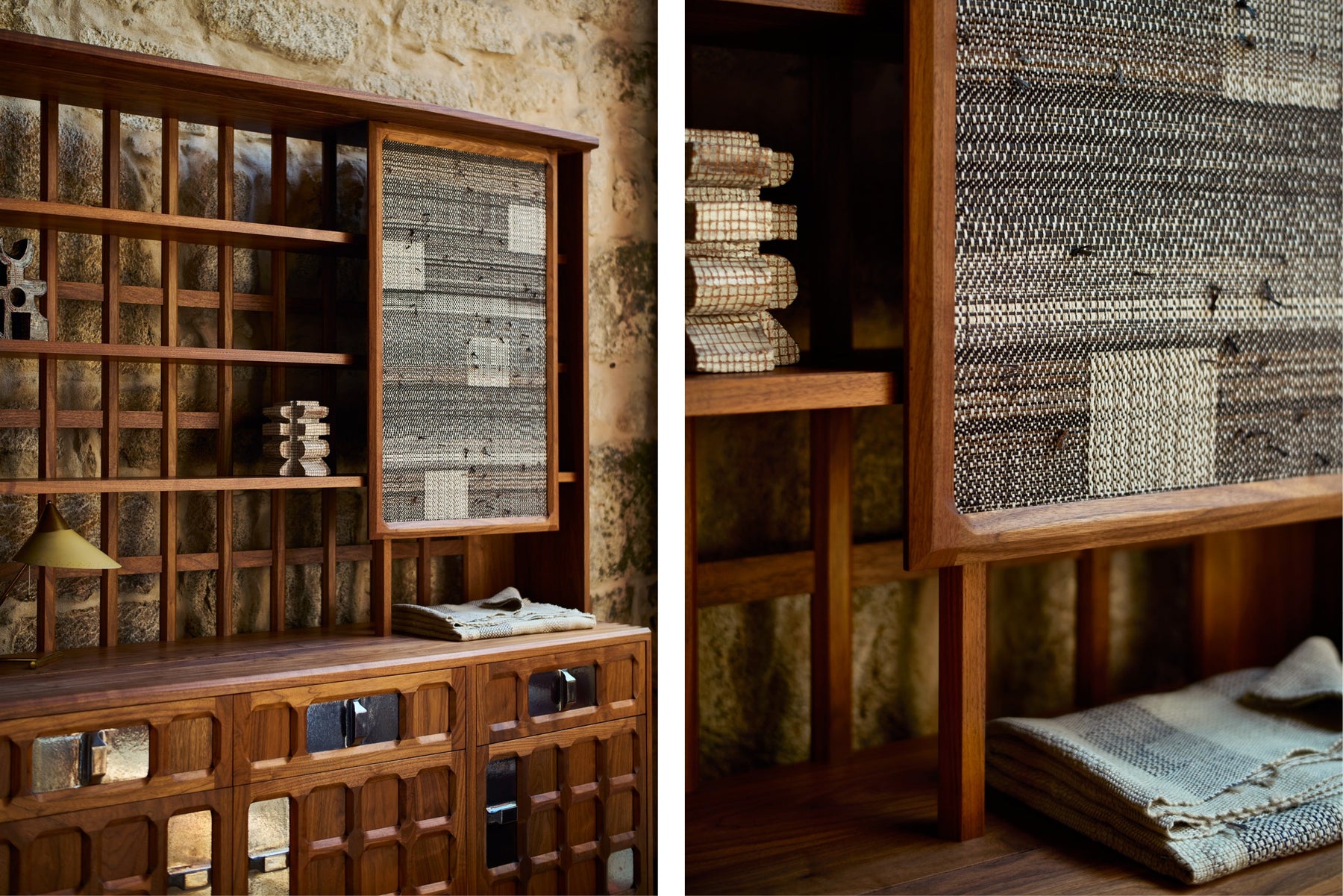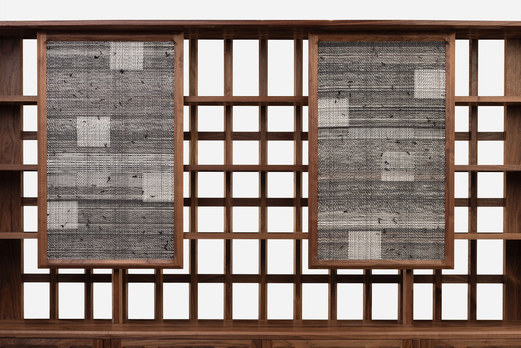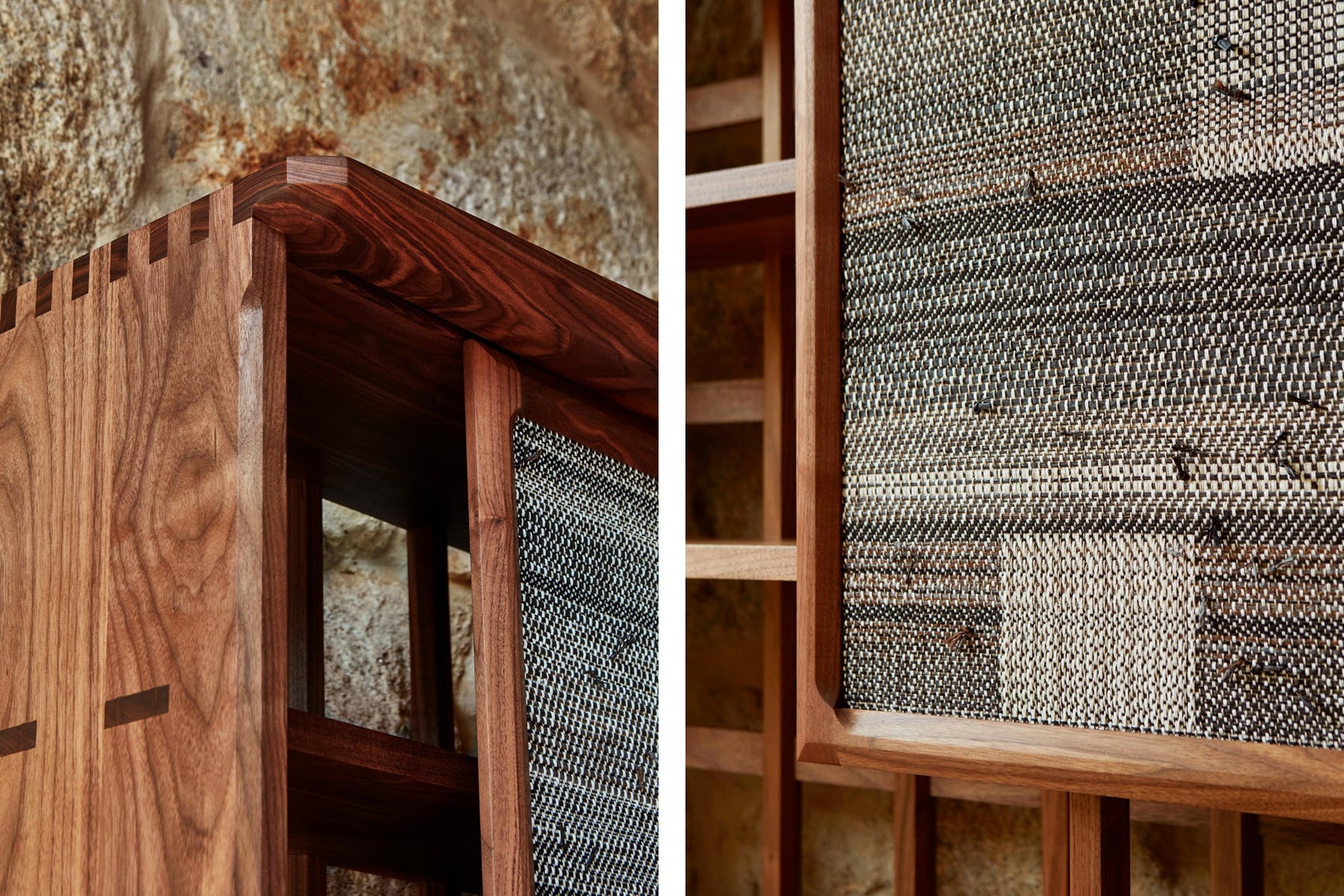 This special edition cabinet is available in Danish oiled walnut, grey ceramic, and single-edition textile art panels hand woven in London by textile artist Catarina Riccabona. See menus below for further material information.