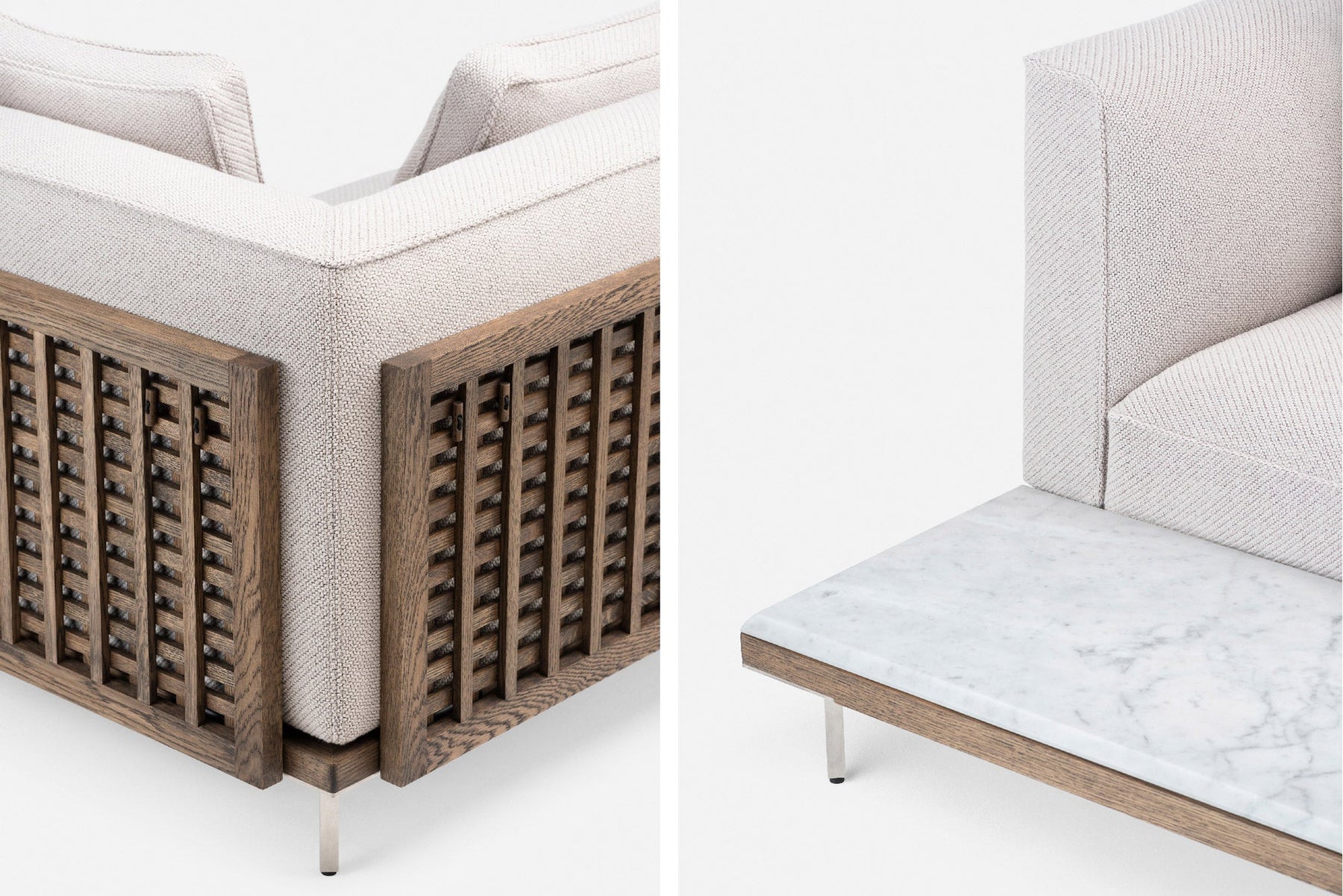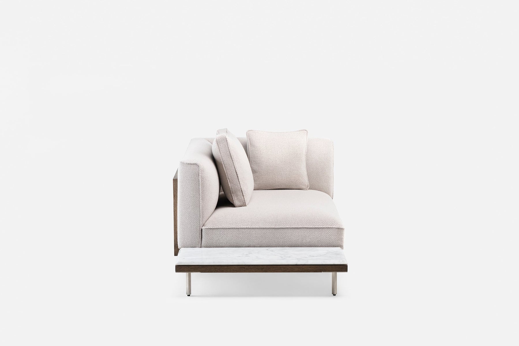 Available in black walnut, white oak, or ash in a range of finishes, a range of fabric and leather options, and brass or stainless steel feet. Table modules available in timber or a choice of stone options including Rosa Negrais, Black Marquina, or Carrara marble; or Ataija Creme limestone. See menus below for further material information.